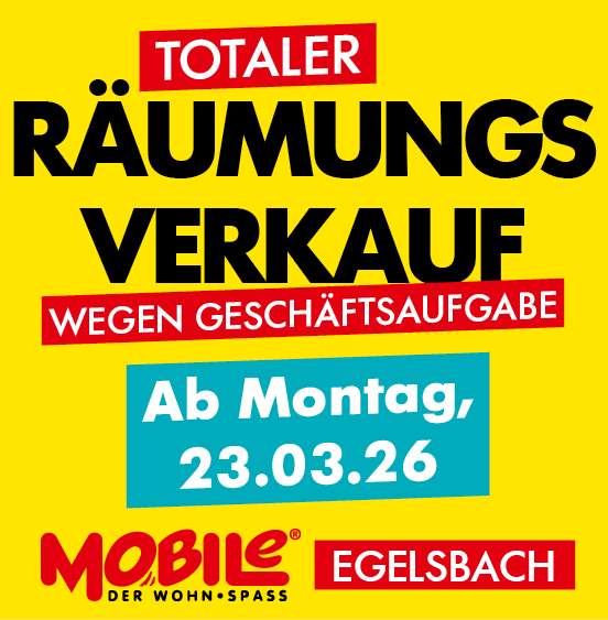 Wegen Geschäftsaufgabe startet ab 23.03.2026 startet unser großer Räumungsverkauf in Egelsbach mit unschlagbaren Preisen auf alle Ausstellungsstücke und Lagerbestände!