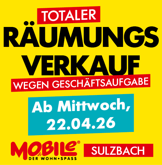 Wegen Geschäftsaufgabe startet ab 22.04.2026 unser großer Räumungsverkauf in Sulzbach mit unschlagbaren Preisen auf alle Ausstellungsstücke und Lagerbestände!