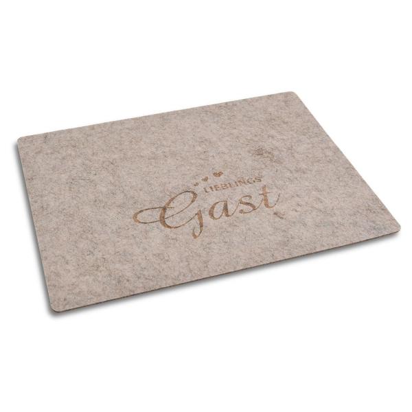 Das Tisch-Set LIEBLINGSGAST ist in der Farbe Beige gehalten und hat eine Länge von 45 cm sowie eine Breite von 35 cm. Es besteht aus Filz und ist mit der Aufschrift „LIEBLINGSGast“ versehen. Das Tisch-Set ist vielseitig einsetzbar.