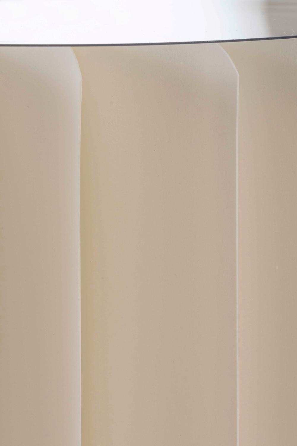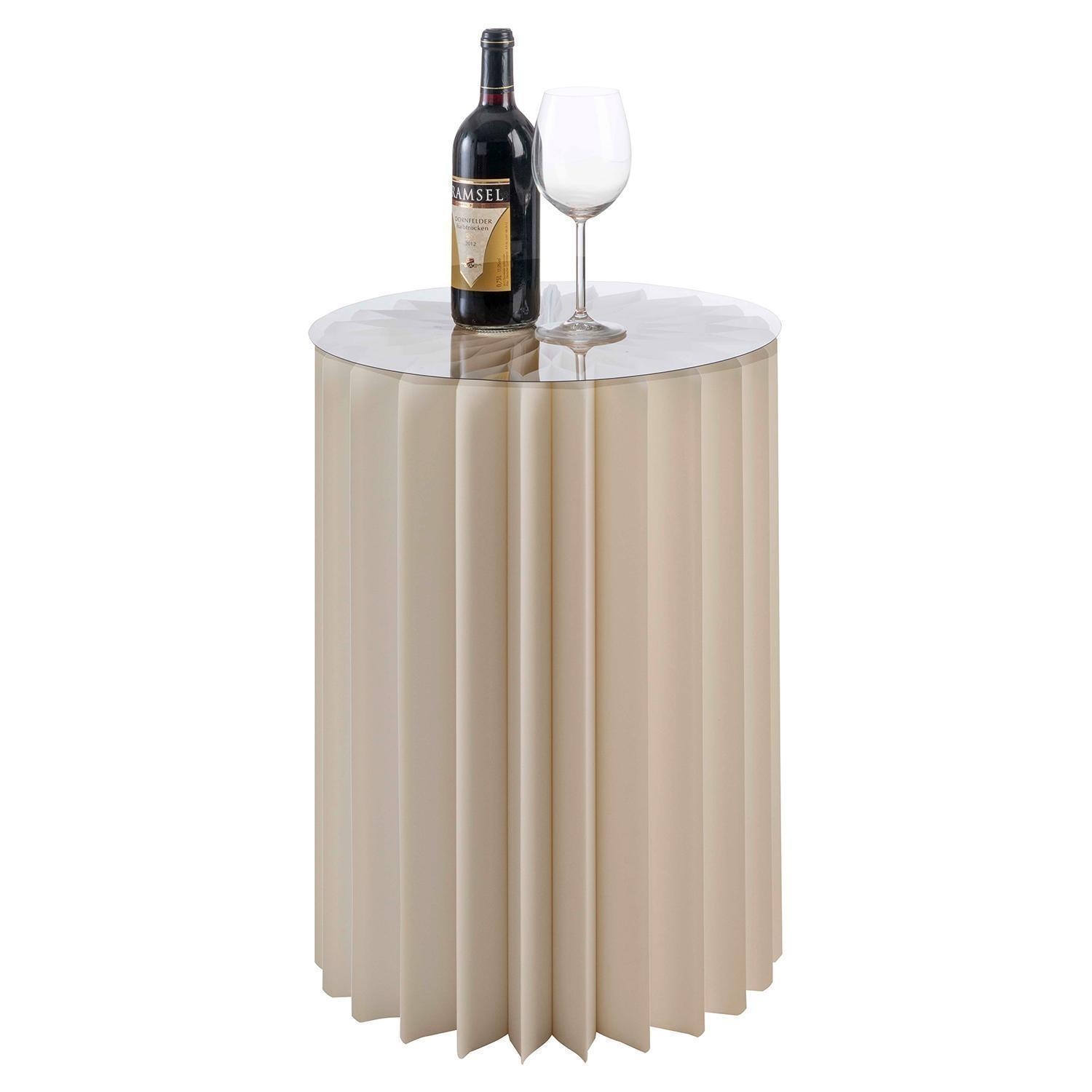 Der faltbare Beistelltisch FOLD besteht aus cremefarbenem Papier. Als Ablagefläche besitzt der Loungetisch eine Tischplatte aus transparentem Glas, die als Ablagefläche dient. Der Tisch hat einen Durchmesser von 40 cm sowie eine Höhe von 60 cm und eignet sich für den Einsatz im Flur, Ess- oder Wohnzimmer. Die maximale Traglast beträgt 65 kg.
