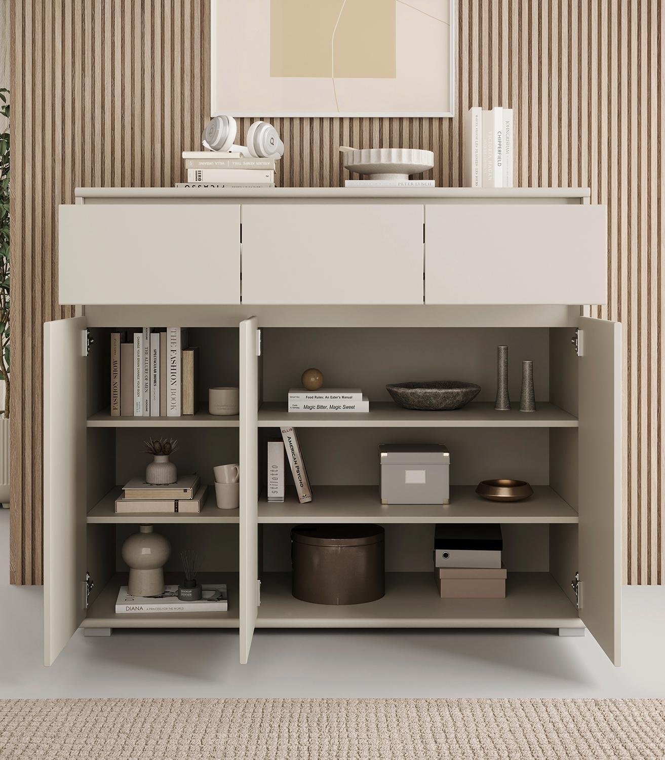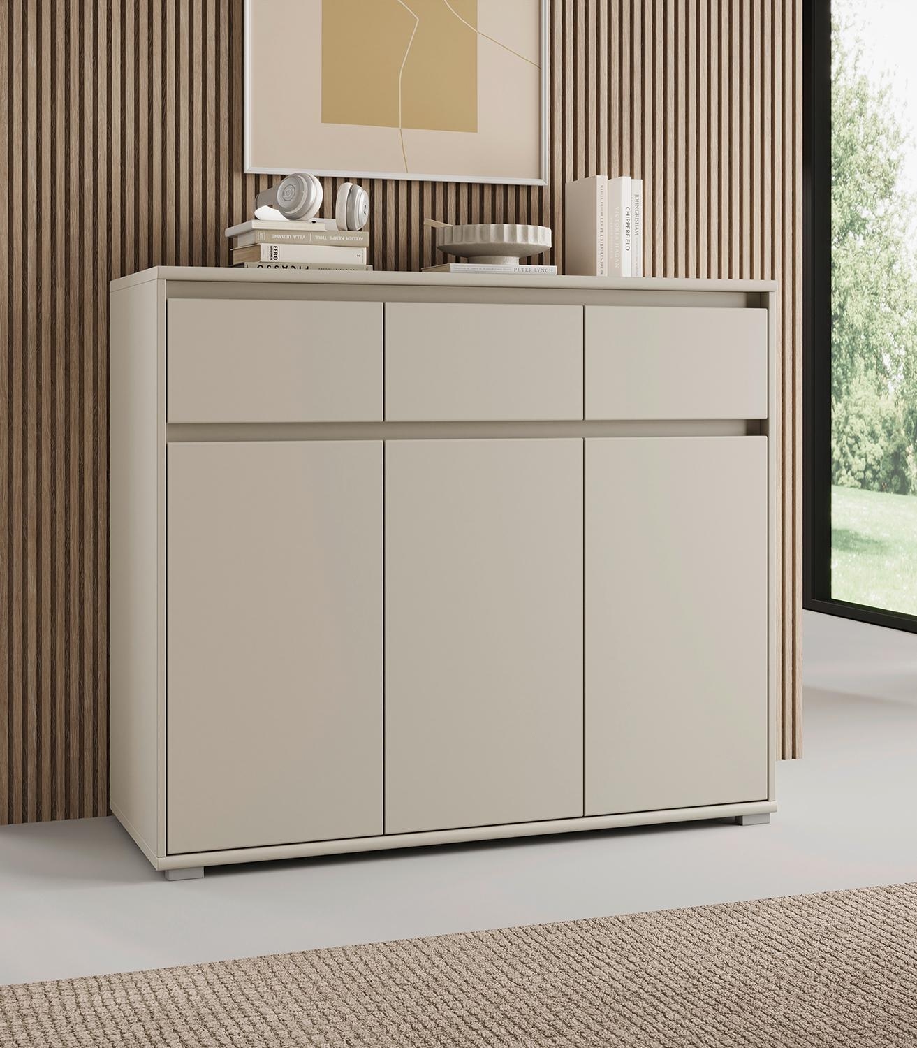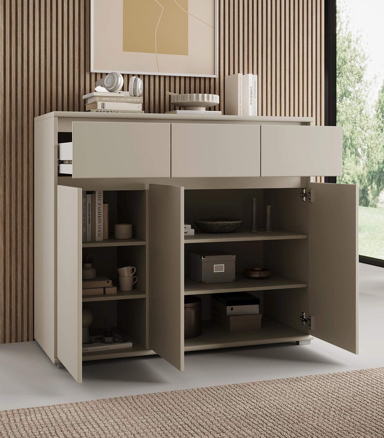 Die Kommode IDOLA ist in Cashmerebraun matt gehalten und zeichnet sich durch ein griffloses Design aus. Als Anrichte verfügt sie über drei Türen und drei Schubladen. Im Inneren stehen vier Einlegeböden zur Verfügung. Die Breite beträgt 118 cm, die Höhe 103 cm und die Tiefe 48 cm.