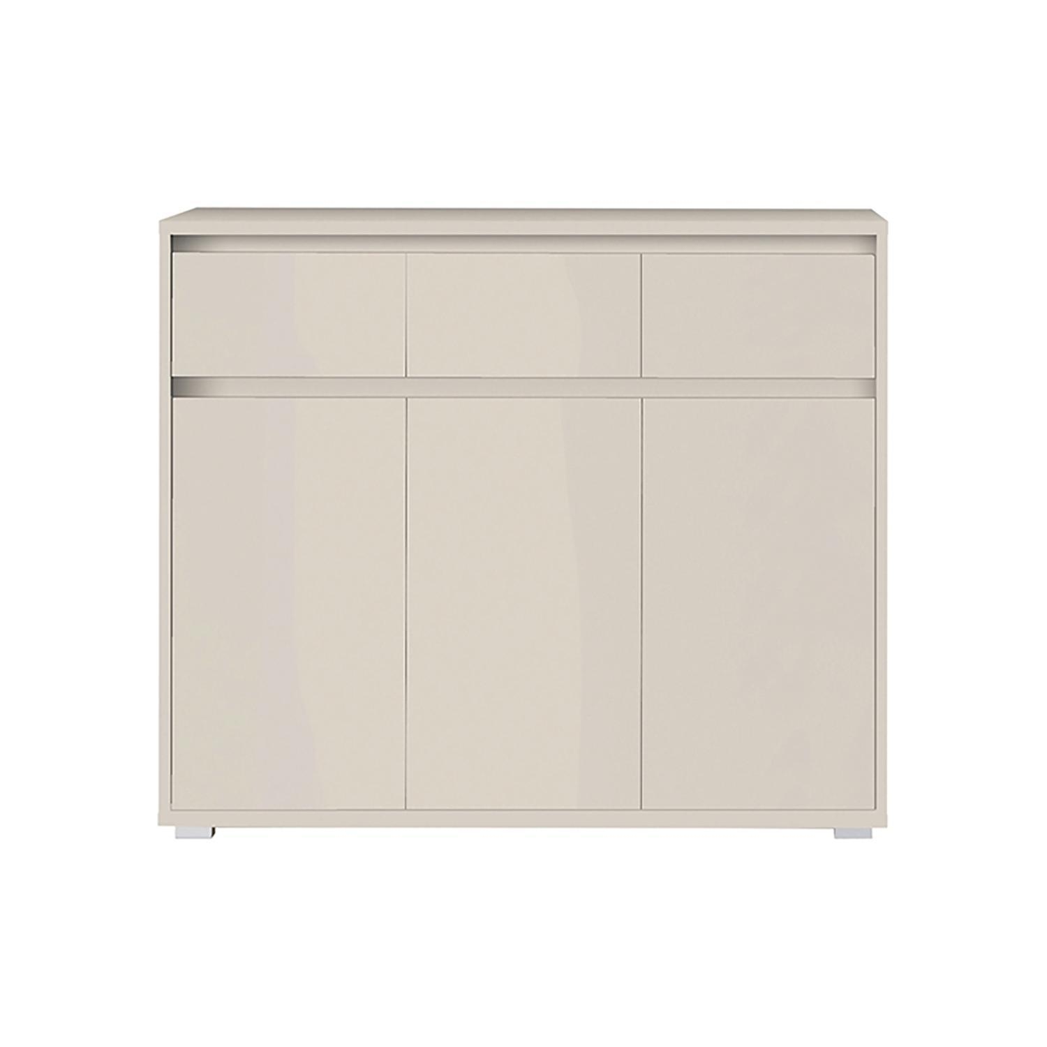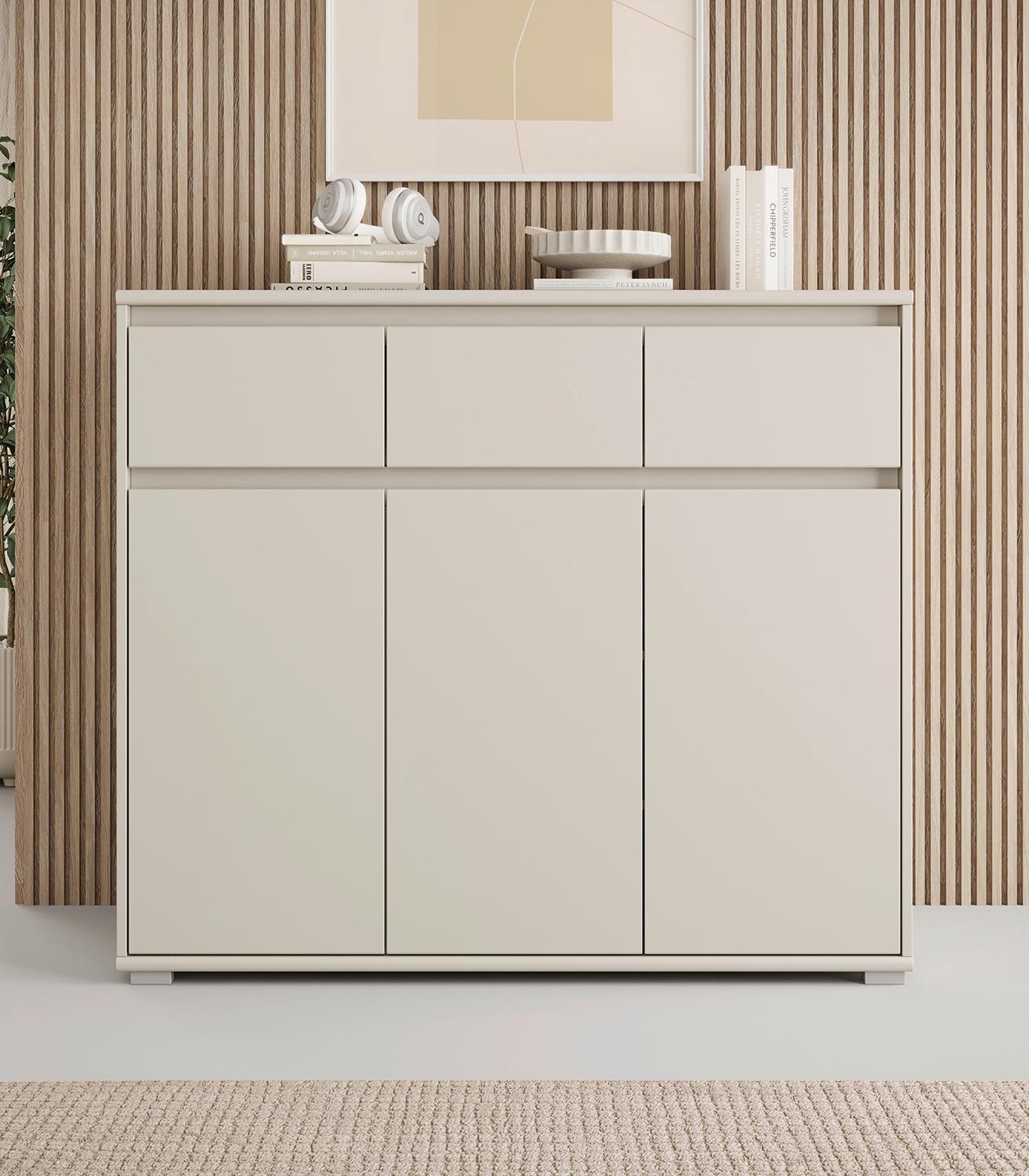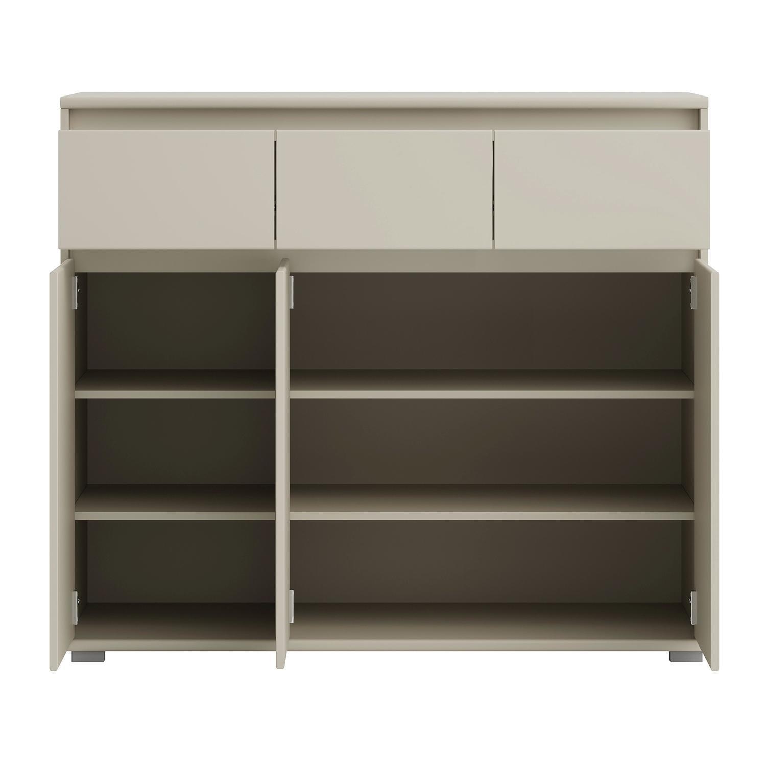 Die Kommode IDOLA ist in Cashmerebraun matt gehalten und zeichnet sich durch ein griffloses Design aus. Als Anrichte verfügt sie über drei Türen und drei Schubladen. Im Inneren stehen vier Einlegeböden zur Verfügung. Die Breite beträgt 118 cm, die Höhe 103 cm und die Tiefe 48 cm.