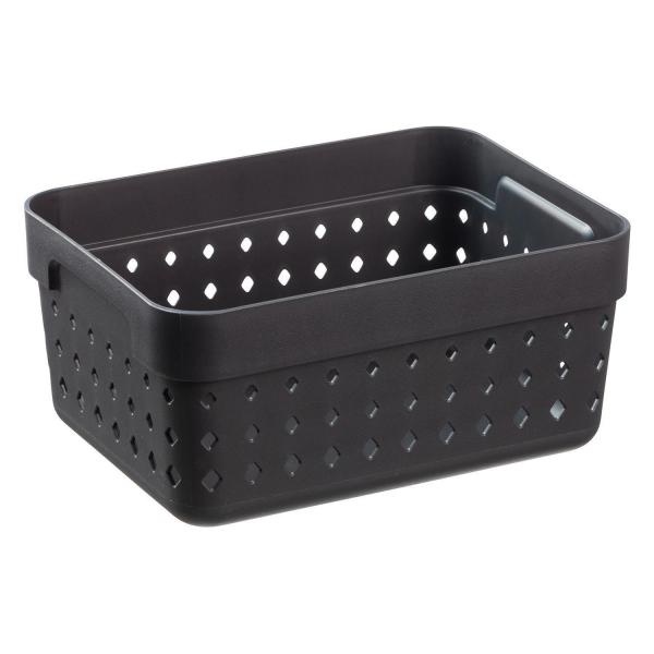 Diese praktische Aufbewahrungsbox SEOUL in Schwarz überzeugt mit funktionalem Design und dekorativer Lochstruktur im Rautenmuster. Mit den Maßen 15,8 x 11,8 x 7,3 cm bietet sie vielseitigen Stauraum für Bad, Küche oder Büro. Die seitlichen Griffe sorgen für bequemes Tragen, und dank der stapelbaren Form lässt sich die Box platzsparend verstauen. Ideal für alle, die Ordnung stilvoll gestalten möchten.