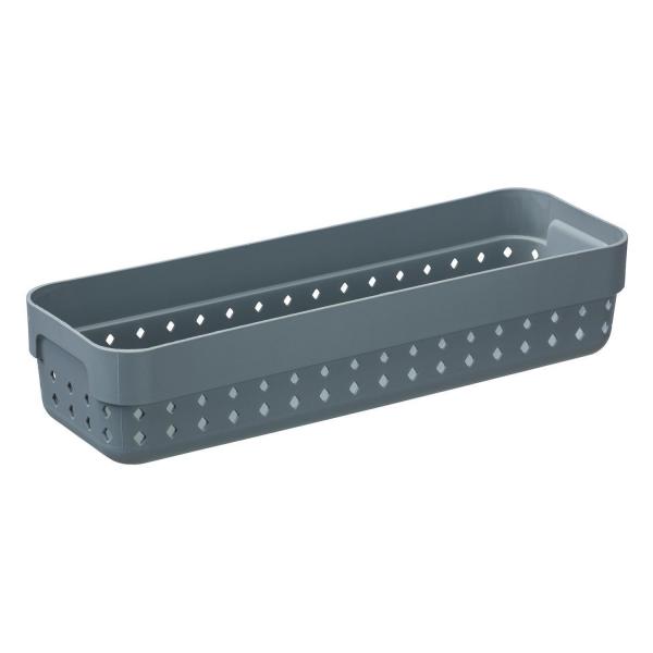 Diese praktische Aufbewahrungsbox SEOUL in Grau überzeugt mit funktionalem Design und dekorativer Lochstruktur im Rautenmuster. Mit den Maßen 23,8 x 7,8 x 5 cm bietet sie vielseitigen Stauraum für Bad, Küche oder Büro. Die seitlichen Griffe sorgen für bequemes Tragen, und dank der stapelbaren Form lässt sich die Box platzsparend verstauen. Ideal für alle, die Ordnung stilvoll gestalten möchten.