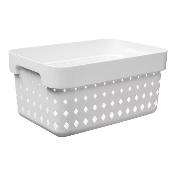 Diese praktische Aufbewahrungsbox SEOUL in Weiß überzeugt mit funktionalem Design und dekorativer Lochstruktur im Rautenmuster. Mit den Maßen 26 x 12,6 x 18 cm bietet sie vielseitigen Stauraum für Bad, Küche oder Büro. Die seitlichen Griffe sorgen für bequemes Tragen, und dank der stapelbaren Form lässt sich die Box platzsparend verstauen. Ideal für alle, die Ordnung stilvoll gestalten möchten.