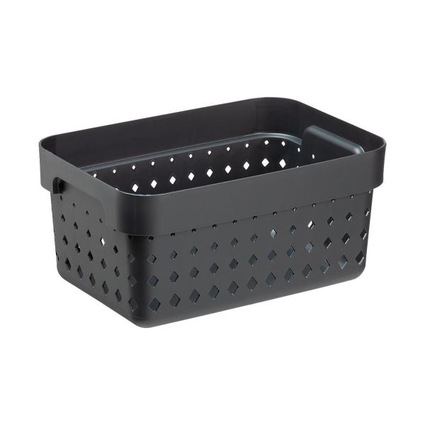 Diese praktische Aufbewahrungsbox SEOUL in Schwarz überzeugt mit funktionalem Design und dekorativer Lochstruktur im Rautenmuster. Mit den Maßen 26 x 12,6 x 18 cm bietet sie vielseitigen Stauraum für Bad, Küche oder Büro. Die seitlichen Griffe sorgen für bequemes Tragen, und dank der stapelbaren Form lässt sich die Box platzsparend verstauen. Ideal für alle, die Ordnung stilvoll gestalten möchten.