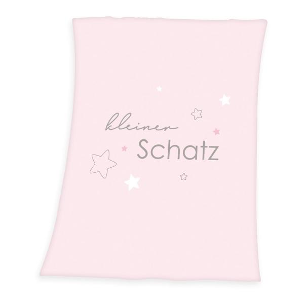 Die Babydecke KLEINER SCHATZ besteht aus rosaner Mikrofaser mit einer Größe von 75 x 100 cm. Sie ist mit dem Schriftzug „kleiner Schatz“ versehen. Das Material besteht aus 100 % Polyester. Die Decke ist bei 40 °C waschbar und für den Trockner geeignet.