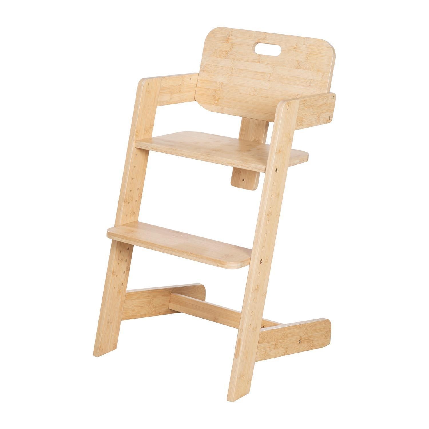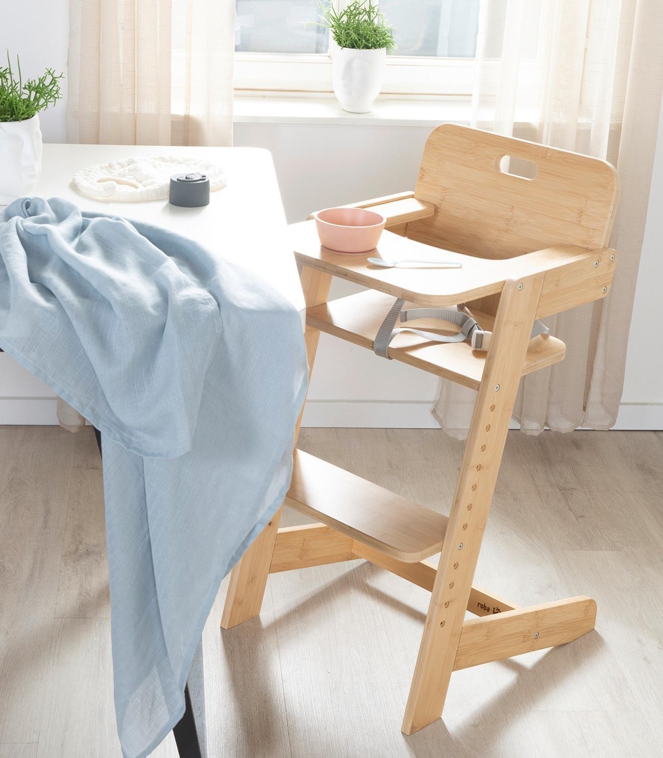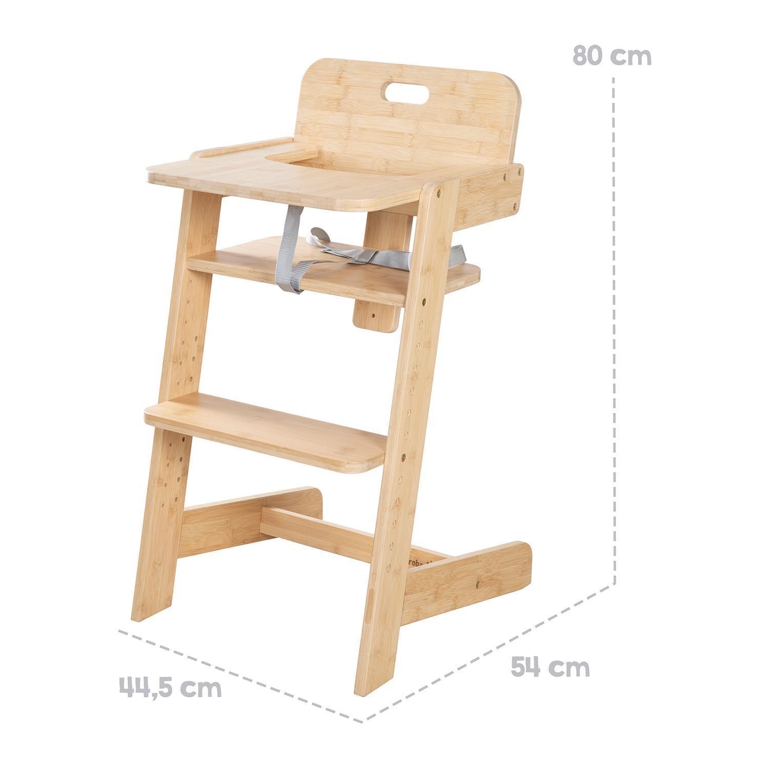Der Babyhochstuhl NANNE ist aus lackiertem Bambusholz in Braun gefertigt. Ein wesentliches Merkmal des Stuhls ist seine mitwachsende Funktion, die durch eine verstellbare Fußstütze ermöglicht wird. Für die Sicherheit des Kindes ist der Hochstuhl mit einem fixierbaren Schrittgurt ausgestattet. Die Sitzfläche ist bis zu maximal 70 kg belastbar. Darüber hinaus verfügt der Hochstuhl über ein abnehmbares Essbrett, das eine maximale Belastbarkeit von 15 kg aufweist. Das Modell ist für Kinder ab einem Alter von sechs Monaten konzipiert. Die Abmessungen des Babyhochstuhls betragen 45 cm in der Breite, 86 cm in der Höhe und 50 cm in der Tiefe.