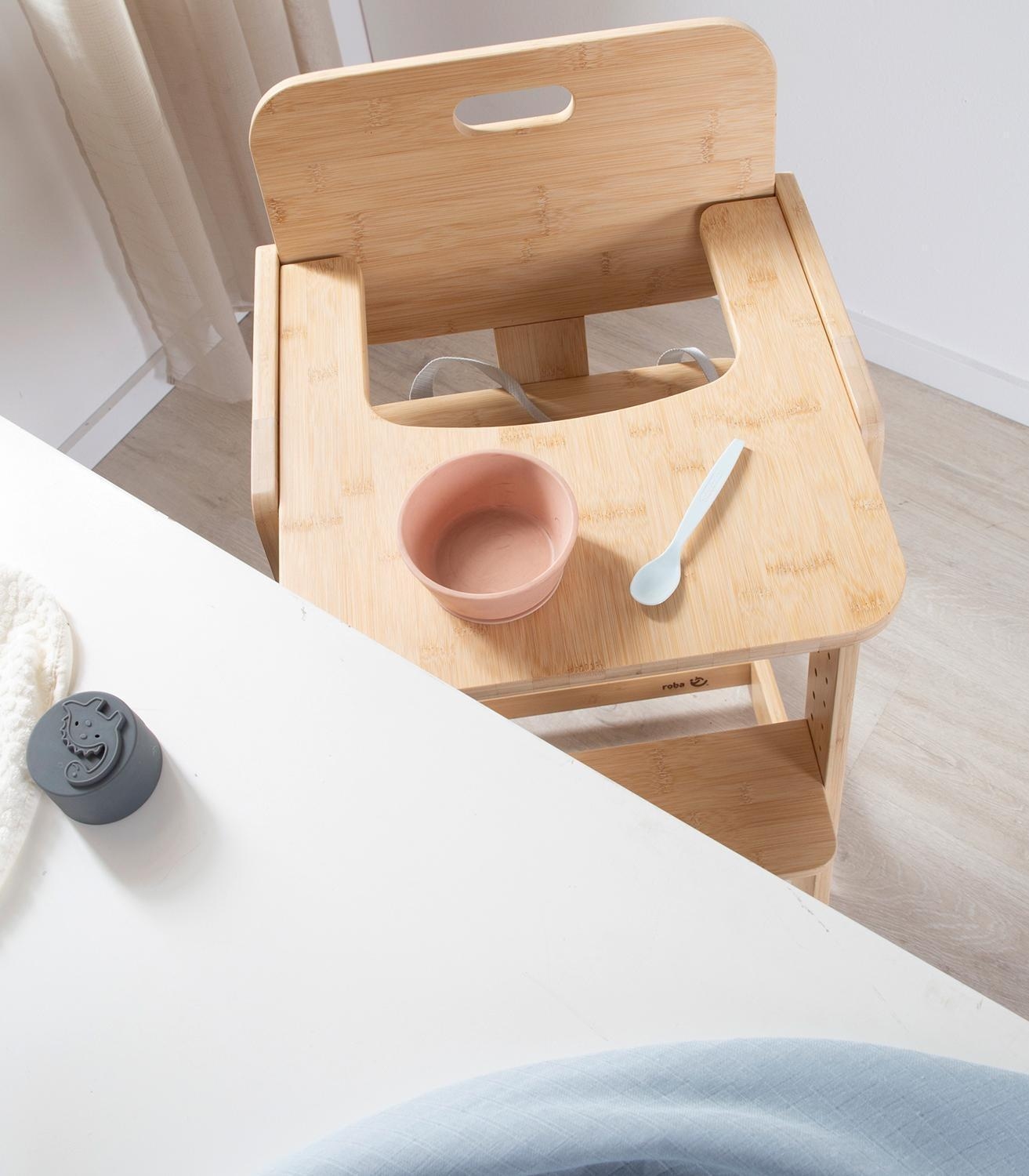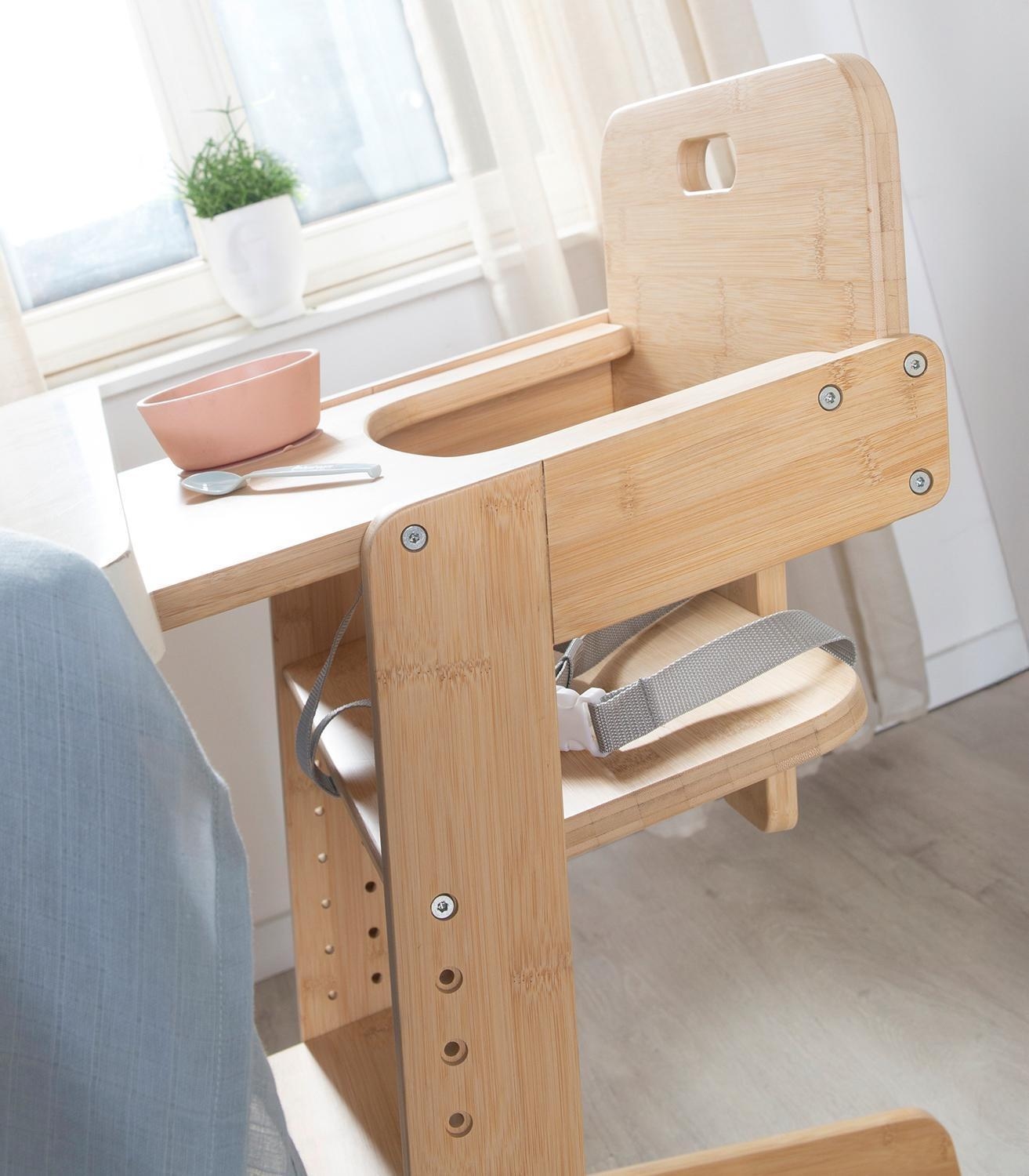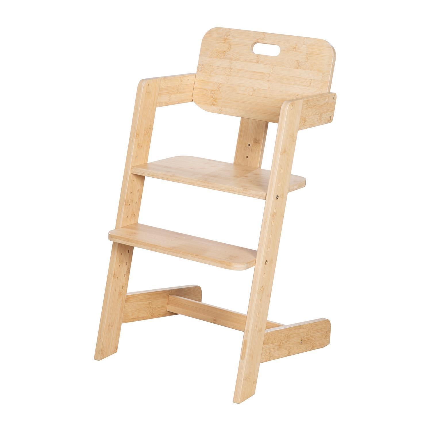 Der Babyhochstuhl NANNE ist aus lackiertem Bambusholz in Braun gefertigt. Ein wesentliches Merkmal des Stuhls ist seine mitwachsende Funktion, die durch eine verstellbare Fußstütze ermöglicht wird. Für die Sicherheit des Kindes ist der Hochstuhl mit einem fixierbaren Schrittgurt ausgestattet. Die Sitzfläche ist bis zu maximal 70 kg belastbar. Darüber hinaus verfügt der Hochstuhl über ein abnehmbares Essbrett, das eine maximale Belastbarkeit von 15 kg aufweist. Das Modell ist für Kinder ab einem Alter von sechs Monaten konzipiert. Die Abmessungen des Babyhochstuhls betragen 45 cm in der Breite, 86 cm in der Höhe und 50 cm in der Tiefe.