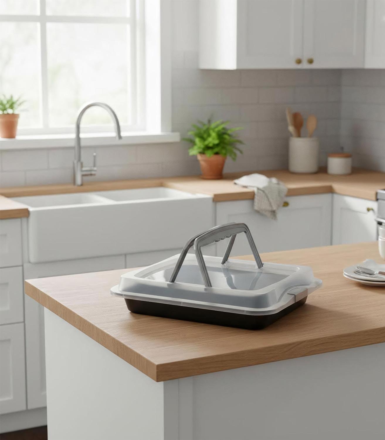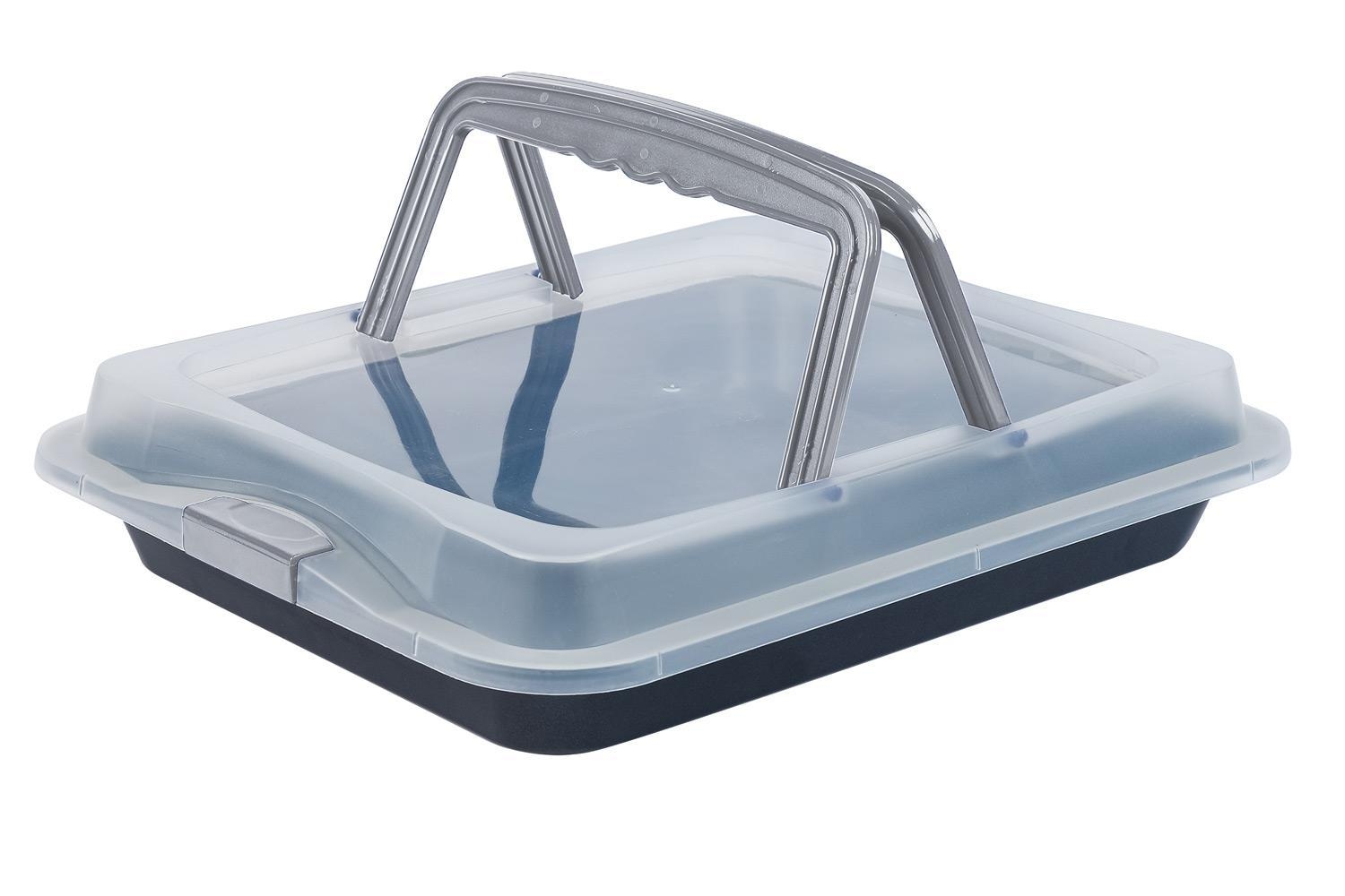 Das Backblech mit Transporthaube ist eine praktische Lösung für jeden Backliebhaber. Hergestellt ist das Backblech in Grau aus Stahl und verfügt über eine langlebige Antihaftbeschichtung. Mit einer Temperaturbeständigkeit ist es ideal für eine Vielzahl von Backanwendungen geeignet. Die Transporthaube aus transparentem Kunststoff mit blauen Griffen bietet zusätzlichen Schutz und lässt sich dank der blauen Clip-Verschlüsse sicher verschließen. Mit einer Breite von 42 cm, einer Höhe von 8 cm und einer Tiefe von 29 cm bietet dieses Set die perfekte Größe für Ihre Backbedürfnisse.