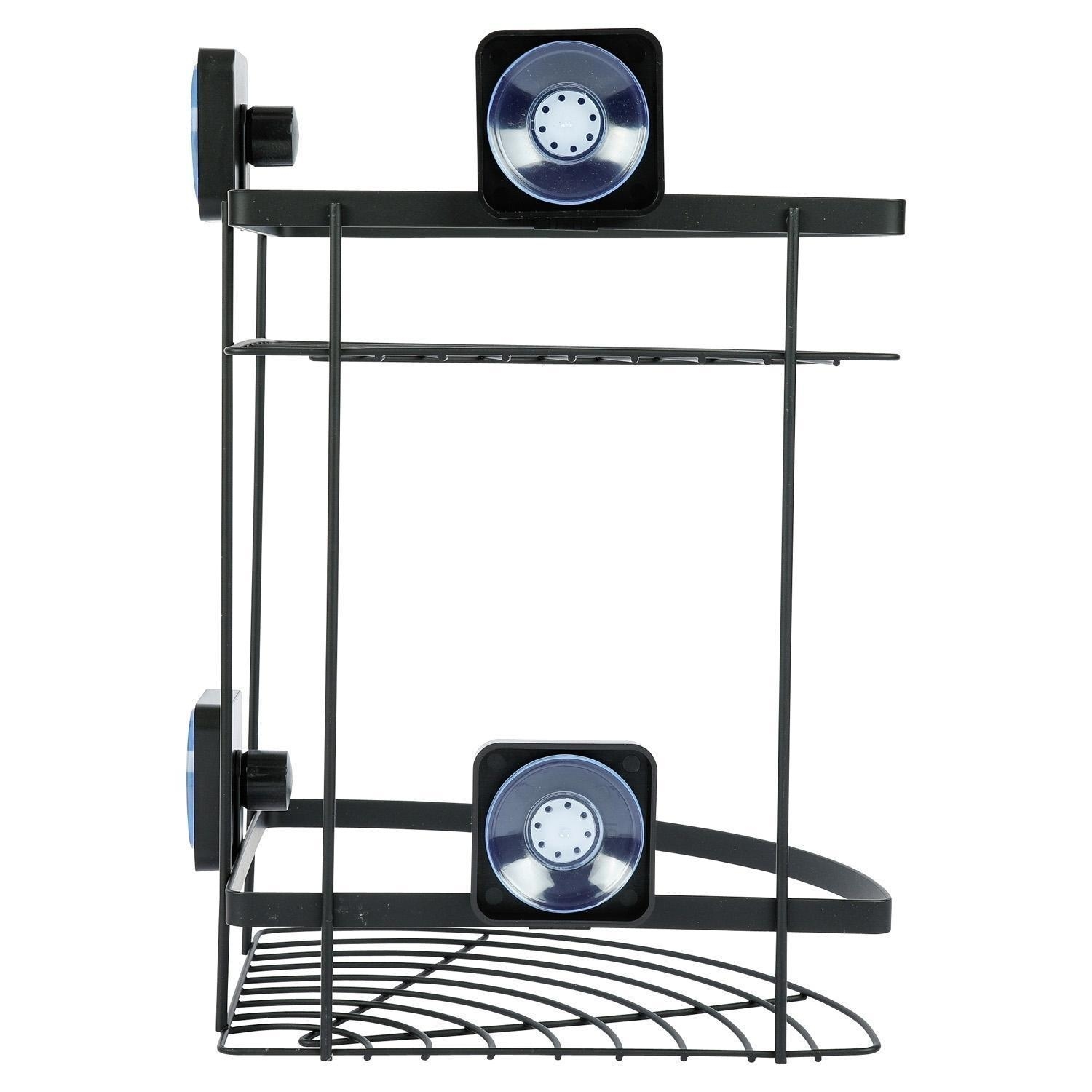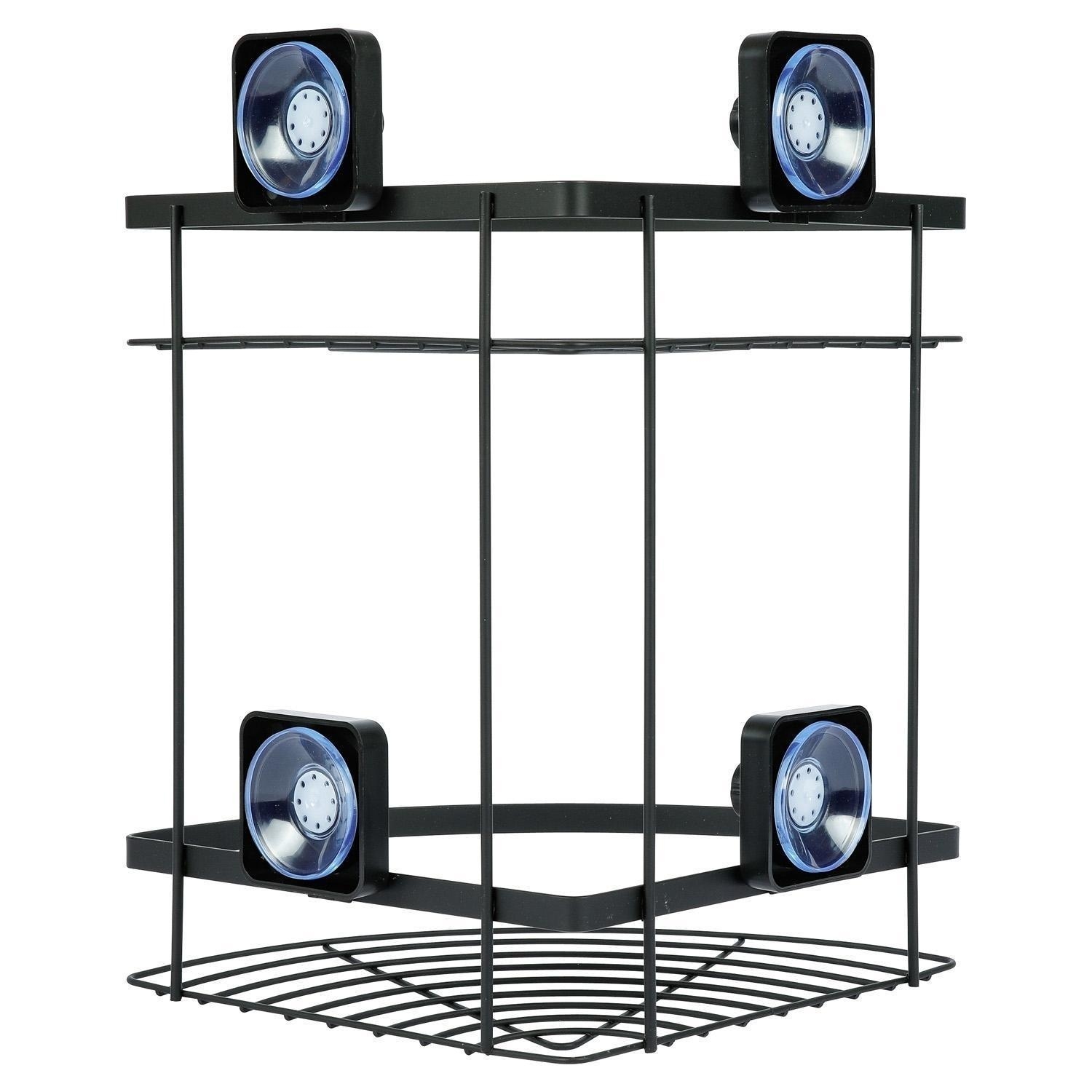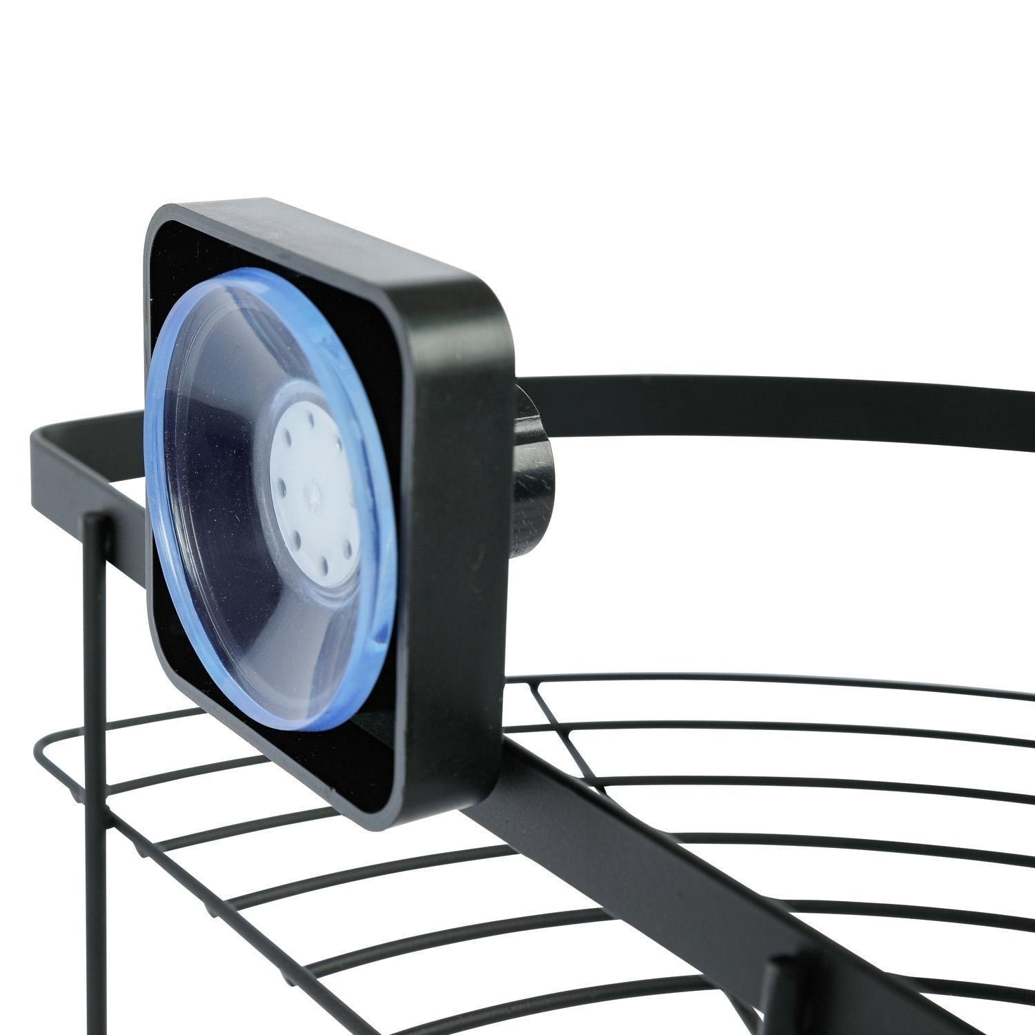 Das schwarze Bad Eck-Wandregal NERA bietet mit 22 x 34 cm aus pulverbeschichtetem Eisen und 2 Körben praktischen Stauraum im Badezimmer. Mit 4 Saugnäpfen lässt es sich einfach auf gerader und trockener Oberfläche aufhängen, ohne Bohren. Geeignet für Eckwände und Eckduschen. Die Tragfähigkeit je Korb beträgt 2 kg.