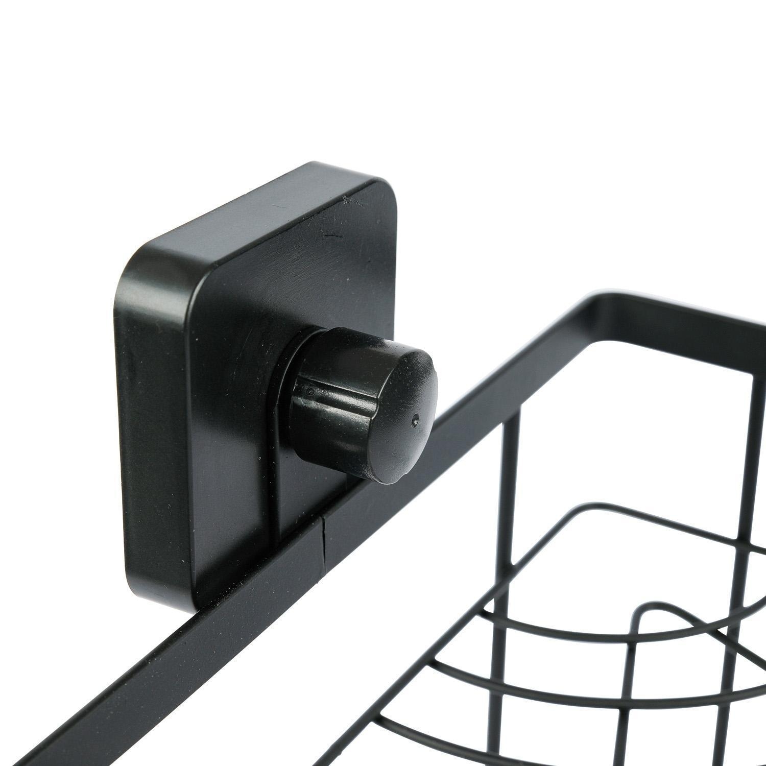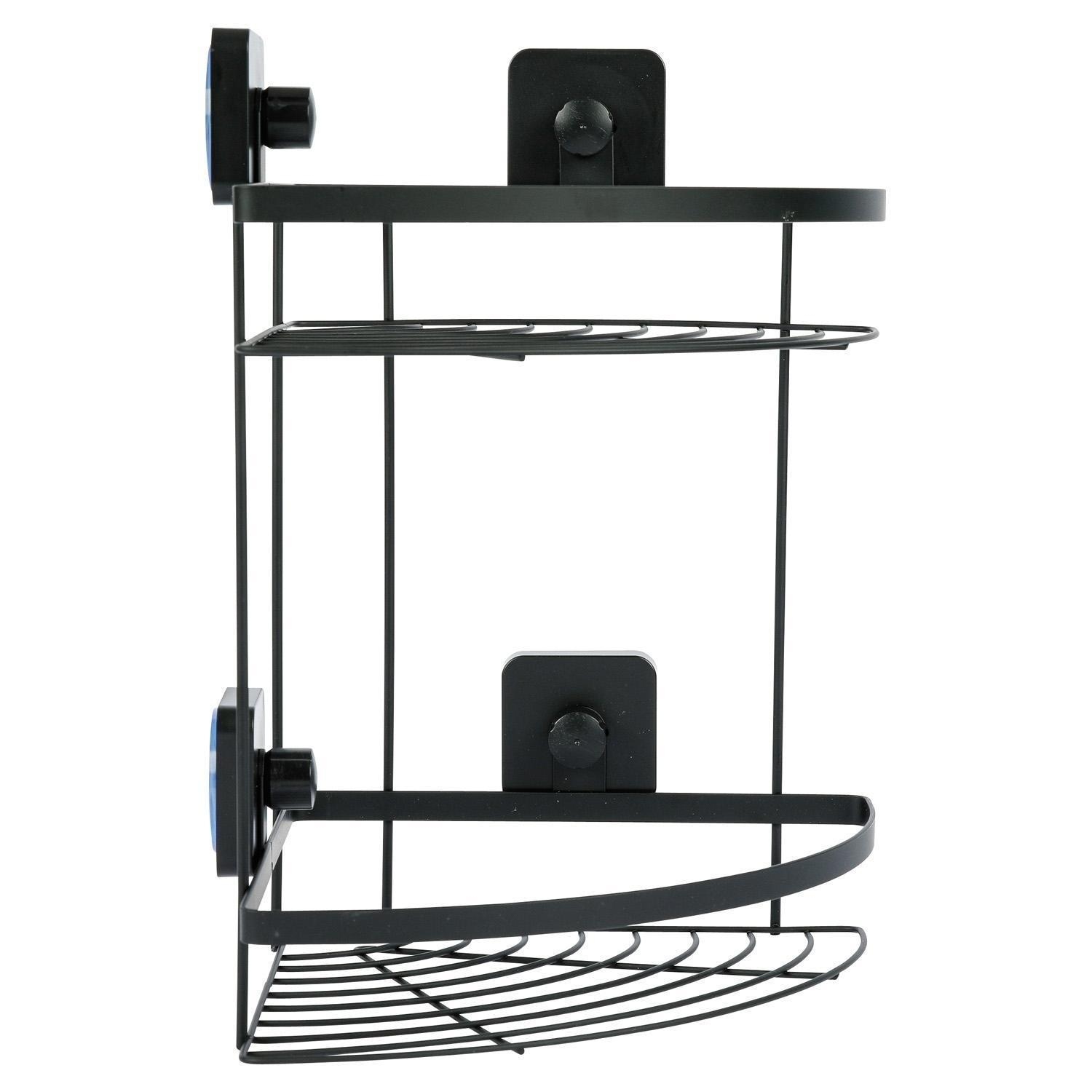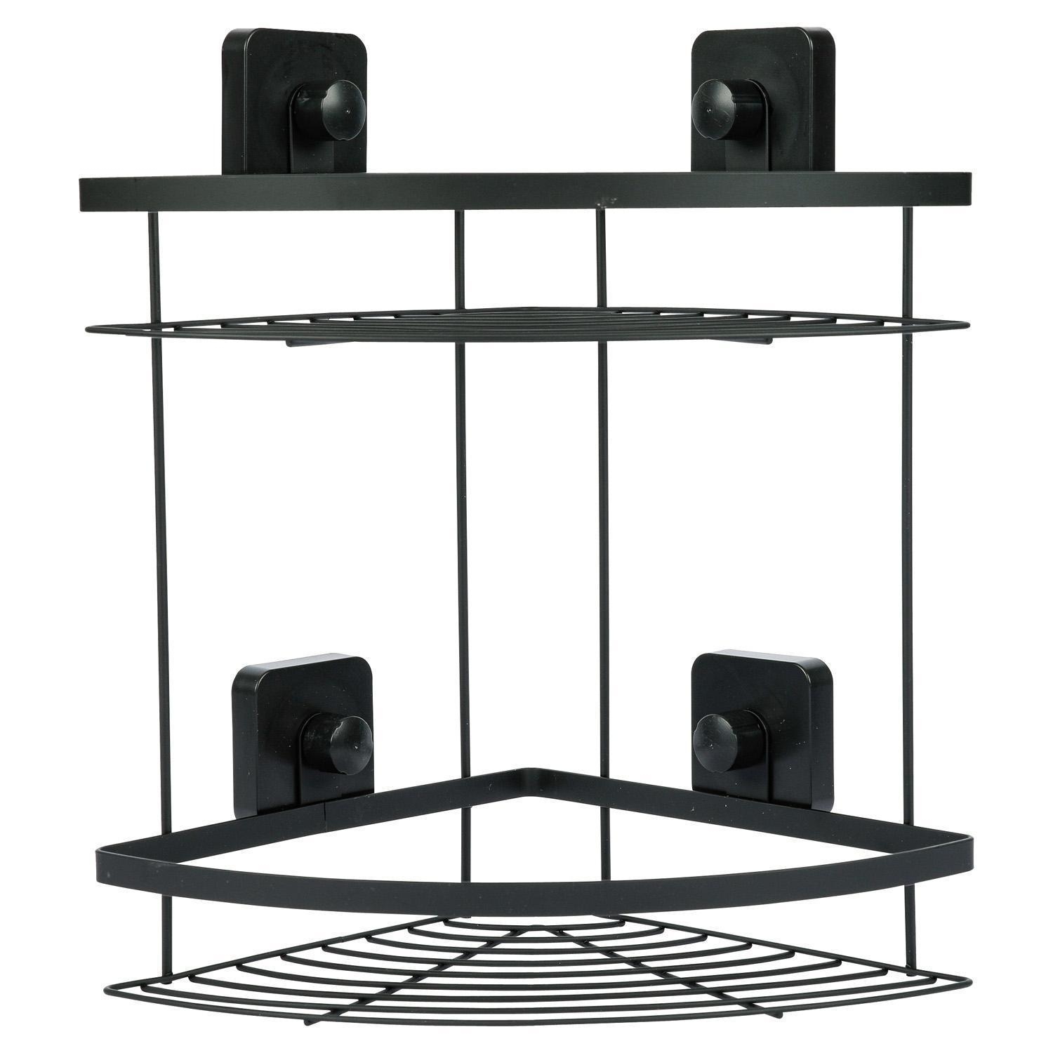 Das schwarze Bad Eck-Wandregal NERA bietet mit 22 x 34 cm aus pulverbeschichtetem Eisen und 2 Körben praktischen Stauraum im Badezimmer. Mit 4 Saugnäpfen lässt es sich einfach auf gerader und trockener Oberfläche aufhängen, ohne Bohren. Geeignet für Eckwände und Eckduschen. Die Tragfähigkeit je Korb beträgt 2 kg.