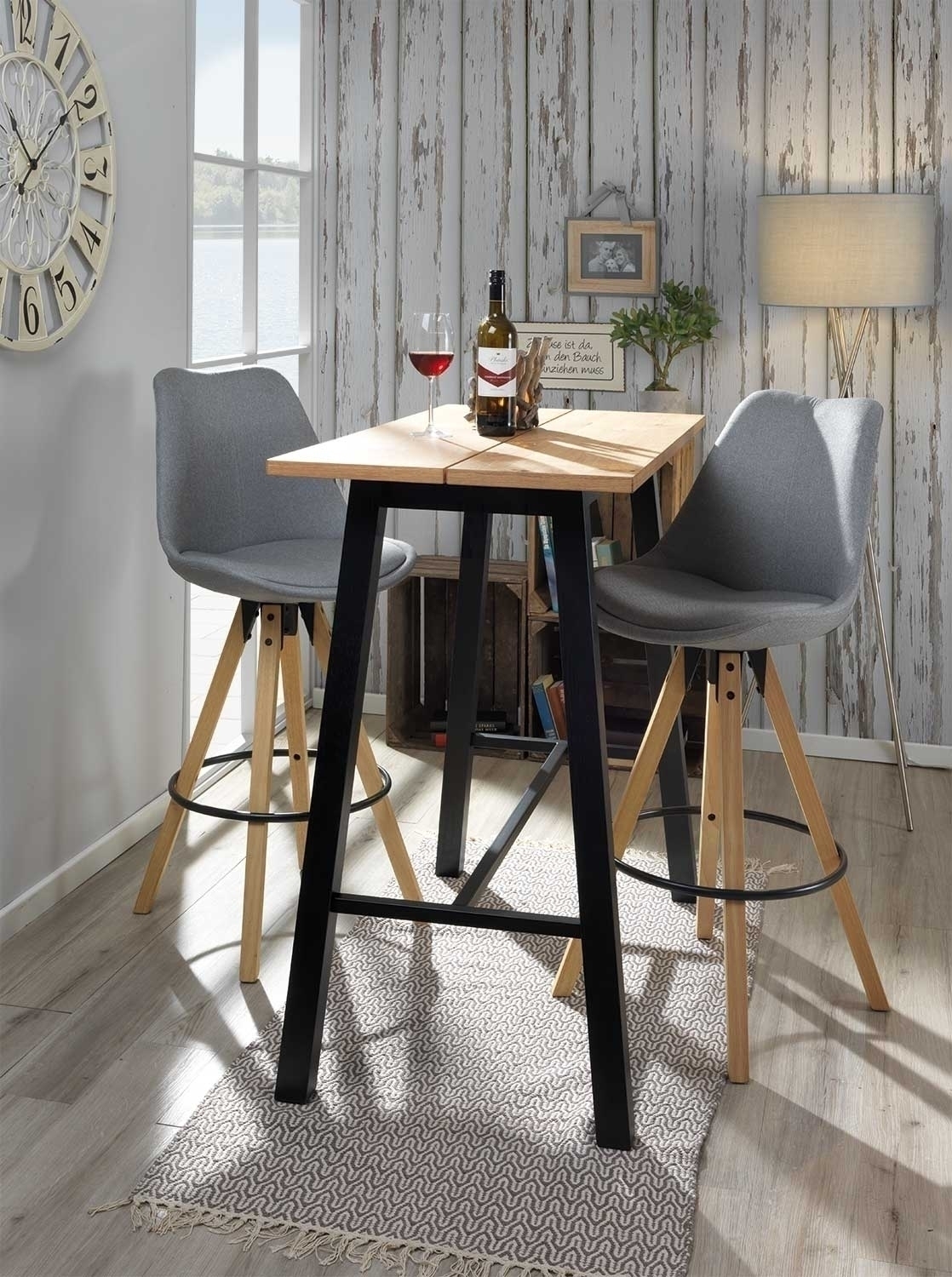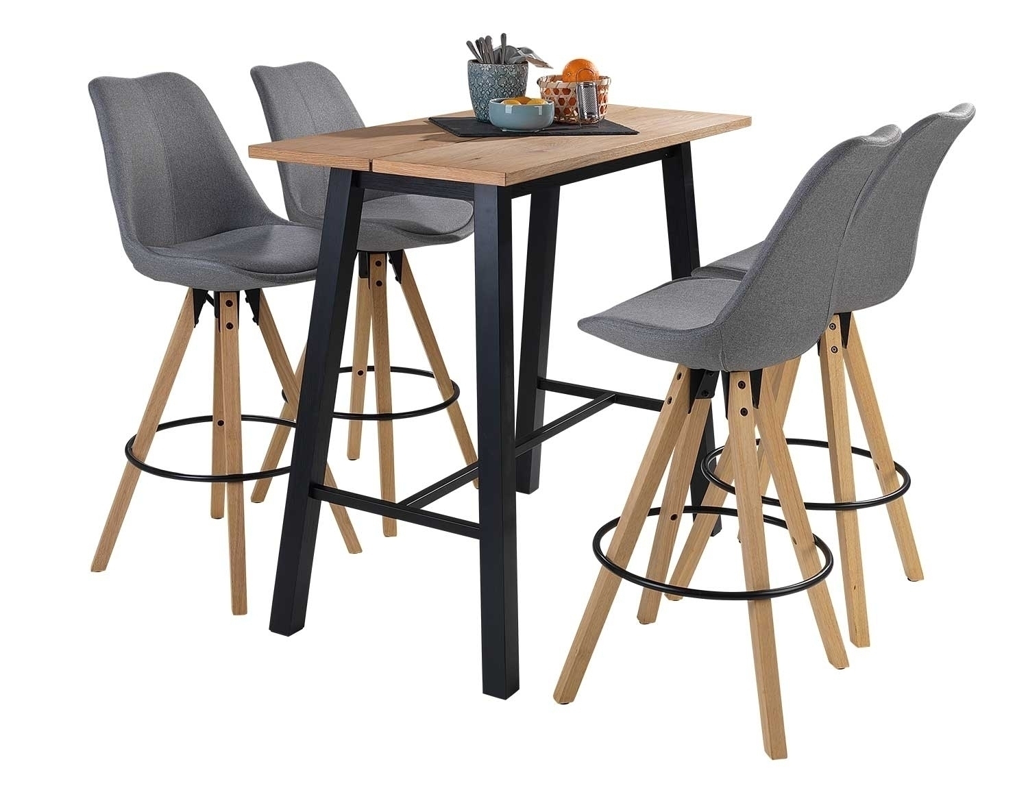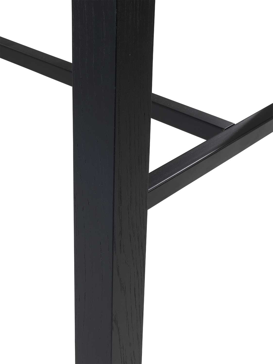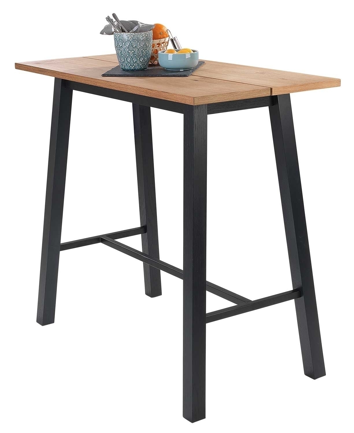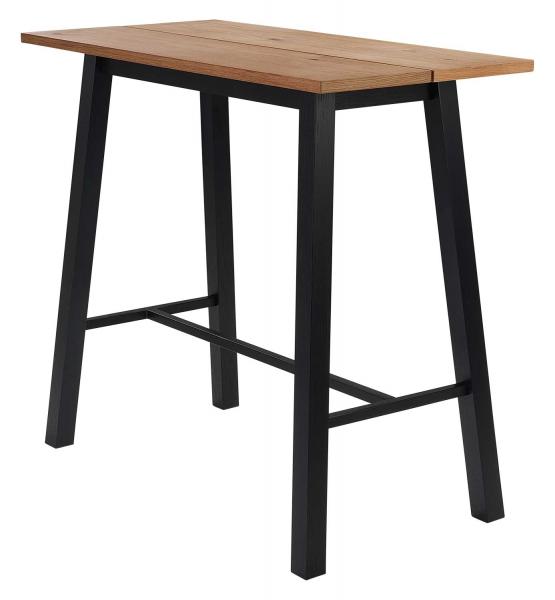 Die Tischplatte des Bartisches besteht aus Holzwerkstoff mit Echtholzfurnier in Wildeichenoptik. Die Mittelstreben bestehen aus Metall und verstärken so die Stabilität. Die Beine bestehen aus Holzwerkstoff und sind mit schwarz lackiertem Echtholzfurnier in Eichenoptik versehen.