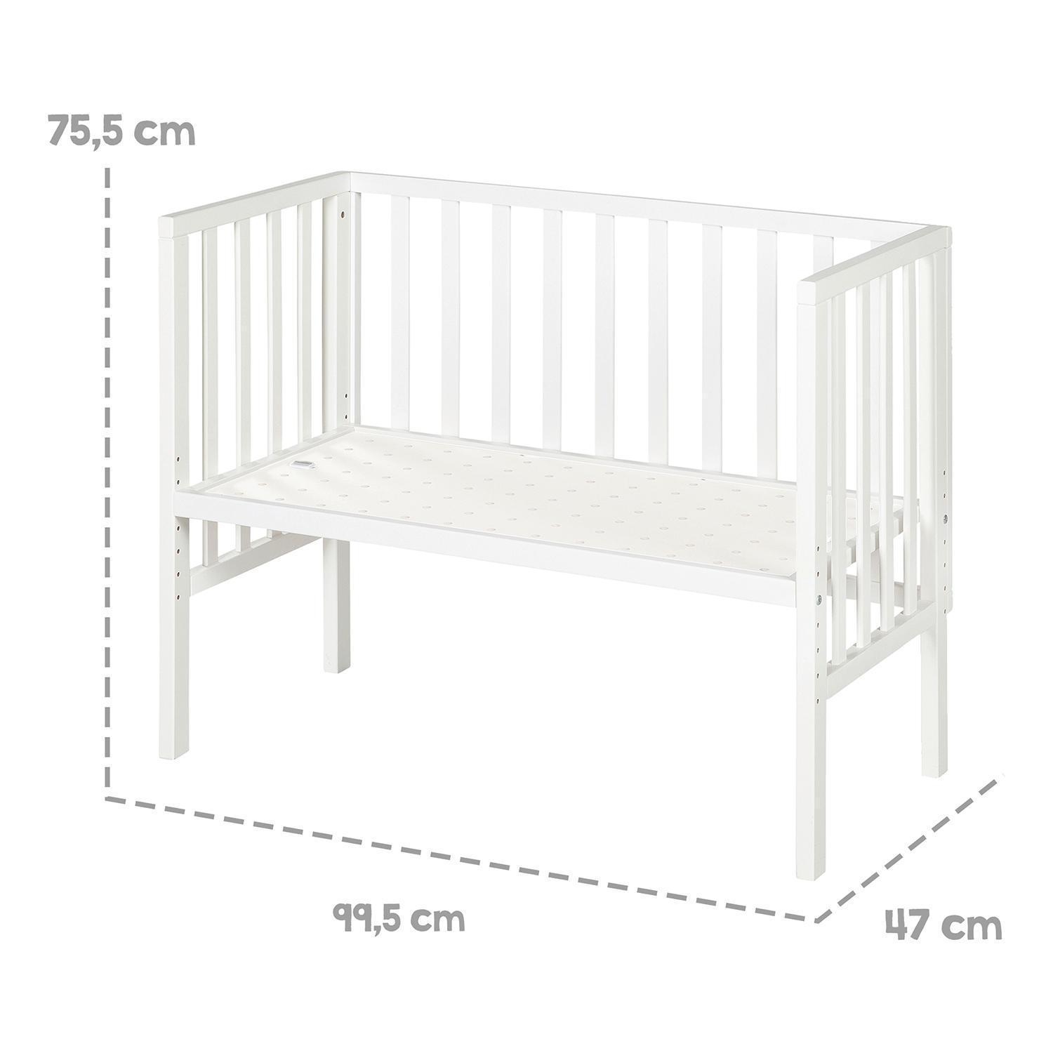 Das Beistellbett LINORA ist in Weiß matt gehalten. Das Modell verfügt über einen Lattenrost, der mehrfach höhenverstellbar ist. Zur Ausstattung gehören ein Rausfallschutz sowie eine passende Matratze. Das Bett ist für eine maximale Belastung von 65 kg ausgelegt. Die äußeren Abmessungen des Beistellbettes betragen 47 cm in der Breite, 75,5 cm in der Höhe und 99,5 cm in der Tiefe. Die Liegefläche misst 45 x 90 cm.
