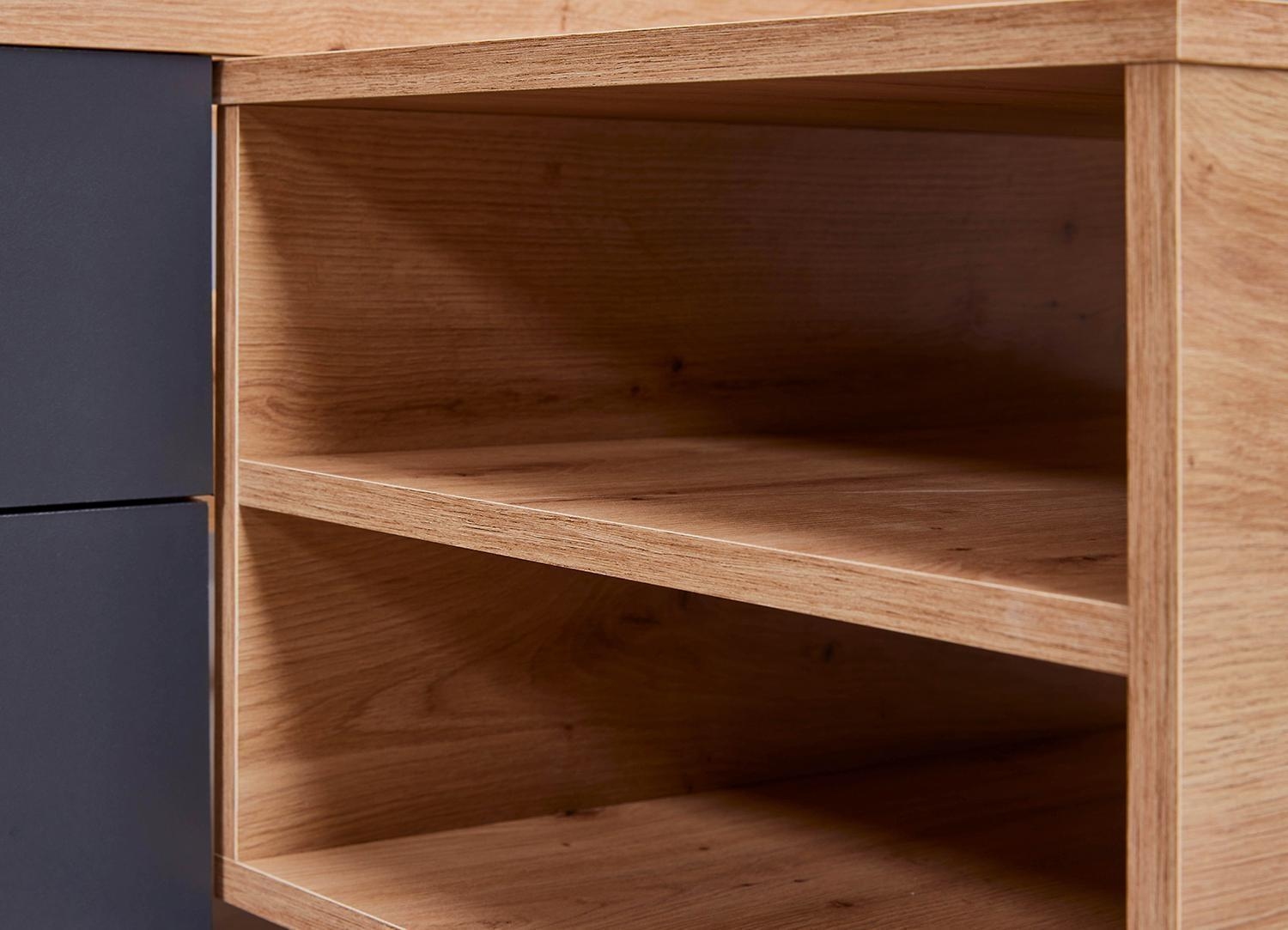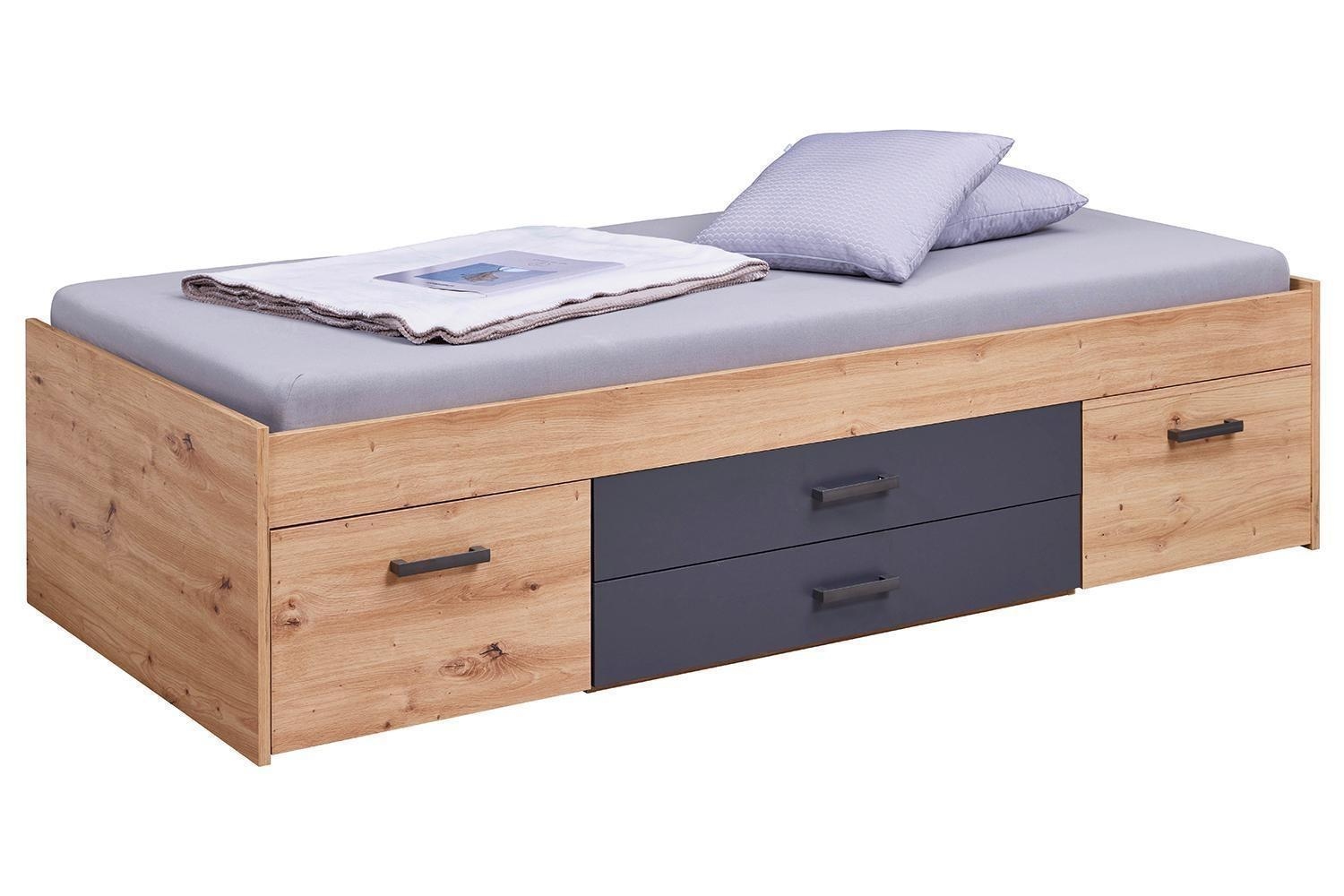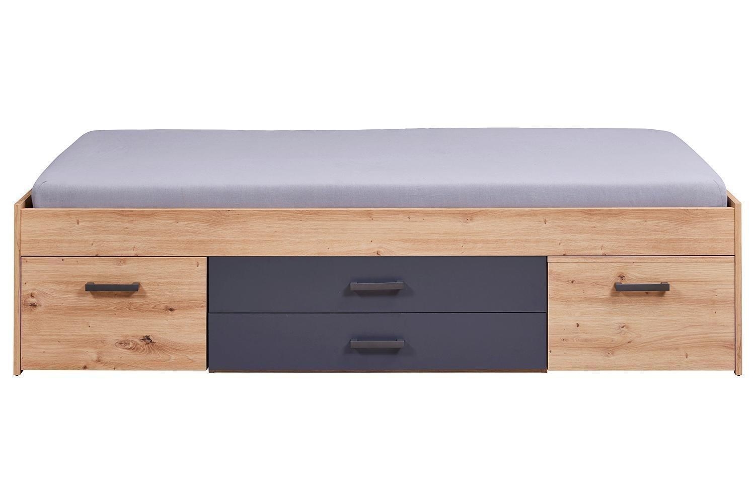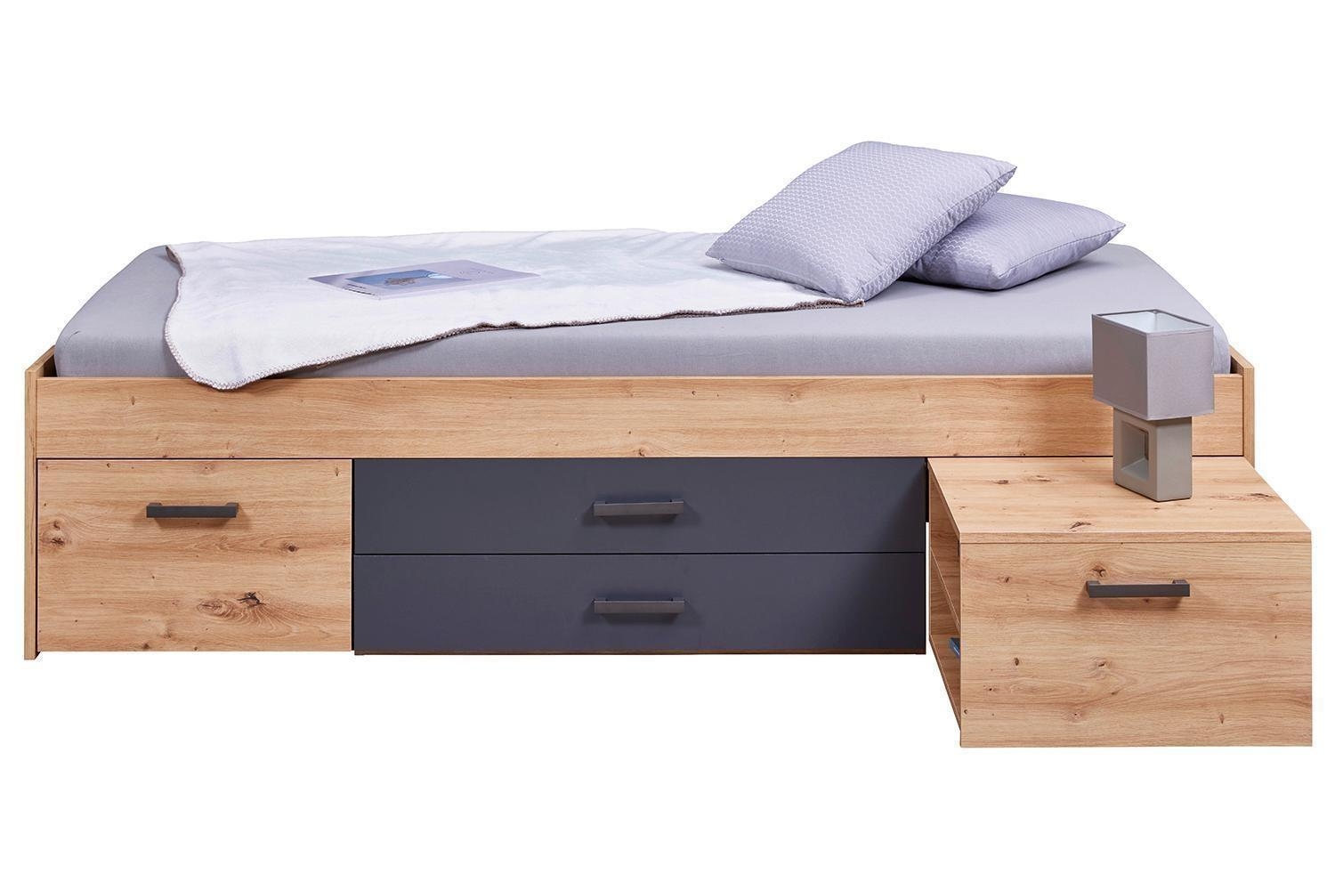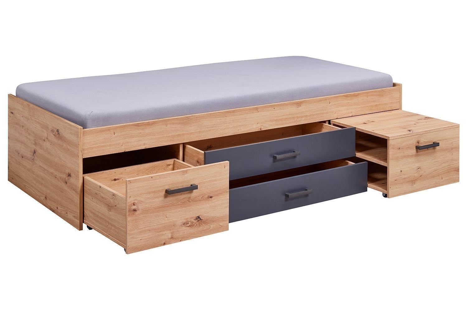 Das Bettgestell LAZLO ist in Artisan Eiche Dekor mit Absetzungen in Grau gehalten und verfügt über drei Schubladen sowie einen ausziehbaren Nachttisch mit zwei Ablageflächen. Es wird ohne Matratze und Lattenrost geliefert. Die Liegefläche beträgt 90 x 200 cm. Die Maße des Bettgestells betragen 94 cm in der Breite, 48 cm in der Höhe und 204 cm in der Tiefe.