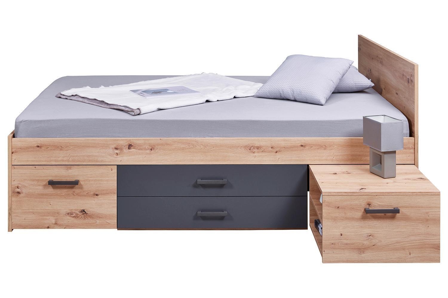Das Bettgestell LAZLO ist in Artisan Eiche Dekor mit Absetzungen in Grau gehalten und verfügt über sechs Schubladen sowie zwei ausziehbare Nachttische mit je zwei Ablageflächen. Es wird ohne Matratze und Lattenrost geliefert. Die Liegefläche beträgt 140 x 200 cm. Die Maße des Bettgestells betragen 145 cm in der Breite, 83 cm in der Höhe und 204 cm in der Tiefe.