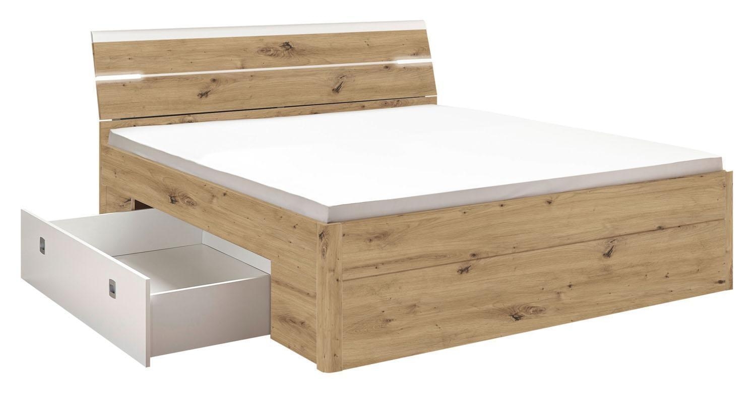Die Bettrahmenhöhe beträgt 46 cm, und das Bettgestell wird platzsparend flach verpackt geliefert. Die Schubladen bieten praktischen Stauraum für Bettwäsche oder andere persönliche Gegenstände. Die Kombination aus dem warmen Holzdekor und dem zeitlosen Weiß macht das Bettgestell MALEA zu einem attraktiven Blickfang in Ihrem Schlafzimmer. Der Versand erfolgt per Spedition.