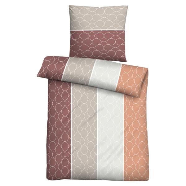 Die Biber-Bettwäsche ORIENTA der Marke biberna besticht durch ihr stilvolles Design in Burgund, Orange und Grau. Das Set umfasst einen Bettbezug und einen Kissenbezug, die beide aus einer Mischung von Baumwolle und Polyester gefertigt sind. Die Bettwäsche zeichnet sich durch ein elegantes Streifenmuster mit Ornamenten aus. Praktische Reißverschlüsse erleichtern das Beziehen und Abziehen. Der Bettbezug misst 155 x 220 cm, der Kissenbezug 80 x 80 cm. Die Materialzusammensetzung der Bettwäschegarnitur beträgt 60 % Baumwolle und 40 % Polyester.