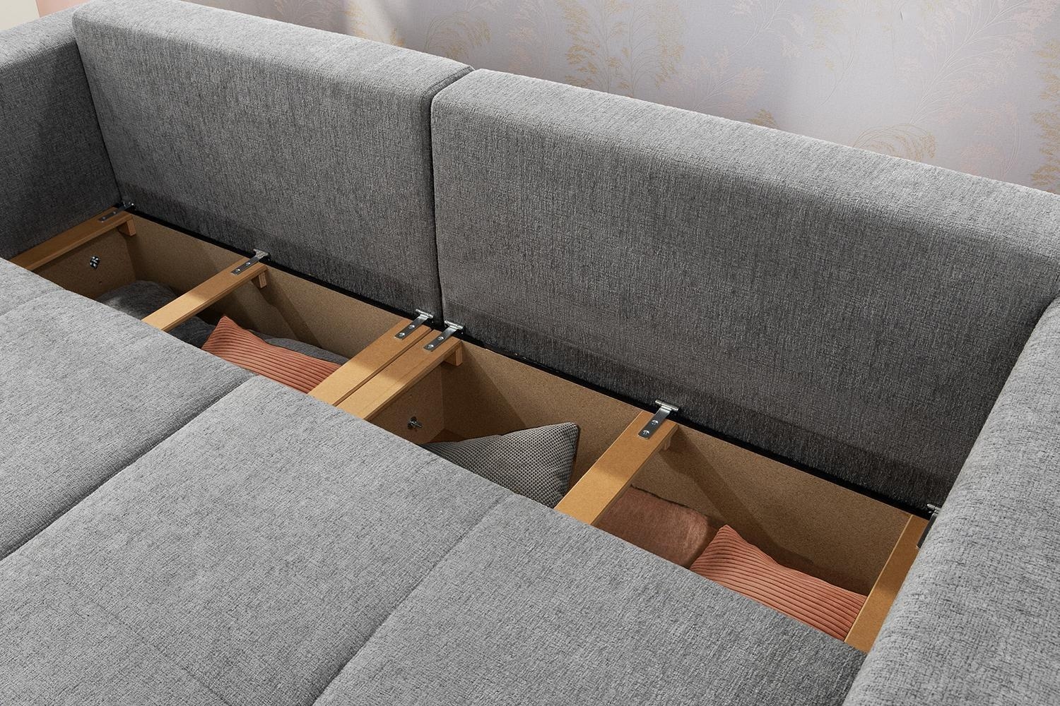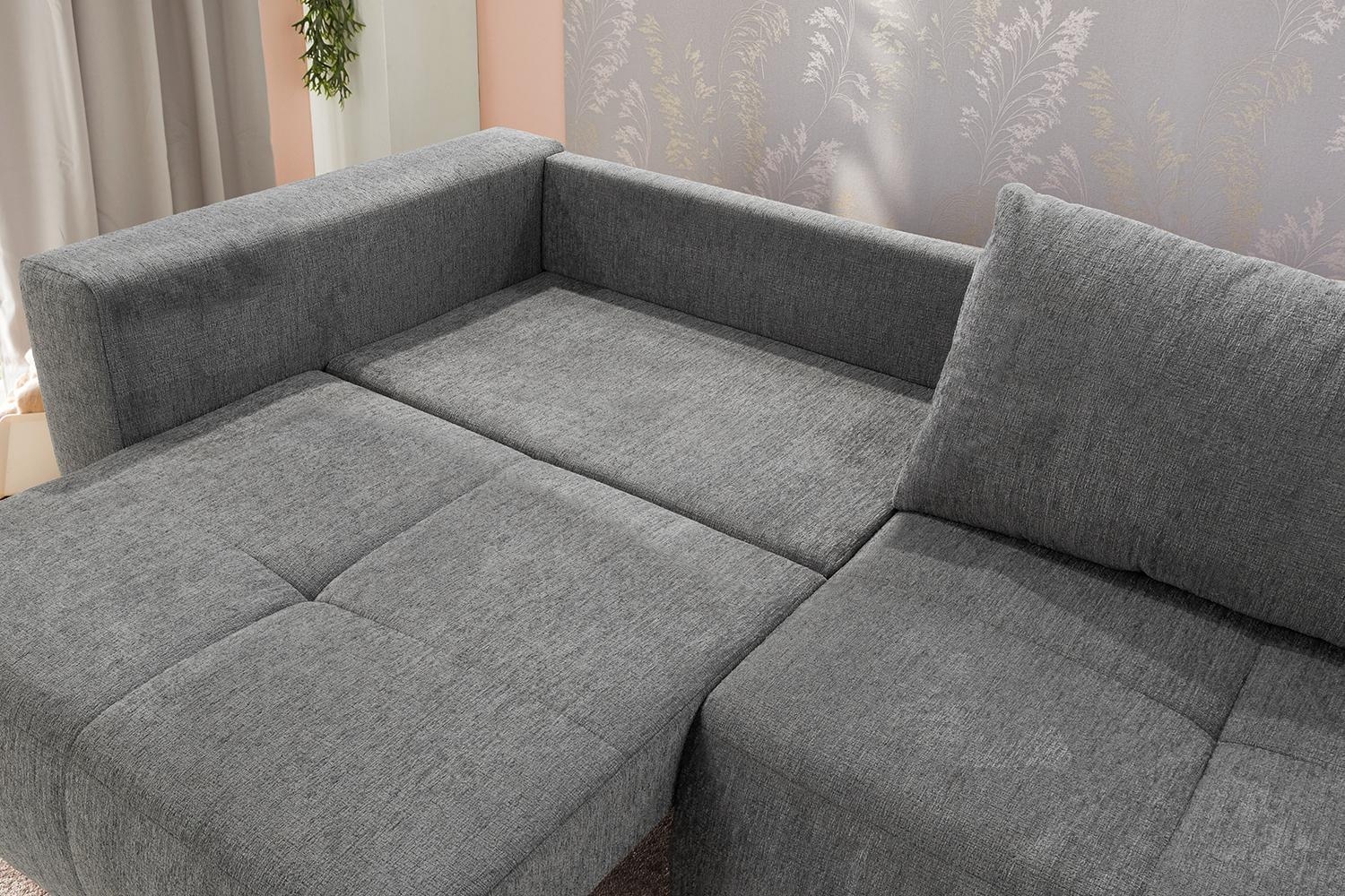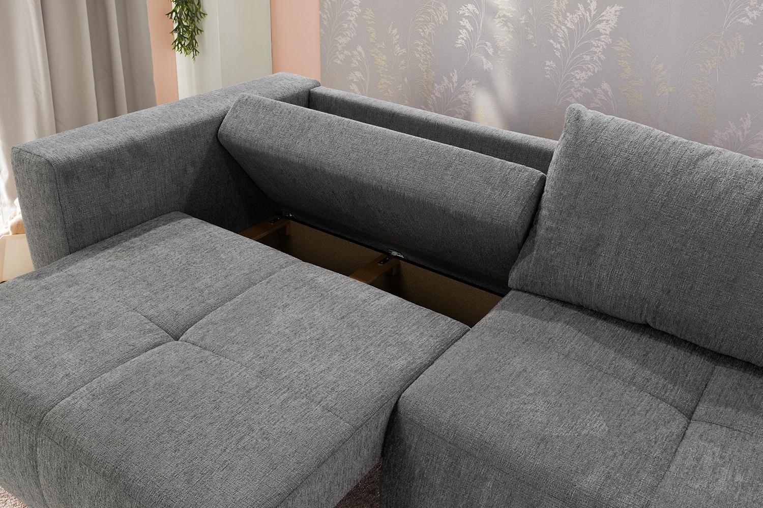 Das Bigsofa RAWINA ist mit einem grauen Chenillebezug ausgestattet und verfügt über manuell ausziehbare Sitzelemente. Diese großzügige Sitzgelegenheit besitzt eine Breite von 243 cm, eine Tiefe von 115 cm sowie eine Höhe von 84 cm. Zur Ausstattung gehören zwei Rückenkissen, zwei Zierkissen und zwei integrierte Bettkästen. Zudem ist diese Couch mit einer Gästebettfunktion versehen, die eine Liegefläche von 145 x 197 cm bietet.