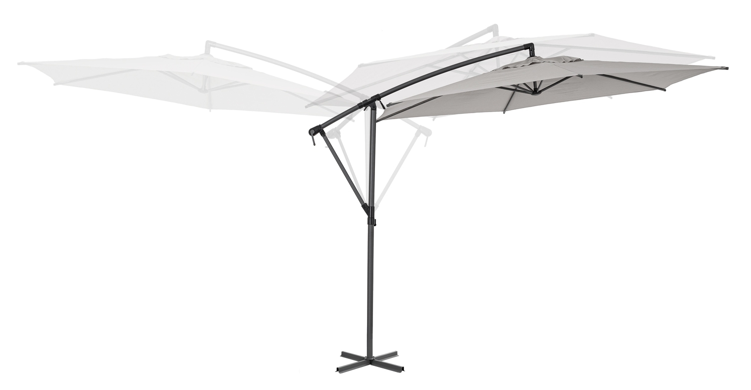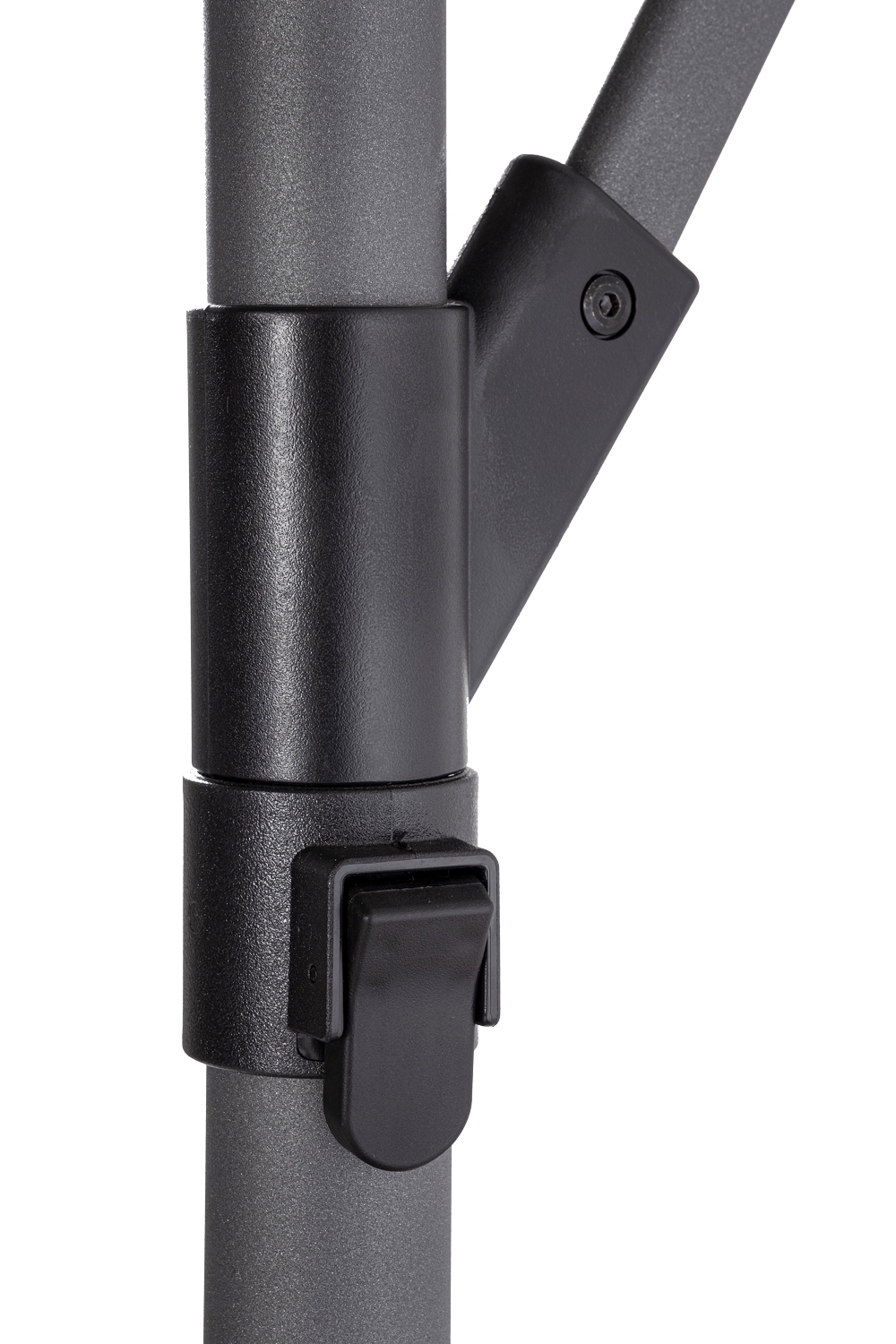 Der Ampel-Sonnenschirm schafft viel Platz ohne störenden Mittelmast, denn das Schirmdach ist am Schiebemastgestell mit einer Kurbel befestigt. So können Sie den Sonnenschirm über das Gestell leicht in der Höhe anpassen und mit der Kurbelmechanik die gewünschte Position aus 6 möglichen einstellen. Je nach Sonnenstand können Sie den Freiarmschirm um 360° drehen, schräg aufstellen und beidseitig um die eigene Achse schwenken. Das runde Schirmdach besteht aus witterungsbeständigem Polyester und hat einen Lichtschutzfaktor von LSF 50+.
