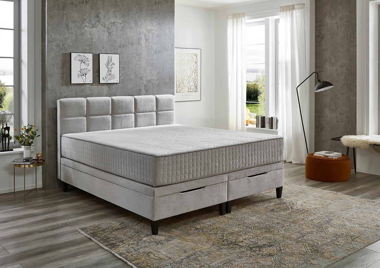 Das Boxbett WOLFGANG ist mit einem Webstoffbezug in Hellgrau ausgestattet und verfügt über eine Liegefläche von 180 x 200 cm. Es ist mit zwei wendbaren 7-Zonen-Taschenfederkernmatratzen ausgestattet. Unter der Liegefläche befinden sich Bettkästen, die mit Gasdruckfedern geöffnet werden können. Die Matratzen haben den Härtegrad 2/3. Die Maße des Bettes betragen 180 cm in der Breite, 114 cm in der Höhe und 213 cm in der Tiefe. Die Liegehöhe beträgt 70 cm.