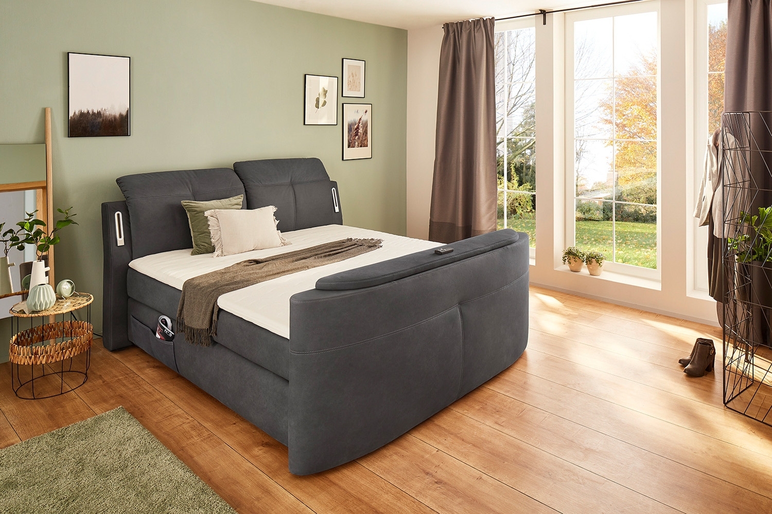 - mit USB-Ladeanschlüssen, LED-Beleuchtung und elektrisch ausfahrbarer TV-Halterung