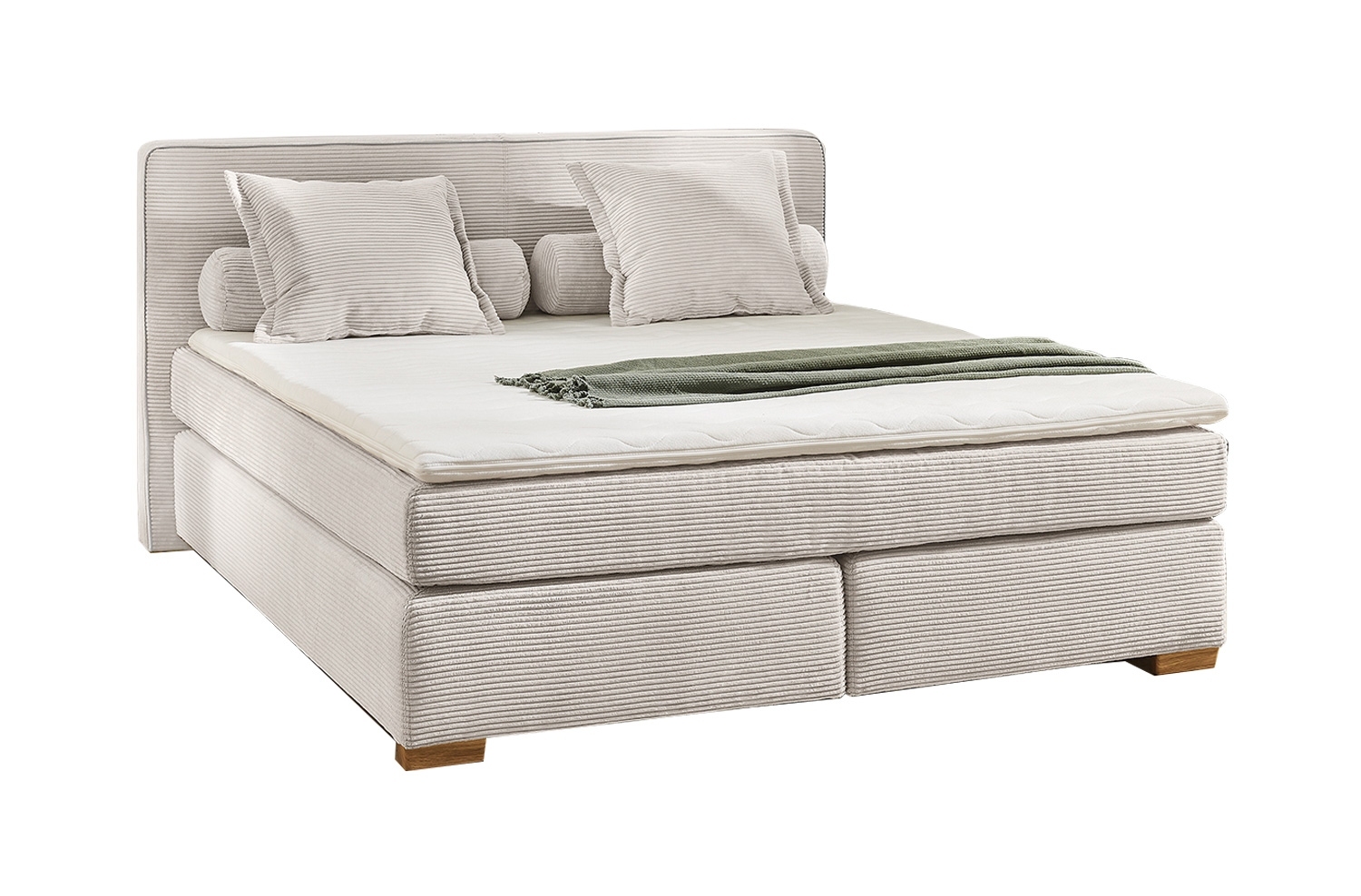 Das Boxspringbett mit Cordbezug in beige hat eine Liegefläche von 180 x 200 cm. Für einen unvergleichlichen Boxspring-Schlafkomfort sorgen die beiden Boxen mit Bonellfederkernen, eine 7-Zonen-Tonnentaschenfederkernnmatratze mit dem Härtegrad 3 und ein Kaltschaumtopper. Der Bezug des Toppers ist leicht abnehmbar und lässt sich bei 60 °C waschen. Die 59 cm Liegehöhe ermöglichen einen bequemen Ein- und Ausstieg.