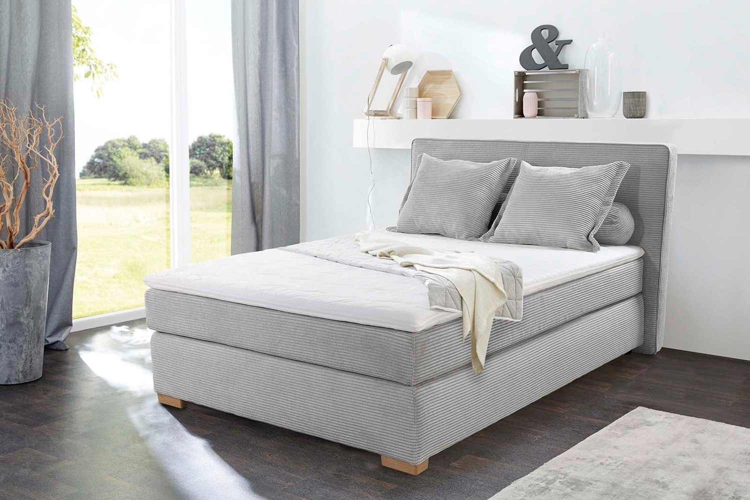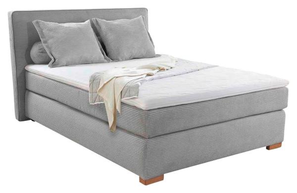 Das Boxspringbett mit Cordbezug in hellgrau hat eine Liegefläche von 140 x 200 cm. Für einen unvergleichlichen Boxspring-Schlafkomfort sorgt die Box mit Bonellfederkernen, eine 7-Zonen-Tonnentaschenfederkernnmatratze mit dem Härtegrad 3 und ein Kaltschaumtopper. Der Bezug des Toppers ist leicht abnehmbar und lässt sich bei 60 °C waschen. Die 55 cm Liegehöhe ermöglichen einen bequemen Ein- und Ausstieg.