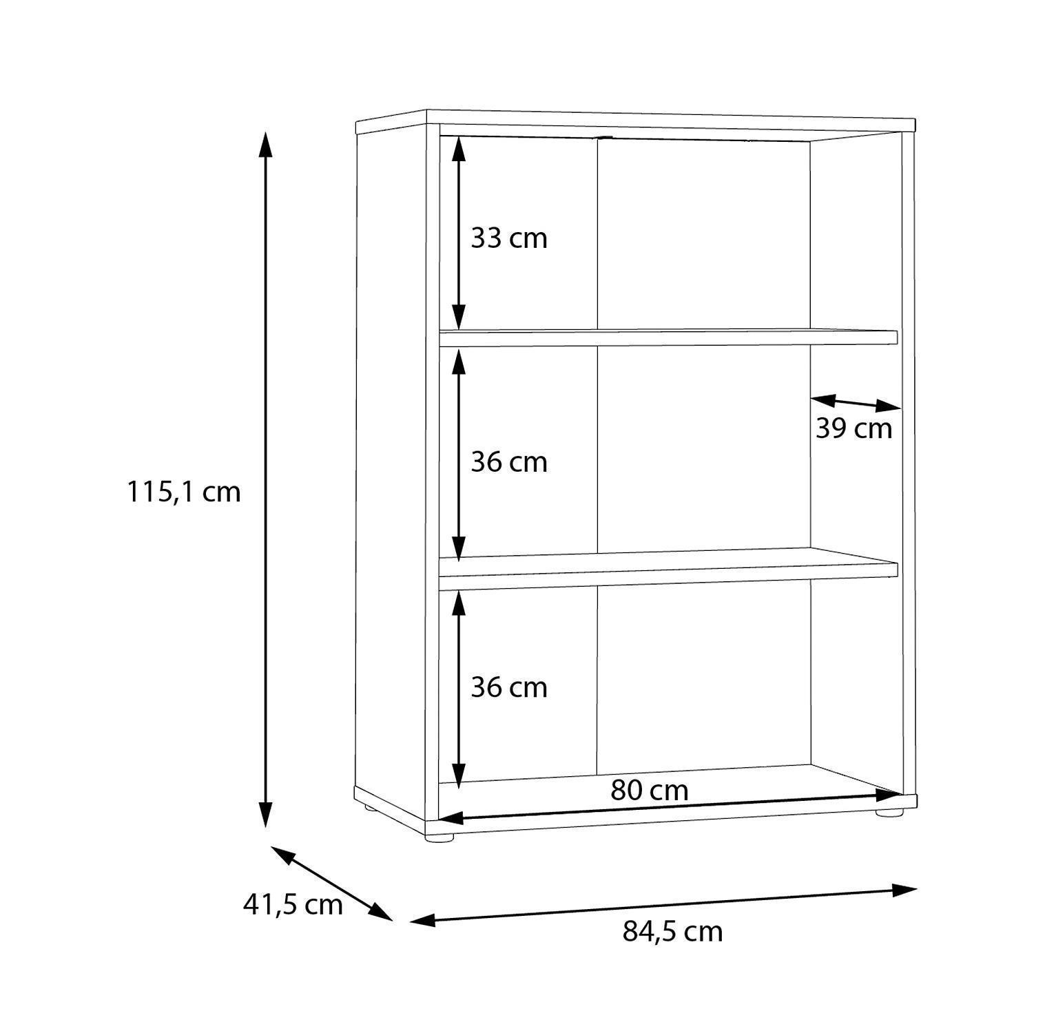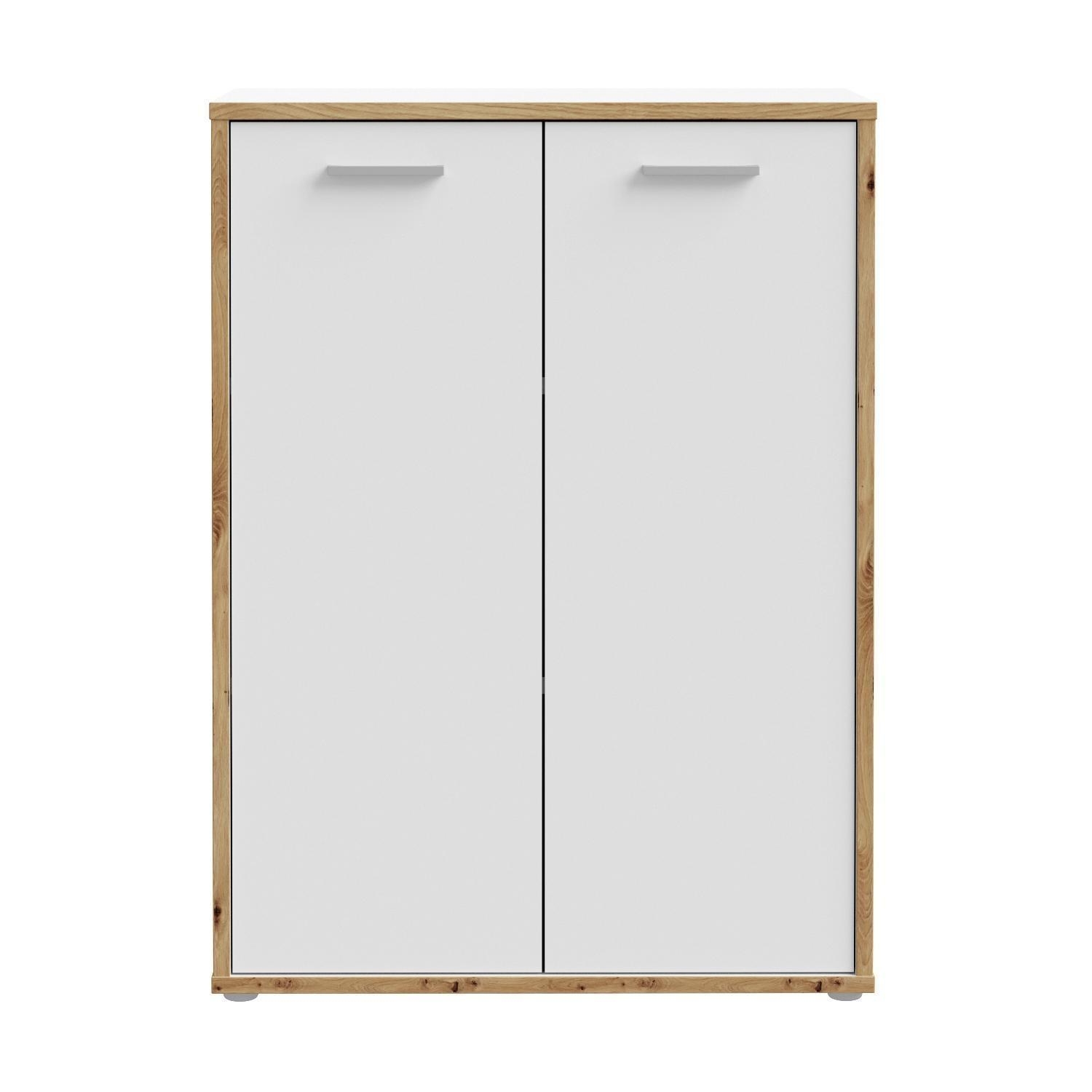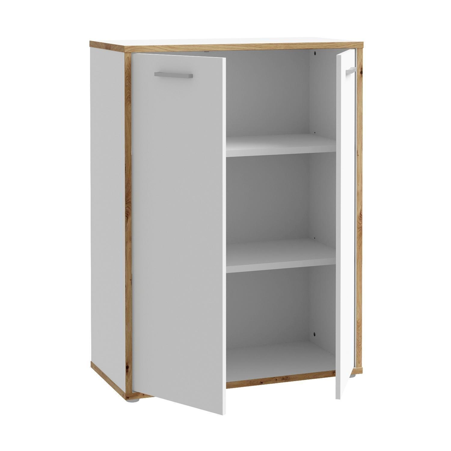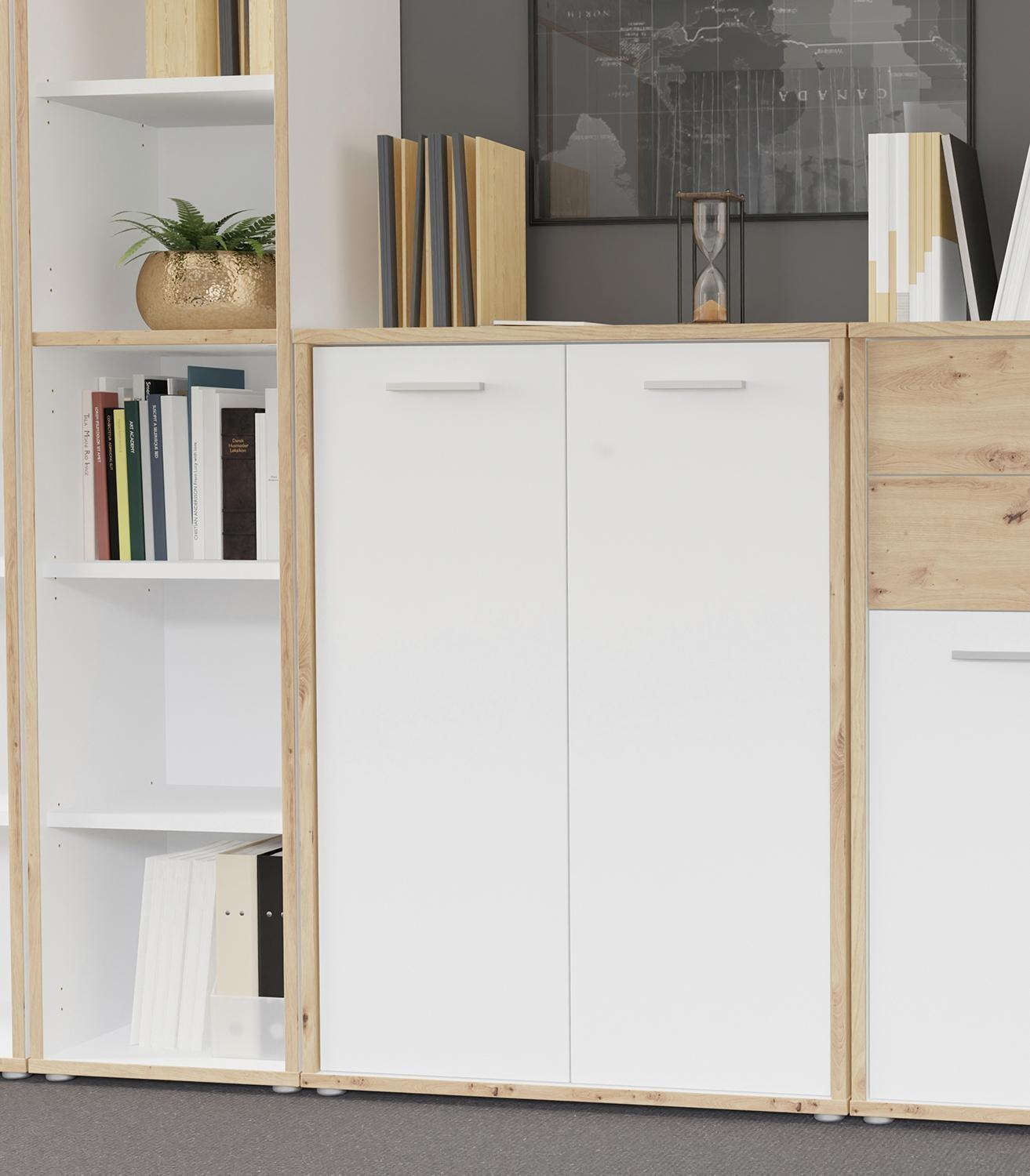 Der Büroschrank KARIN ist in Weiß gehalten und mit Absetzungen in Artisan Eiche Dekor versehen. Er verfügt über zwei Türen, die für eine strukturierte Aufbewahrung sorgen. Im Inneren befinden sich zwei Einlegeböden, die jeweils mit bis zu 15 kg belastet werden können. Der Schrank hat eine Breite von 85 cm, eine Höhe von 115 cm und eine Tiefe von 42 cm.