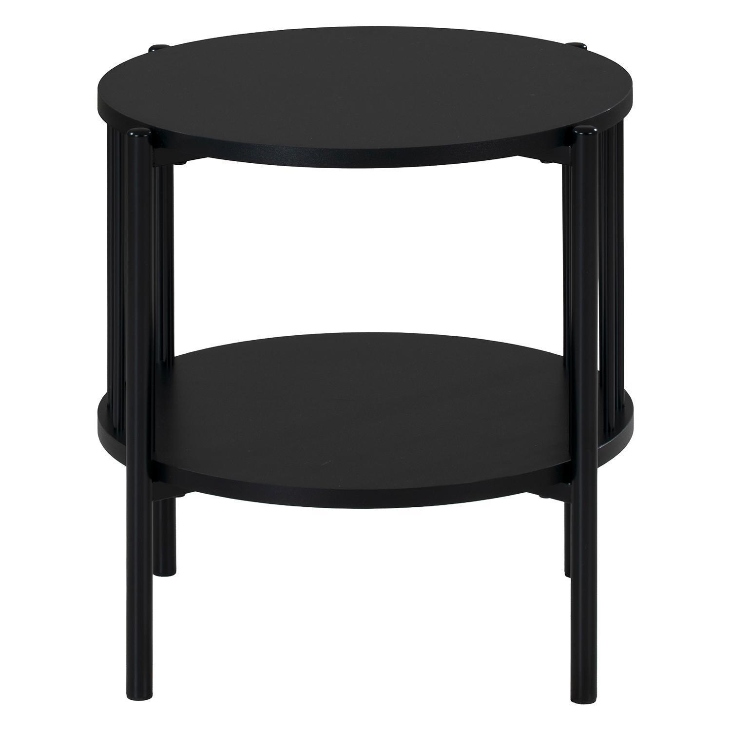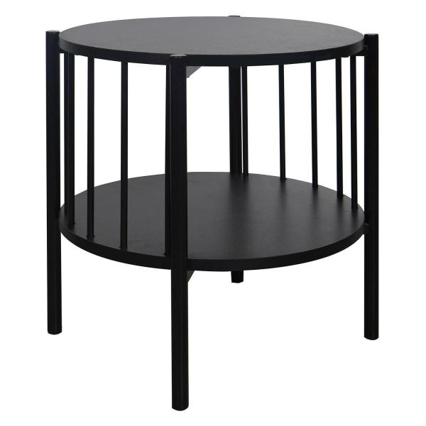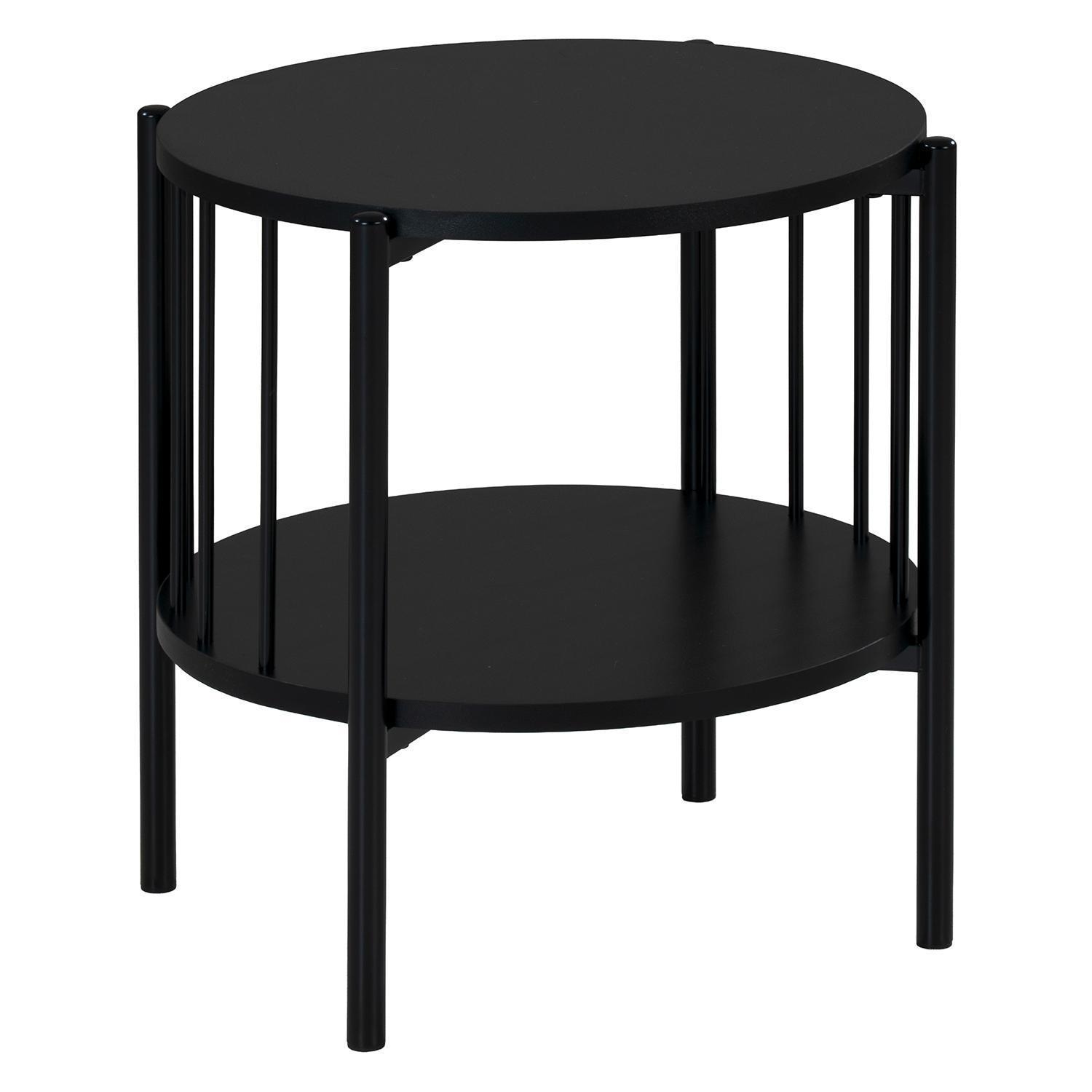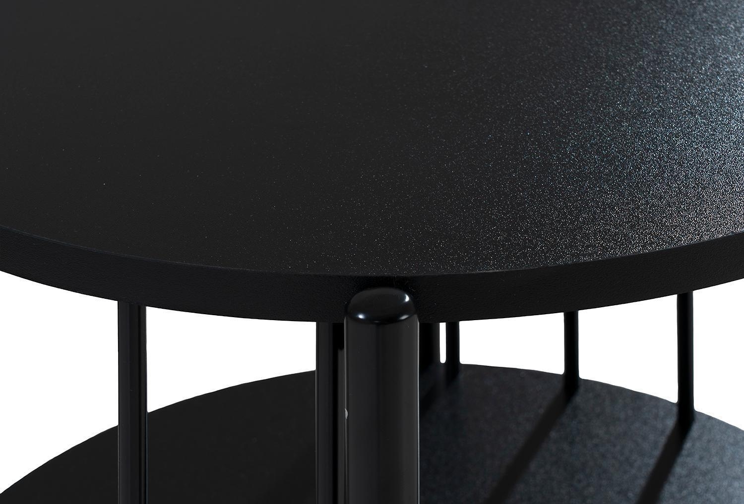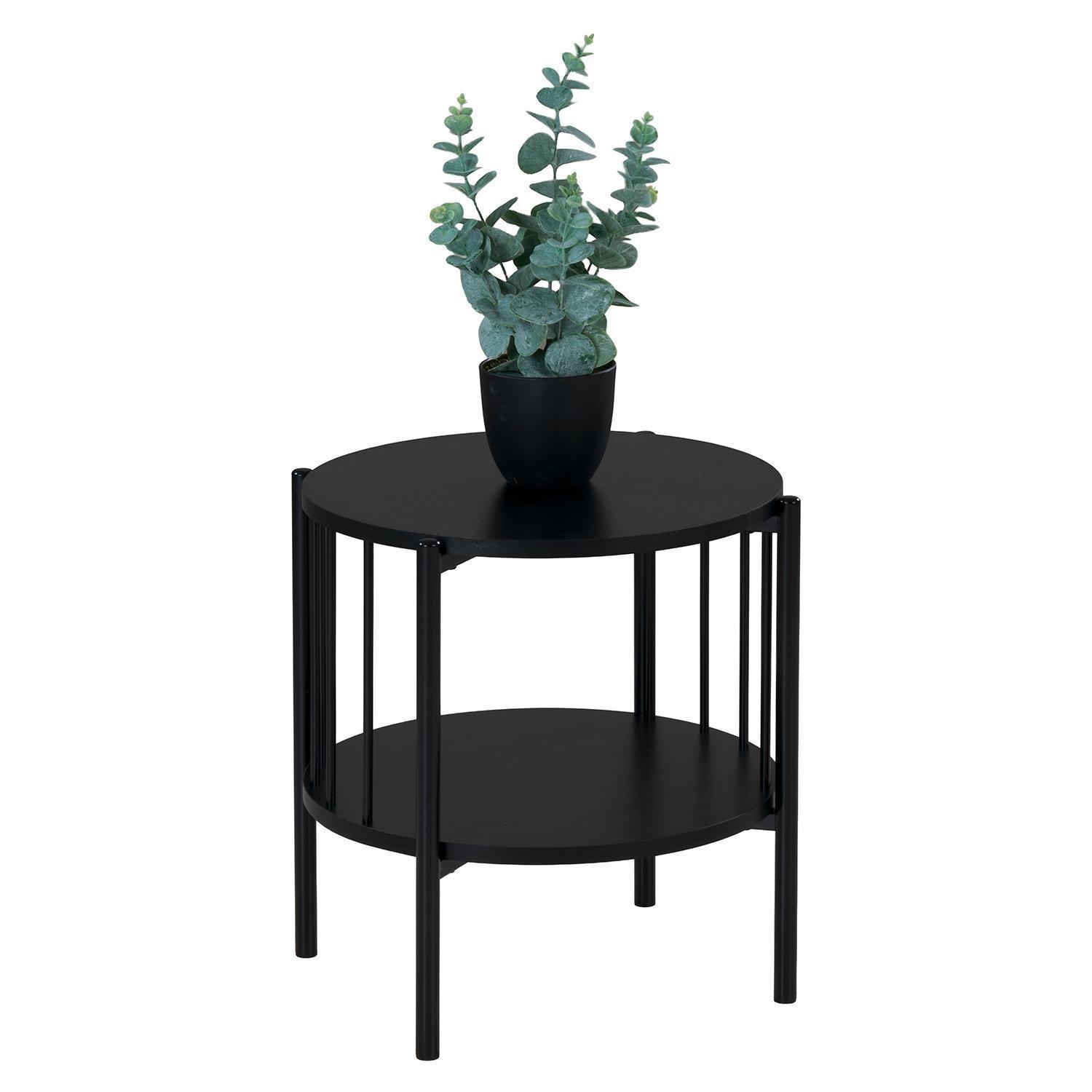 Der Beistelltisch BENEDIKT der Marke casa NOVA ist in Schwarz matt gehalten und verfügt über ein stabiles Gestell aus Metall, ebenfalls in Schwarz. Er ist mit einer zusätzlichen Ablagefläche ausgestattet, die Platz für Gegenstände wie Fernbedienungen und Zeitschriften bietet. Der Tisch hat einen Durchmesser von 44 cm und eine Höhe von 44 cm.