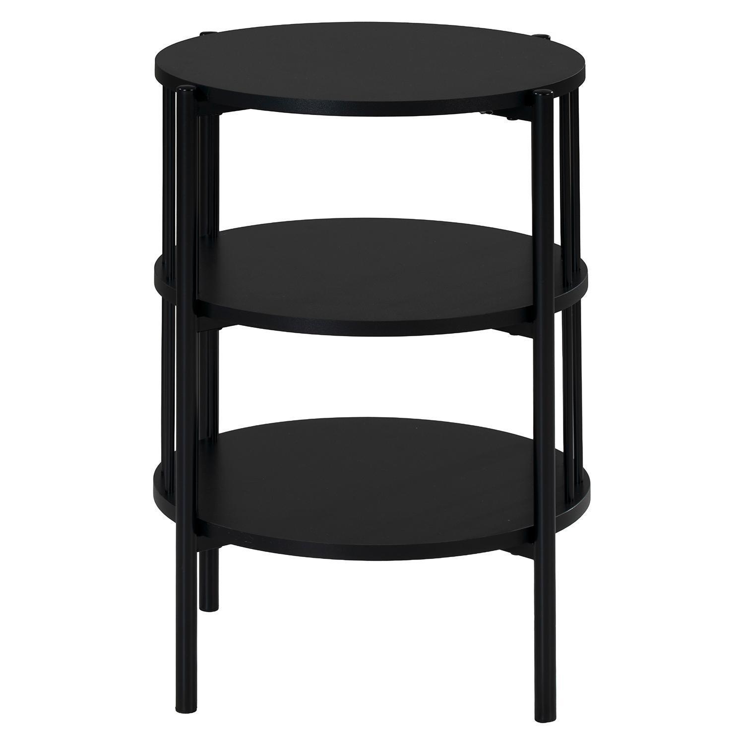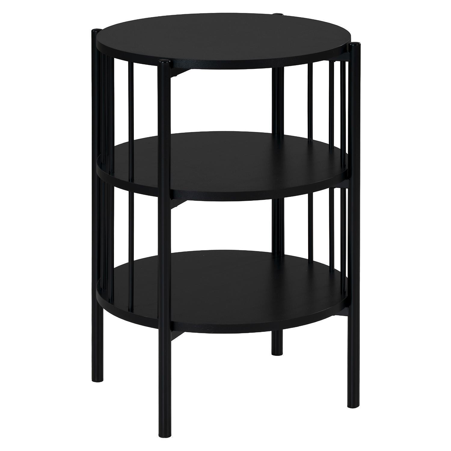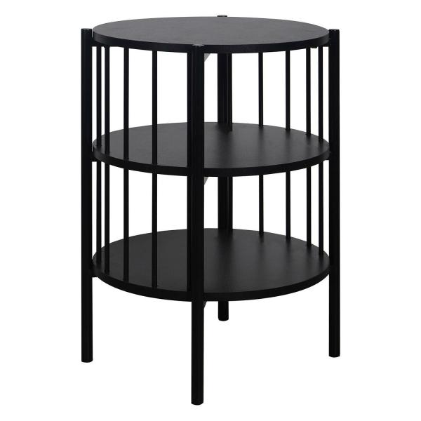 Der Beistelltisch BENEDIKT der Marke casa NOVA ist in Schwarz matt gehalten und verfügt über ein stabiles Gestell aus Metall, ebenfalls in Schwarz. Er ist mit zwei zusätzlichen Ablageflächen ausgestattet, die Platz für Gegenstände wie Fernbedienungen und Zeitschriften bieten. Der Tisch hat einen Durchmesser von 44 cm und eine Höhe von 60 cm.
