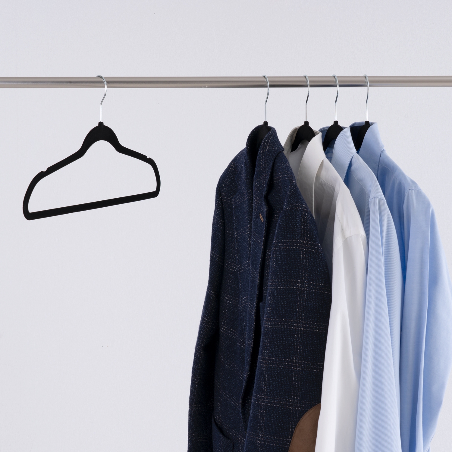 Diese Kleiderbügel bestehen aus robustem Kunststoff und sind mit einem weichen Samtbezug überzogen, der für eine rutschfeste Oberfläche sorgt. Dadurch bleiben Ihre Kleidungsstücke sicher an ihrem Platz und verrutschen nicht. Mit einer Breite von 45 cm bieten diese Bügel ausreichend Platz für eine Vielzahl von Kleidungsstücken, einschließlich Hemden, Blusen, Hosen und Röcken.
