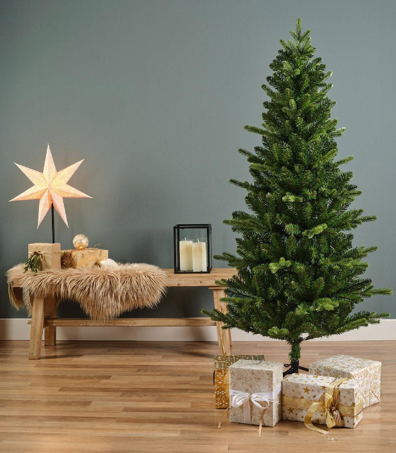 Der künstliche Tannenbaum KILLINGTON von casa NOVA besteht aus grünem Kunststoff und ist mit einem stabilen schwarzen Metallgestell ausgestattet. Mit einer Höhe von 180 cm, einem Durchmesser von 93 cm und 38 Zweigen bietet der Baum eine großzügige und gleichmäßige Struktur. Die 861 Spitzen sind in Echtnadel-Optik gestaltet, während der Baum nadelfrei ist und kein Gießen erfordert. Dadurch ist er pflegeleicht und lässt sich über mehrere Jahre hinweg wiederverwendbar einsetzen. Der Christbaum bringt in vielen Häusern eine besondere winterliche Stimmung.