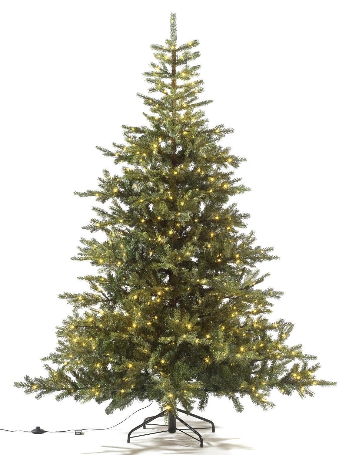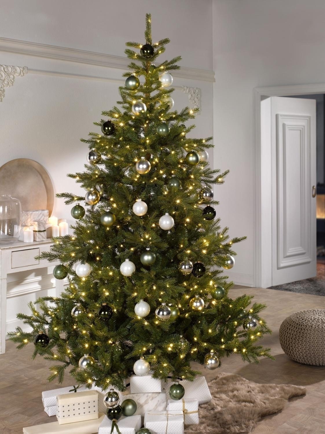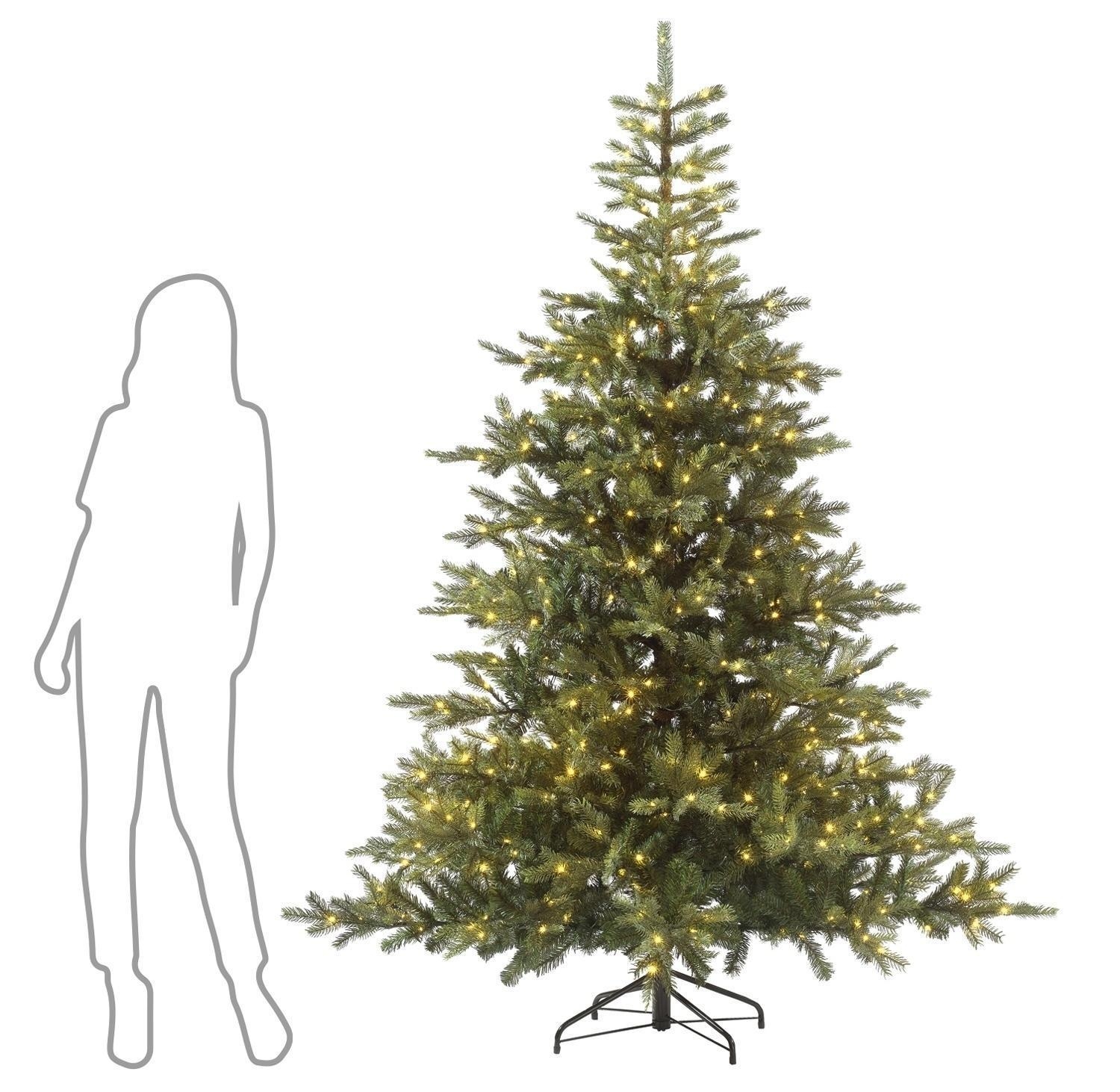 Der künstliche Tannenbaum GRANDIS von casa NOVA bringt weihnachtliche Stimmung ins Haus. Gefertigt aus grünem Kunststoff mit einem Standfuß aus Metall in schwarz, beeindruckt er durch seine Tannennadeln in Echtnadeloptik und die 550 warmweißen LEDs, die für stimmungsvolle Beleuchtung sorgen. Der Baum ist nadelfrei und muss nicht gegossen werden, was ihn besonders pflegeleicht macht. Mit einem Durchmesser von 150 cm und einer Höhe von 210 cm bietet er eine imposante Erscheinung. Das 500 cm lange Kabel mit Fußschalter ermöglicht eine bequeme Bedienung. Die Micro-LEDs haben 8 Funktionen und sind in einem Abstand von je 25 cm angeordnet. Insgesamt verfügt der Baum über 82 Zweige. Ein Christbaum bringt in jeder Umgebung eine besondere, festliche Stimmung.