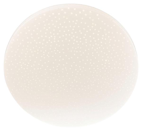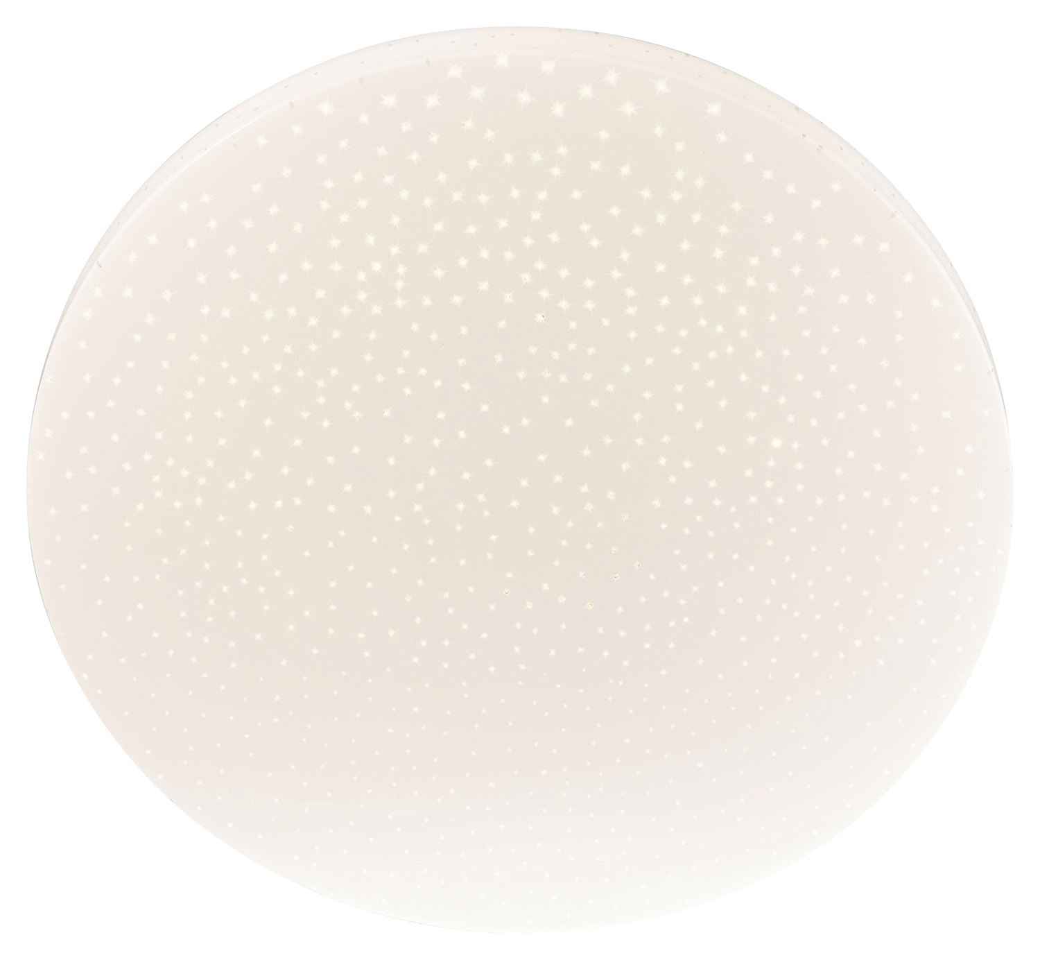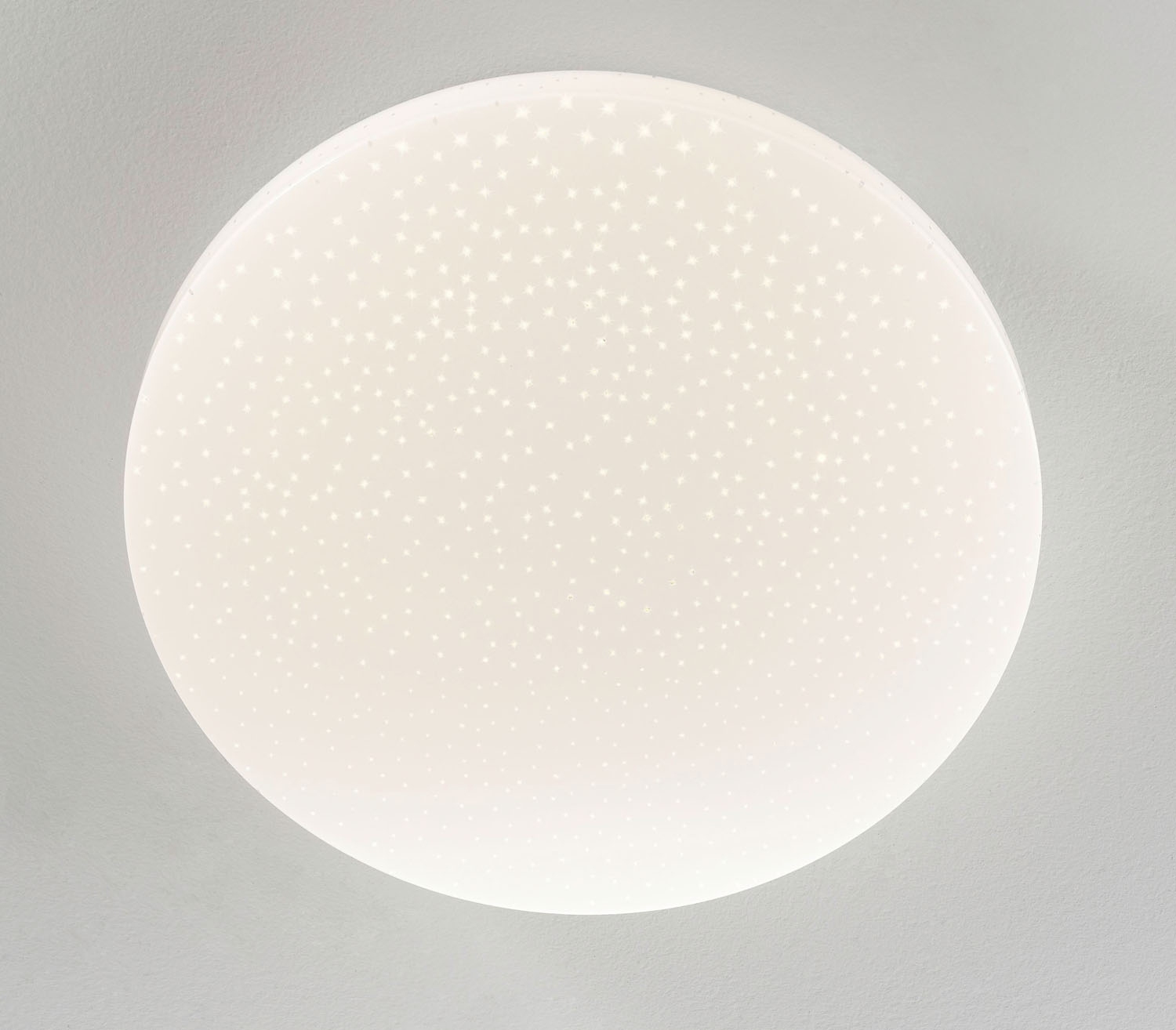 Die weiße Deckenleuchte mit integriertem LED-Leuchtmittel präsentiert sich mit einem Durchmesser von 26 cm und einer Höhe von 5,5 cm. Das Gestell aus Eisen und der Kunststoffschirm verleihen der Leuchte eine moderne Ästhetik. Mit 12 Watt Leistung erzeugt das feste LED-Leuchtmittel ein warmes Licht von 3000 K und beeindruckende 1200 lm Helligkeit. Die Deckenleuchte bietet die Funktion eines Sternenhimmels, wodurch eine besondere Atmosphäre geschaffen wird. Die Schutzart IP44 ermöglicht den Einsatz in feuchten Umgebungen.