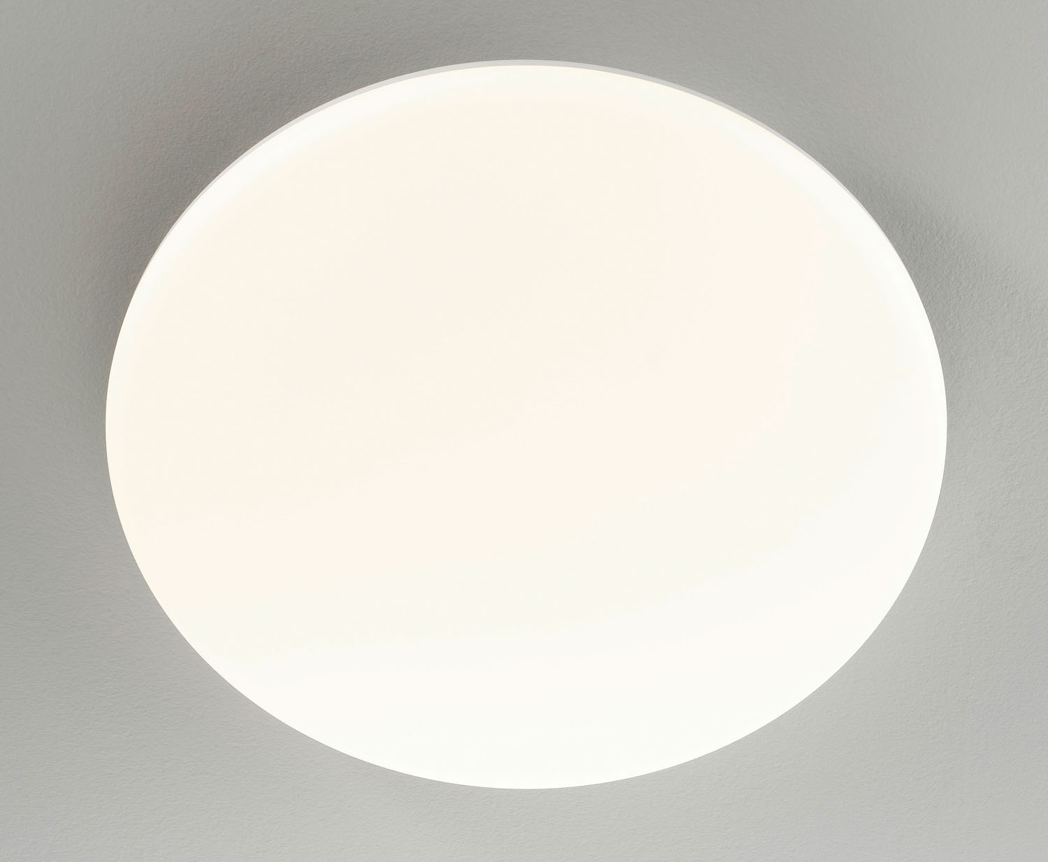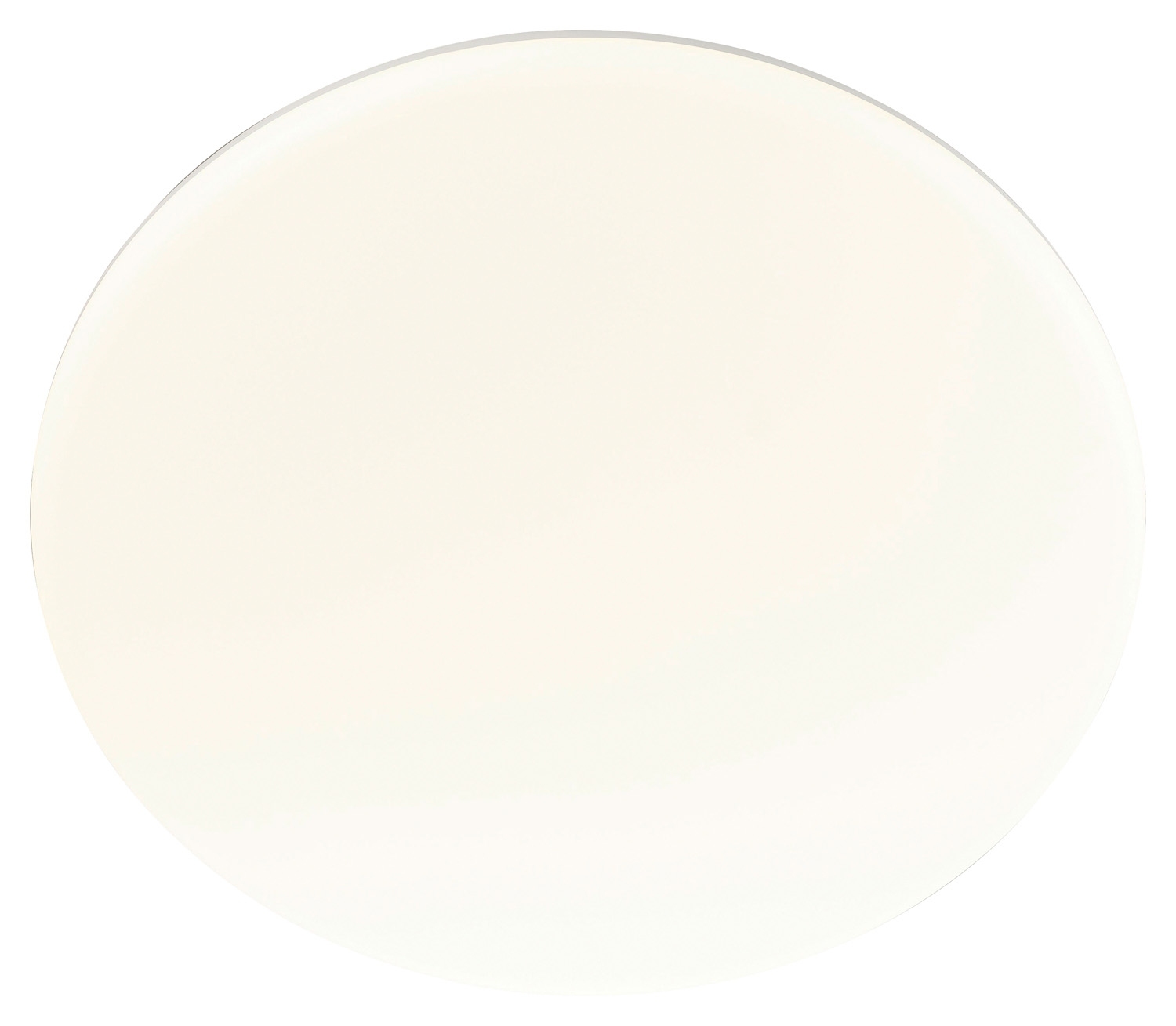 Die weiße Deckenleuchte mit integriertem LED-Leuchtmittel verfügt über einen Durchmesser von 35 cm und einer flachen Höhe von 4,7 cm. Das Metallgestell und der Kunststoffschirm verleihen der Leuchte ein modernes Erscheinungsbild. Mit 36 Watt Leistung erzeugt das fest verbaute LED-Leuchtmittel ein angenehmes Licht von 4000 K und beeindruckende 3600 lm Helligkeit. Die Schutzart IP54 macht die Deckenleuchte für den Außenbereich geeignet.