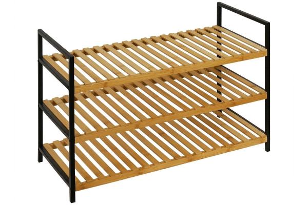 Das Schuhregal ULFINA der Marke casa NOVA besteht aus schwarzem Metall und verfügt über drei Ablageflächen aus braunem Bambus. Es bietet Platz für insgesamt 12 Paar Schuhe. Die Maße des Regals betragen 70 cm in der Breite, 49 cm in der Höhe und 30 cm in der Tiefe.