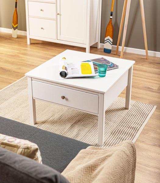 Der Couchtisch CHERRY ist in Weiß ausgeführt und besteht aus massivem Kiefernholz. Die Oberfläche ist lackiert. Der Tisch ist mit einer Schublade ausgestattet. Er hat eine Breite von 70 cm, eine Höhe von 47 cm und eine Tiefe von 70 cm.