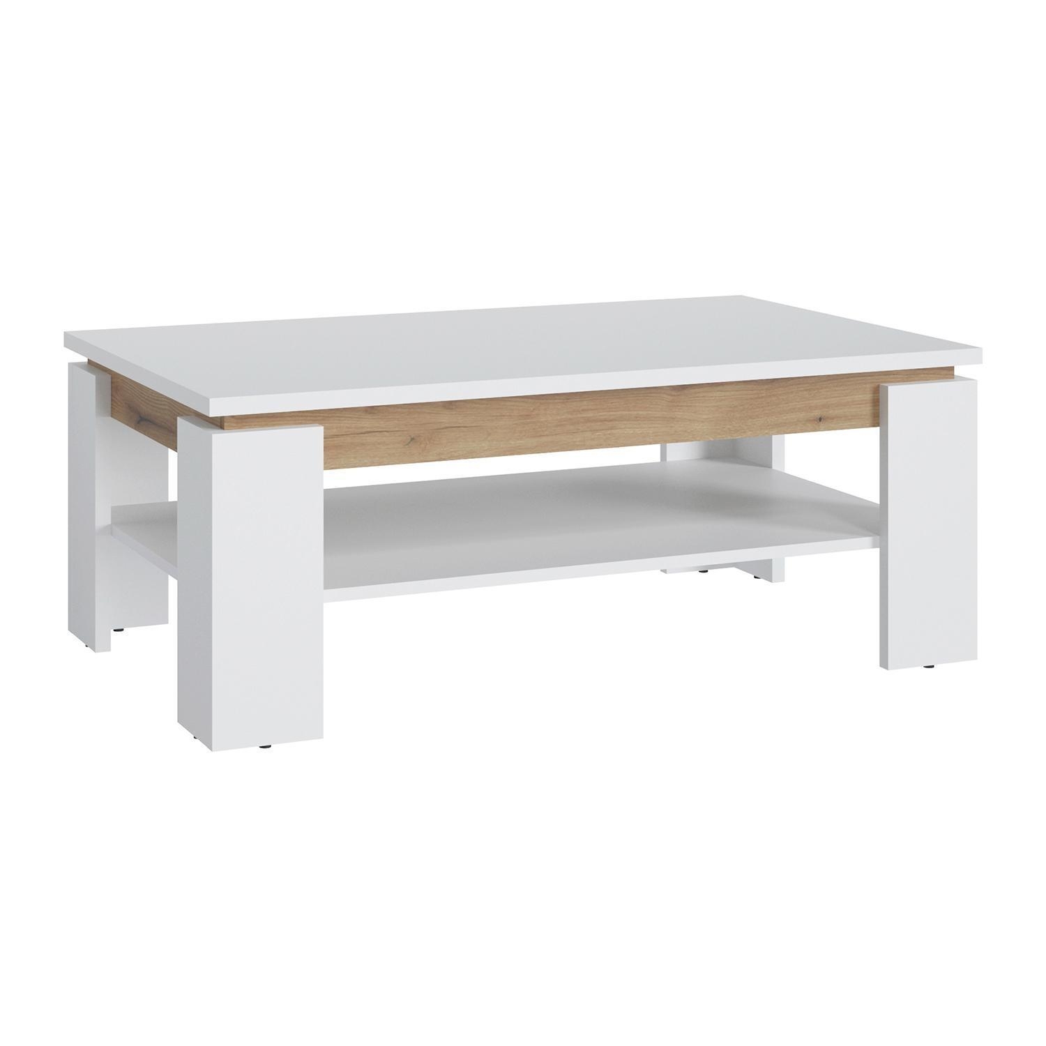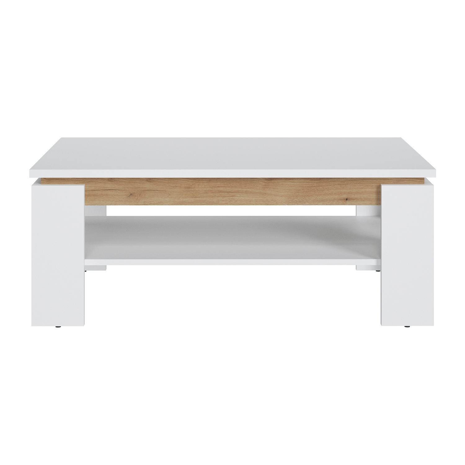 Der Couchtisch CLARA ist in Alpinweiß ausgeführt und verfügt über Absetzungen in Evoke Eiche Dekor. Er ist mit einer zusätzlichen Ablagefläche ausgestattet. Die Abmessungen des Tisches betragen 110 cm in der Breite, 43 cm in der Höhe und 67 cm in der Tiefe.