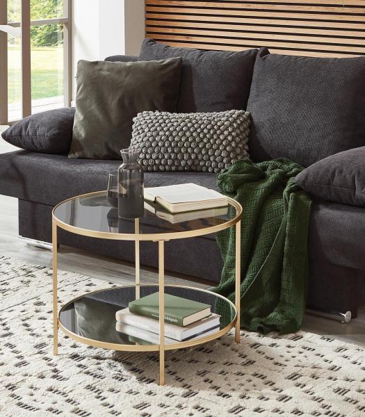 Der Couchtisch PETULA verfügt über eine Tischplatte aus transparentem Klarglas und ein Gestell aus Metall in Goldgelb. Zusätzlich ist der Tisch mit einer Ablageplatte aus Spiegelglas ausgestattet. Sowohl die Tischplatte als auch die Ablageplatte sind jeweils mit bis zu maximal 5 kg belastbar. Der Couchtisch hat einen Durchmesser von 60 cm und eine Höhe von 45 cm.