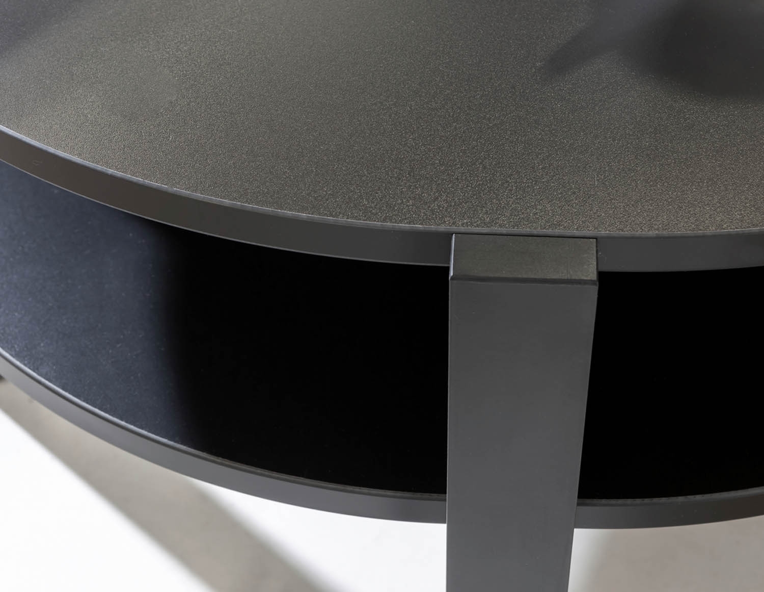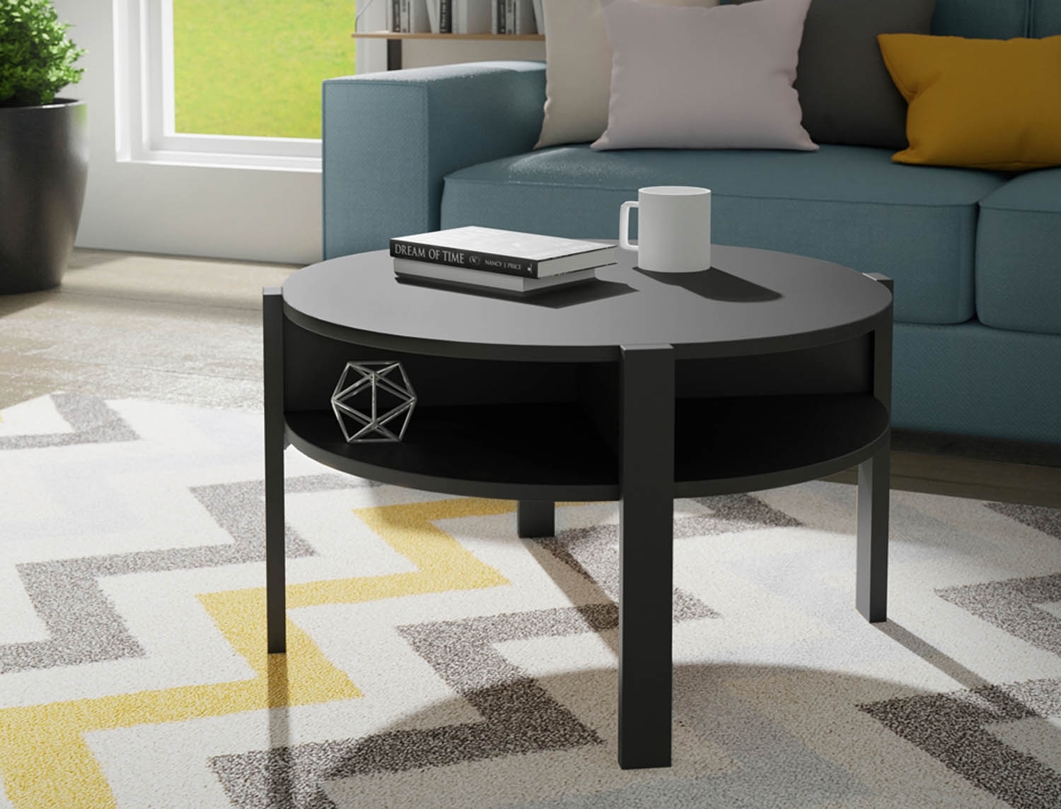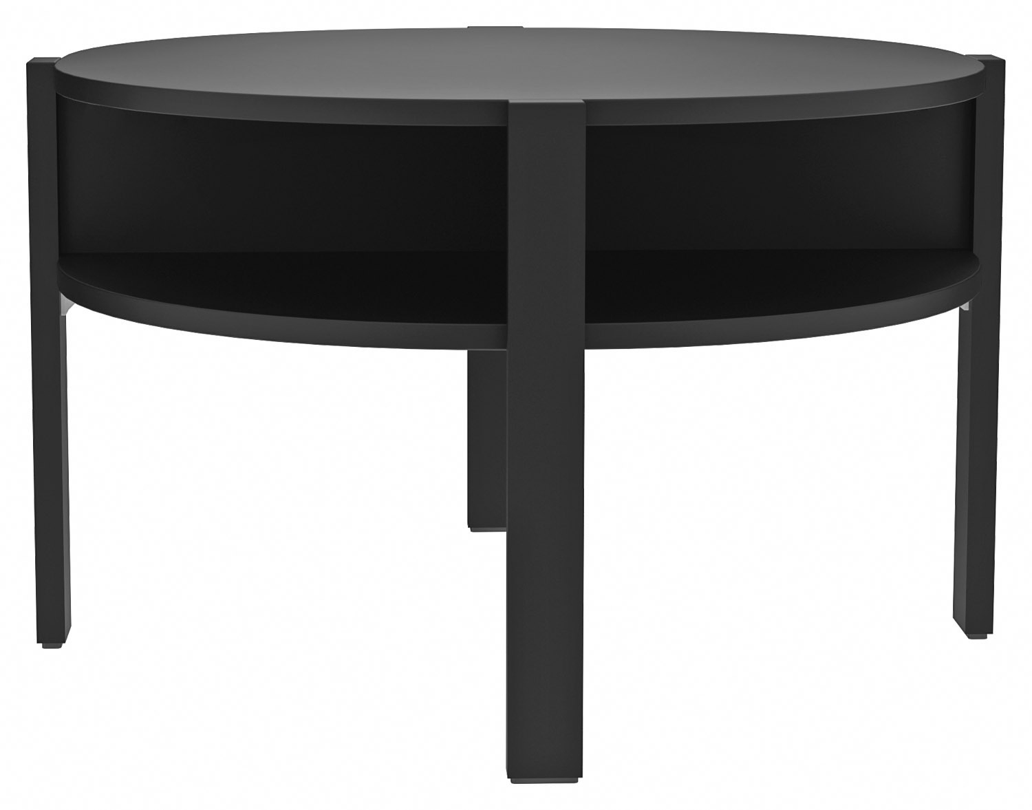 Der Couchtisch bereichert Ihr Wohnzimmer mit zeitlosem Design und praktischer Funktionalität. Im Lieferumfang enthalten ist ein Tisch mit einem Durchmesser von 75 cm und einer Höhe von 45,5 cm. Die Tischplatte besteht aus Holzwerkstoff, während auch das Gestell aus Holzwerkstoff gefertigt ist. Das Dekor in Schwarz matt verleiht dem Tisch eine ansprechende Optik. Als besonderes Extra verfügt der Couchtisch über Ablageflächen, die zusätzlichen Stauraum bieten und die Funktionalität des Möbelstücks erhöhen.