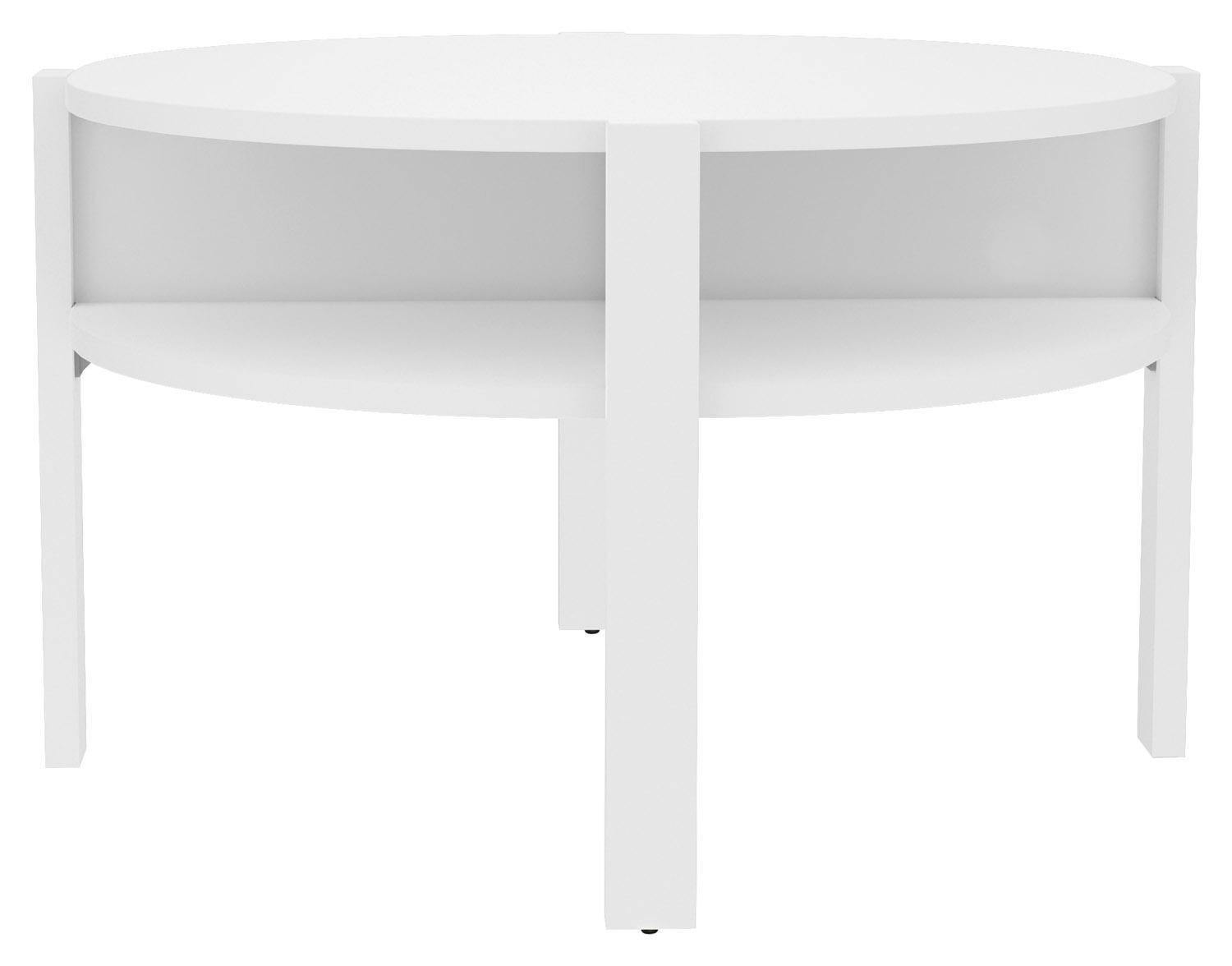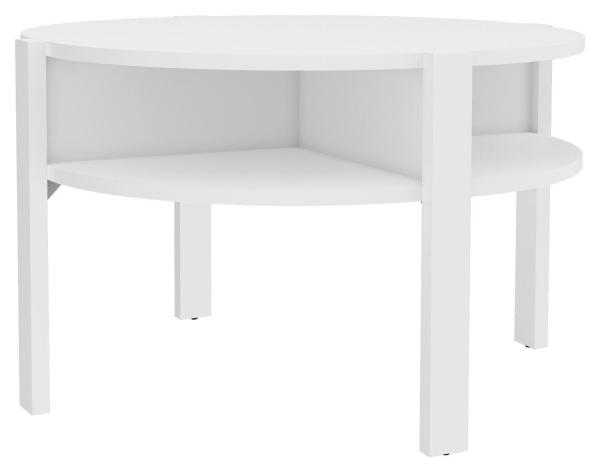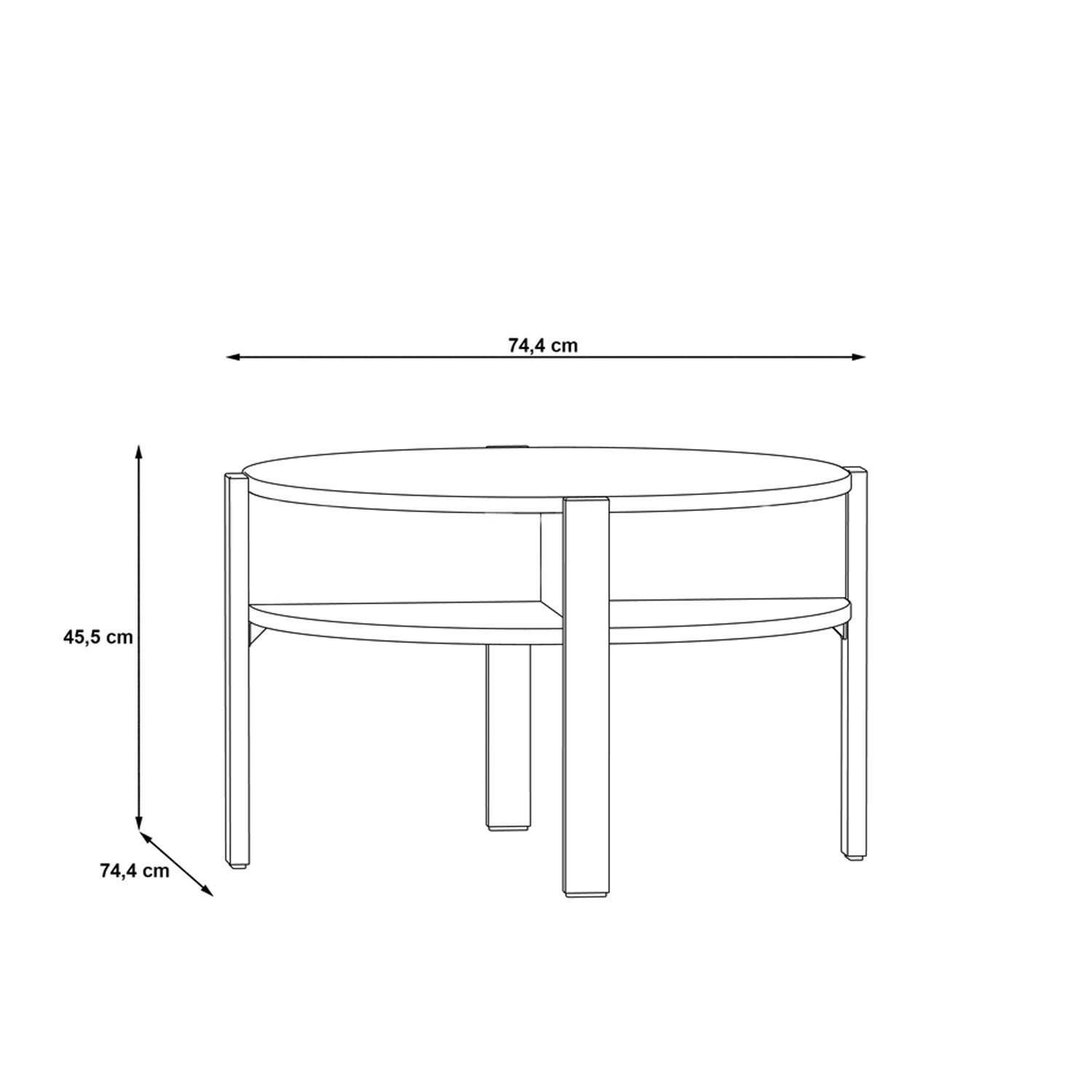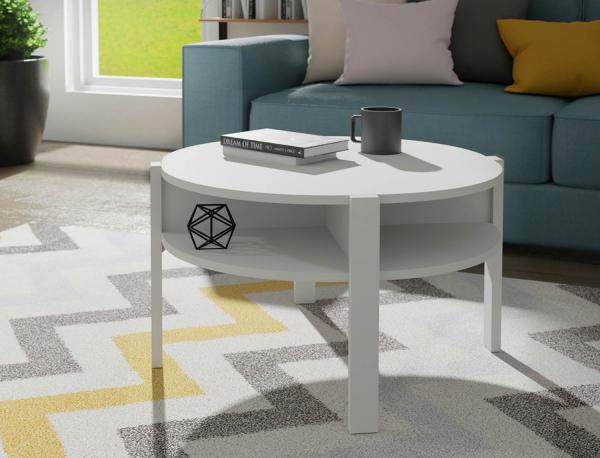 Der Couchtisch bereichert Ihr Wohnzimmer mit zeitlosem Design und praktischer Funktionalität. Im Lieferumfang enthalten ist ein Tisch mit einem Durchmesser von 75 cm und einer Höhe von 45,5 cm. Die Tischplatte besteht aus Holzwerkstoff, während auch das Gestell aus Holzwerkstoff gefertigt ist. Das Dekor in Weiß matt verleiht dem Tisch eine ansprechende Optik. Als besonderes Extra verfügt der Couchtisch über Ablageflächen, die zusätzlichen Stauraum bieten und die Funktionalität des Möbelstücks erhöhen.