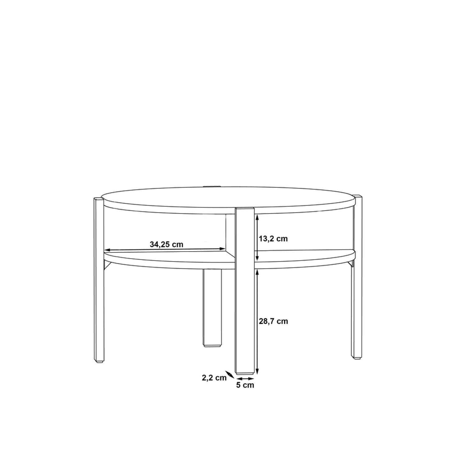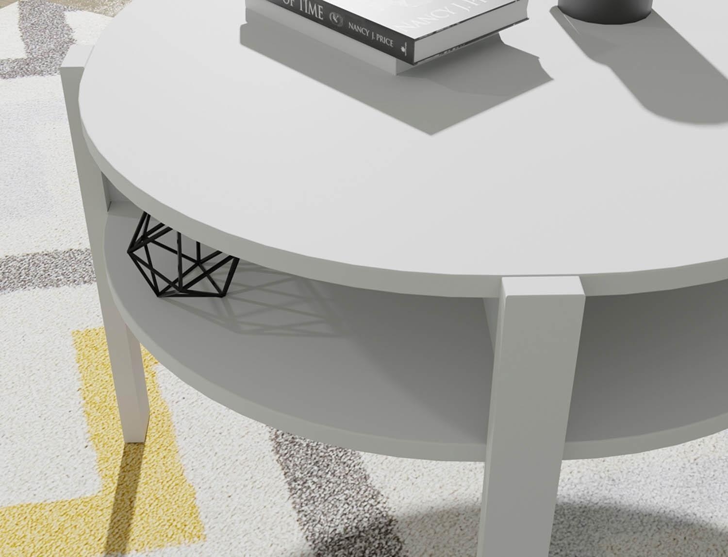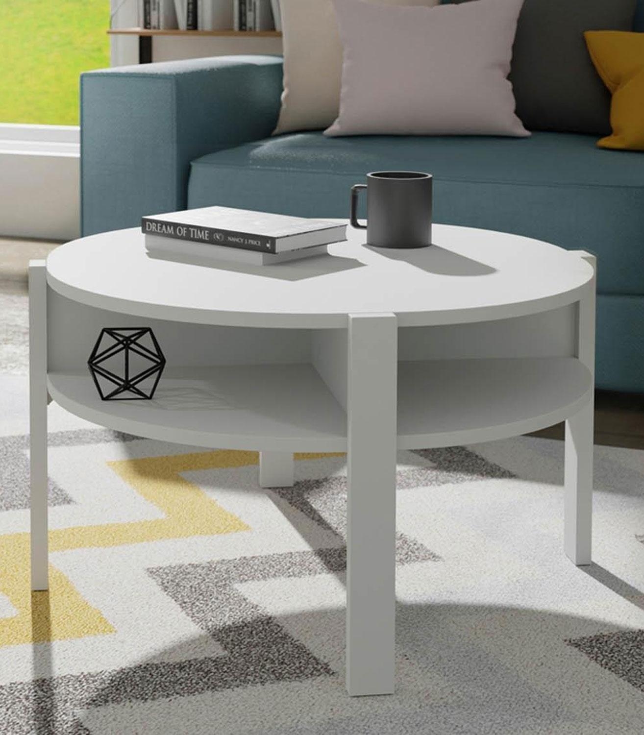 Der Couchtisch bereichert Ihr Wohnzimmer mit zeitlosem Design und praktischer Funktionalität. Im Lieferumfang enthalten ist ein Tisch mit einem Durchmesser von 75 cm und einer Höhe von 45,5 cm. Die Tischplatte besteht aus Holzwerkstoff, während auch das Gestell aus Holzwerkstoff gefertigt ist. Das Dekor in Weiß matt verleiht dem Tisch eine ansprechende Optik. Als besonderes Extra verfügt der Couchtisch über Ablageflächen, die zusätzlichen Stauraum bieten und die Funktionalität des Möbelstücks erhöhen.