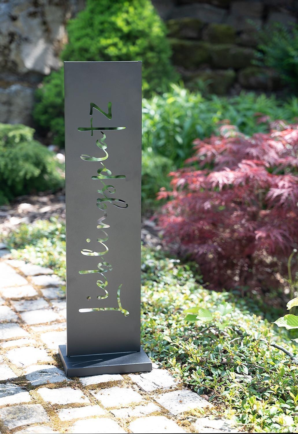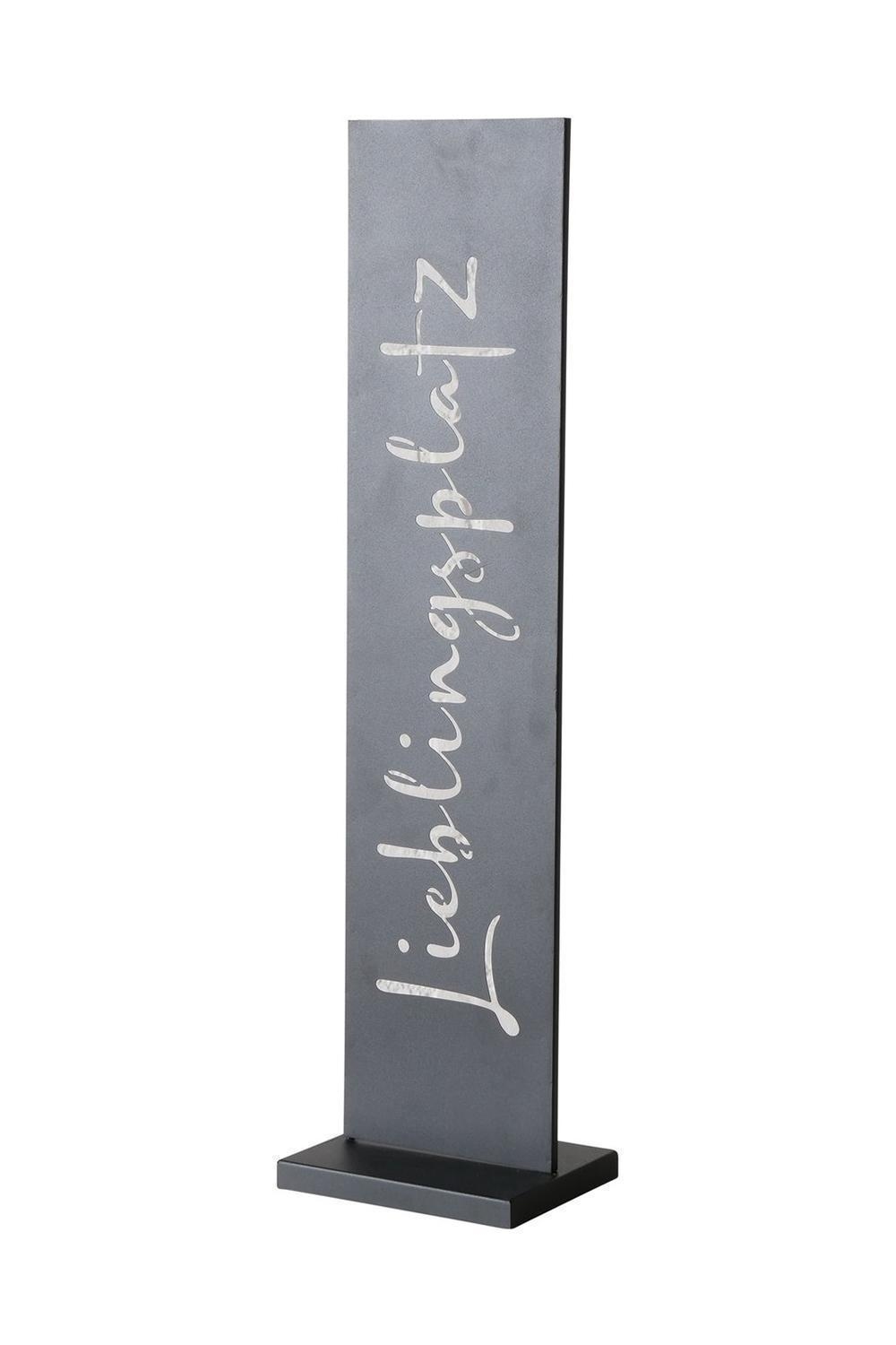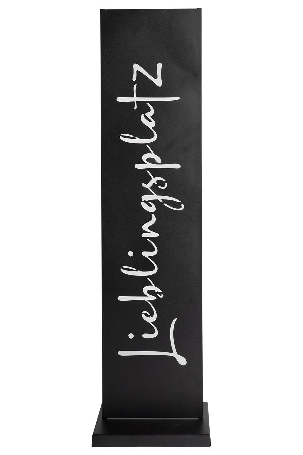 Der Deko-Aufsteller CARTELLO bringt mit seinem stilvollen „Lieblingsplatz“-Schriftzug Charme in Ihren Eingangsbereich. Gefertigt aus pulverbeschichtetem Metall in Schwarz, ist es wetterfest und für den Außenbereich geeignet. Mit einer Größe von 20 x 77 cm und sicherem Stand durch den 20 x 15 cm Sockel ist er eine robuste und einladende Dekoration für Ihr Zuhause.