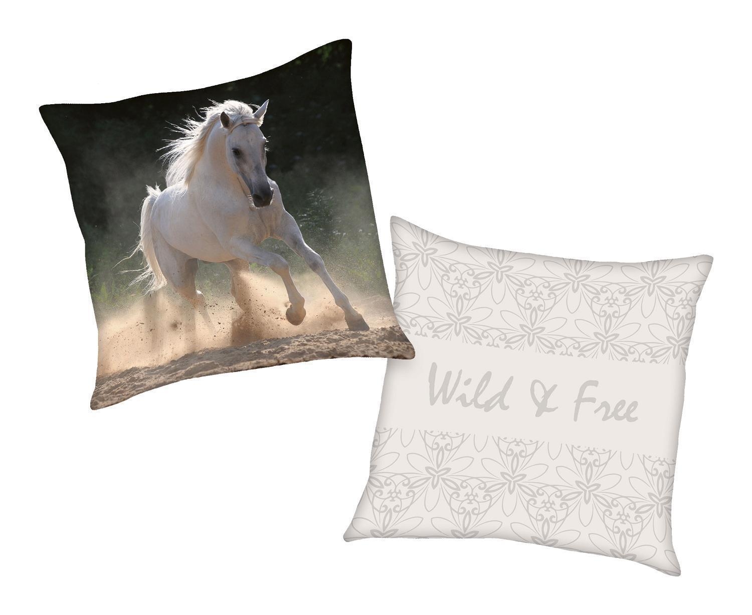 AKIRA bringt mit seinem Pferdemotiv frischen Charme in Ihr Zuhause. Die Vorderseite zeigt ein realistisches Fotomotiv, die Rückseite ist schlicht weiß gehalten. Mit einer Größe von 40 x 40 cm und einer weichen Polyesterfüllung bietet das Kissen angenehmen Komfort auf Sofa, Bett oder Sessel.
