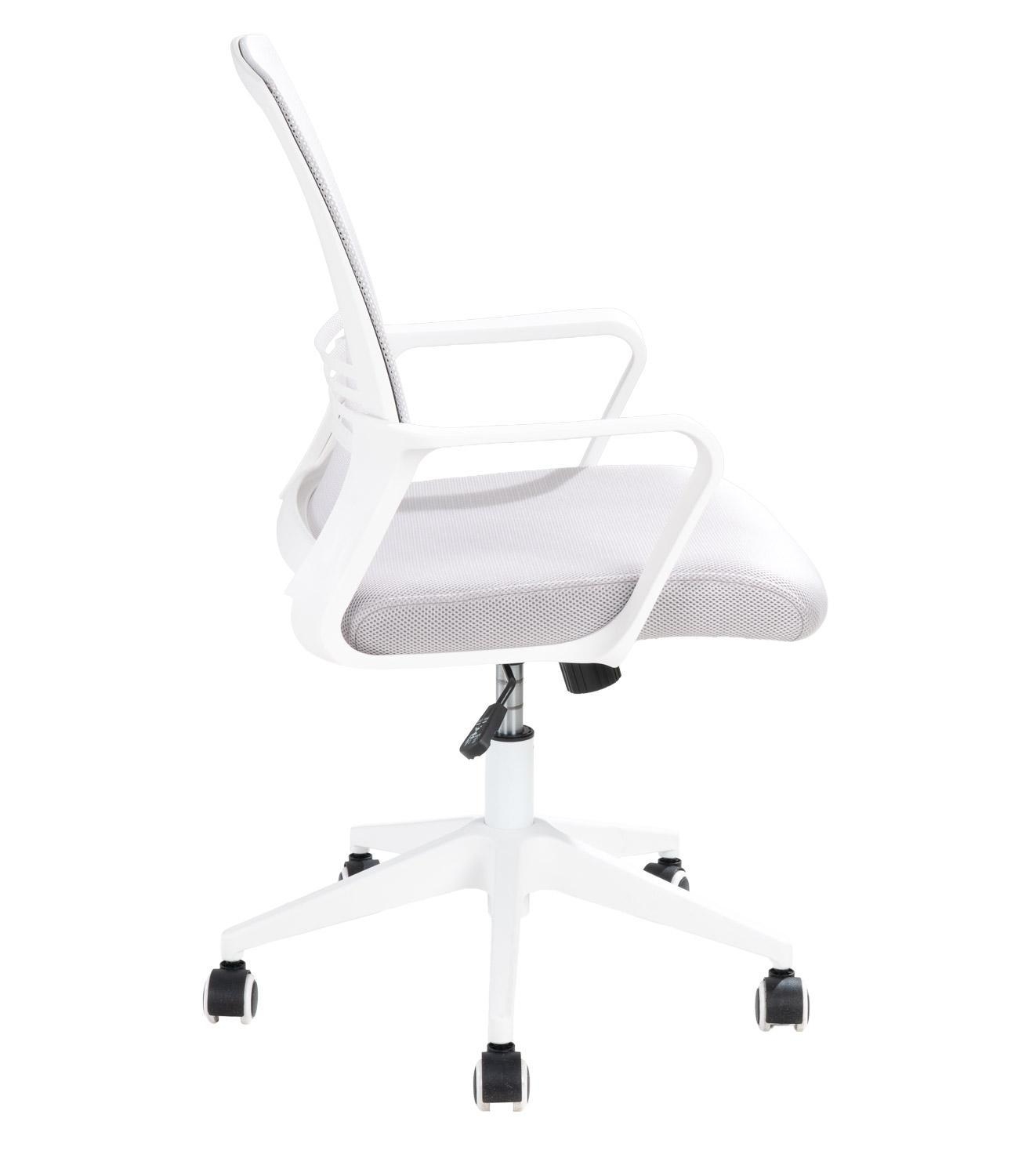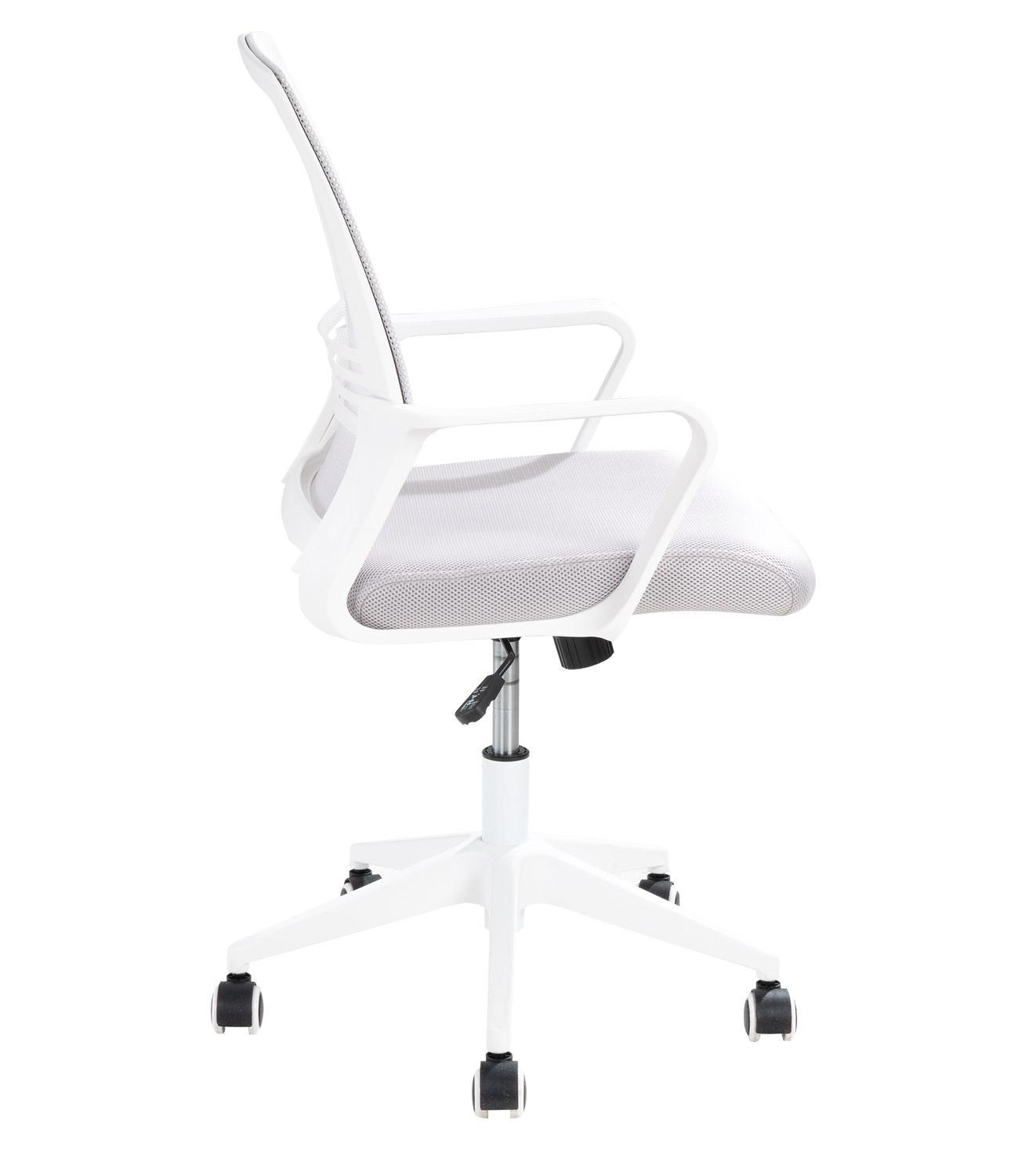 Der Drehstuhl JONAS verfügt über einen hellgrauen Stoffbezug sowie eine Rückenlehne mit atmungsaktivem Meshbezug im selben Farbton. Während das Gestell und die festen Armlehnen aus weißem Kunststoff gefertigt sind, ist das Möbelstück technisch mit einer arretierbaren Synchronmechanik ausgestattet. Mit der Synchronmechanik lässt sich die Sitz- und Rückenlehnenneigung zeitgleich verstellen. Über einen Hebel lässt sich die gewünschte Position fixieren. Die maximale Belastbarkeit beläuft sich auf 120 kg. Für die Verwendung auf festen Untergründen ist der Stuhl mit gebremsten Rollen versehen. Die Maße umfassen eine Breite von 58 cm, eine Höhe von 102 cm sowie eine Tiefe von 56 cm.