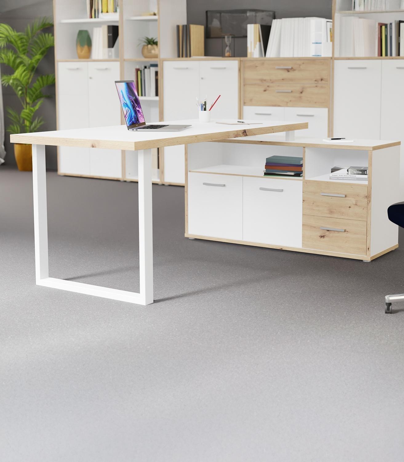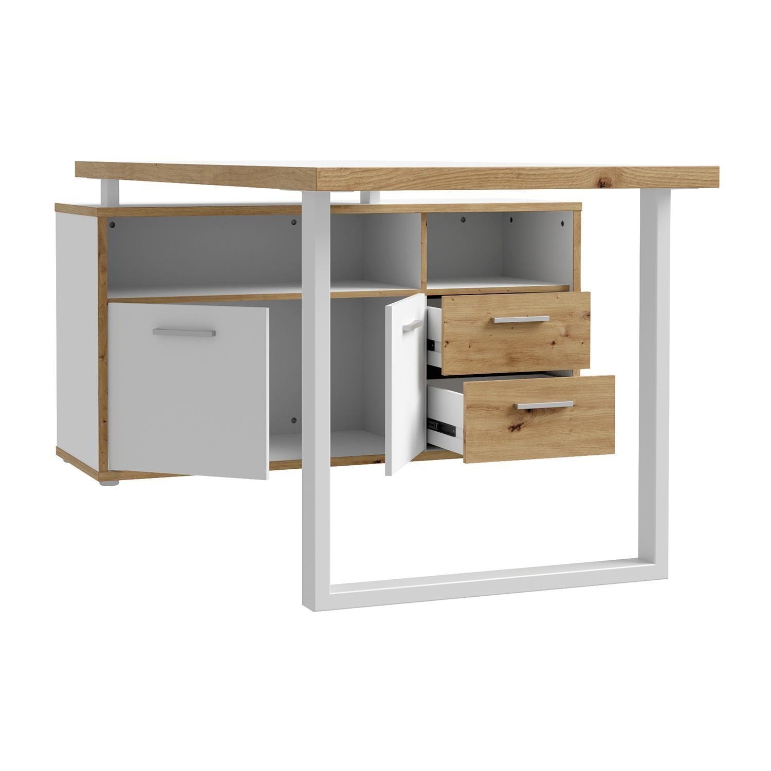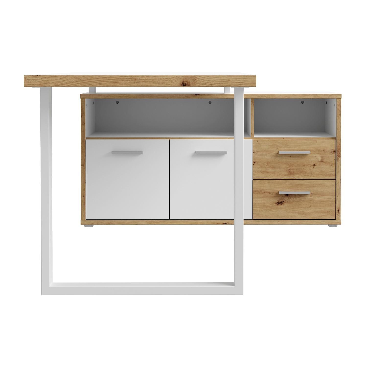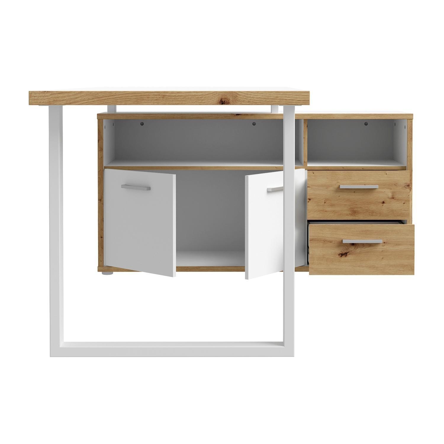 Der Eckschreibtisch KARIN ist in Weiß gehalten und mit Absetzungen in Artisan Eiche Dekor ausgestattet. Das Gestell besteht aus weiß lackiertem Metall und sorgt für Stabilität. Der Schreibtisch verfügt über zwei Türen, zwei Schubladen und zwei offene Fächer, die zusätzlichen Stauraum bieten. Die Maße betragen 182 cm in der Breite, 74 cm in der Höhe und 125 cm in der Tiefe.