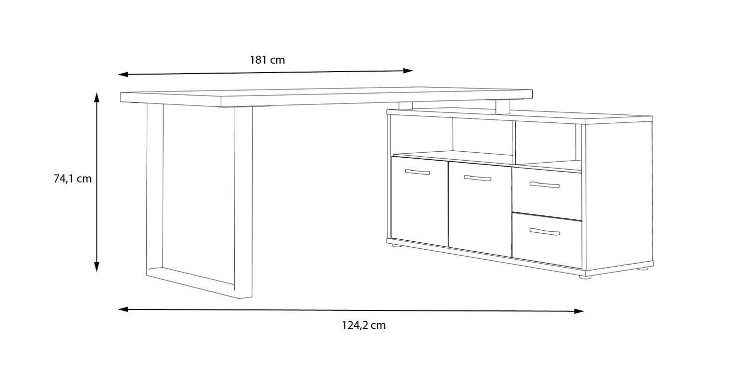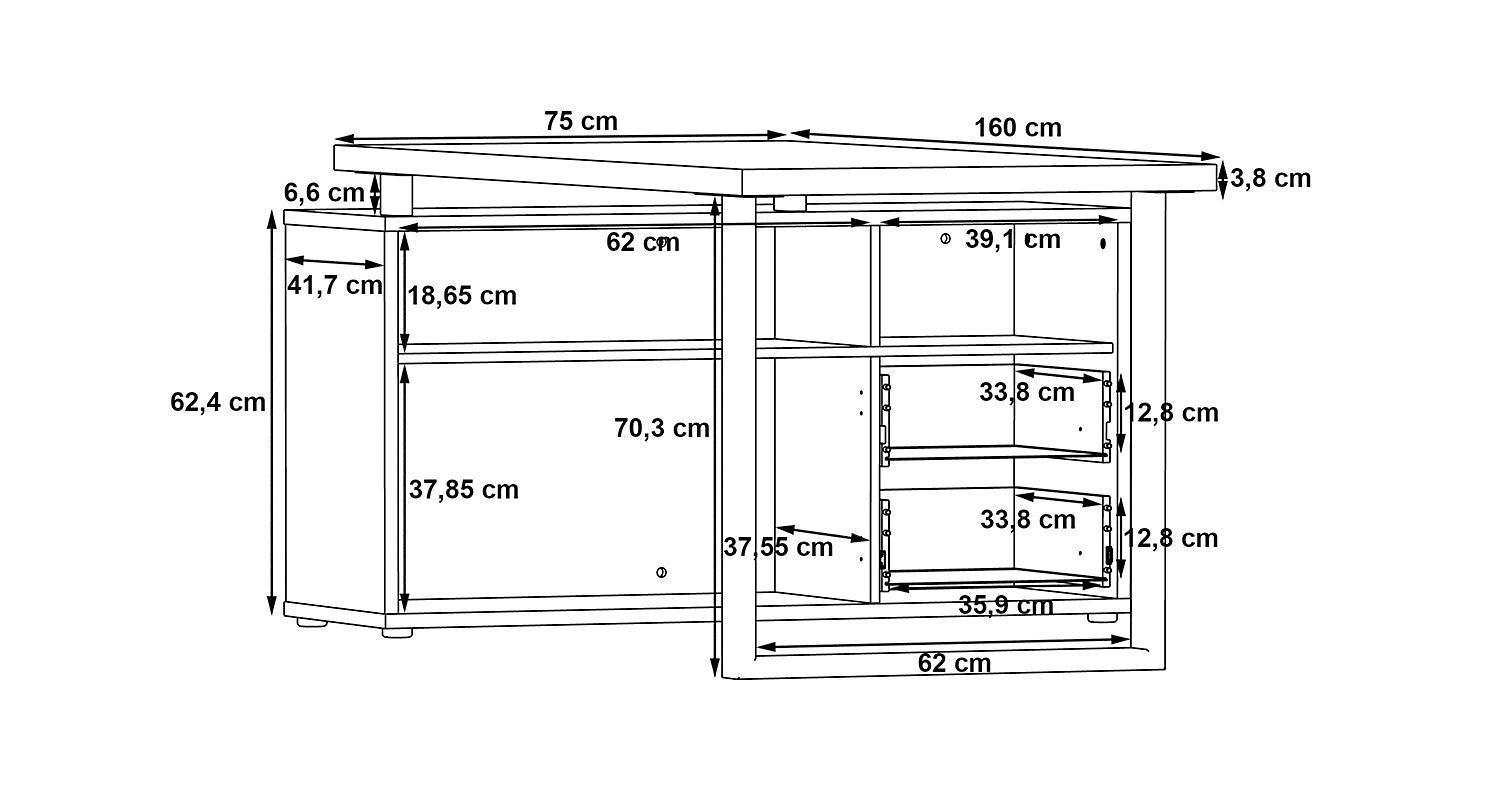 | Lieferumfang: | 1 Eckschreibtisch mit 2 Türen, 2 Schubladen und 2 offenen Ablagefächern |