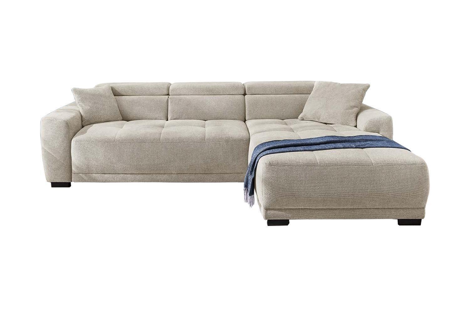 | Lieferumfang: | 1 Ecksofa mit beidseitig montierbarer Ottomane, 3 Kopfteilverstellungen, elektrischer Sitztiefenverstellung und 2 Zierkissen |