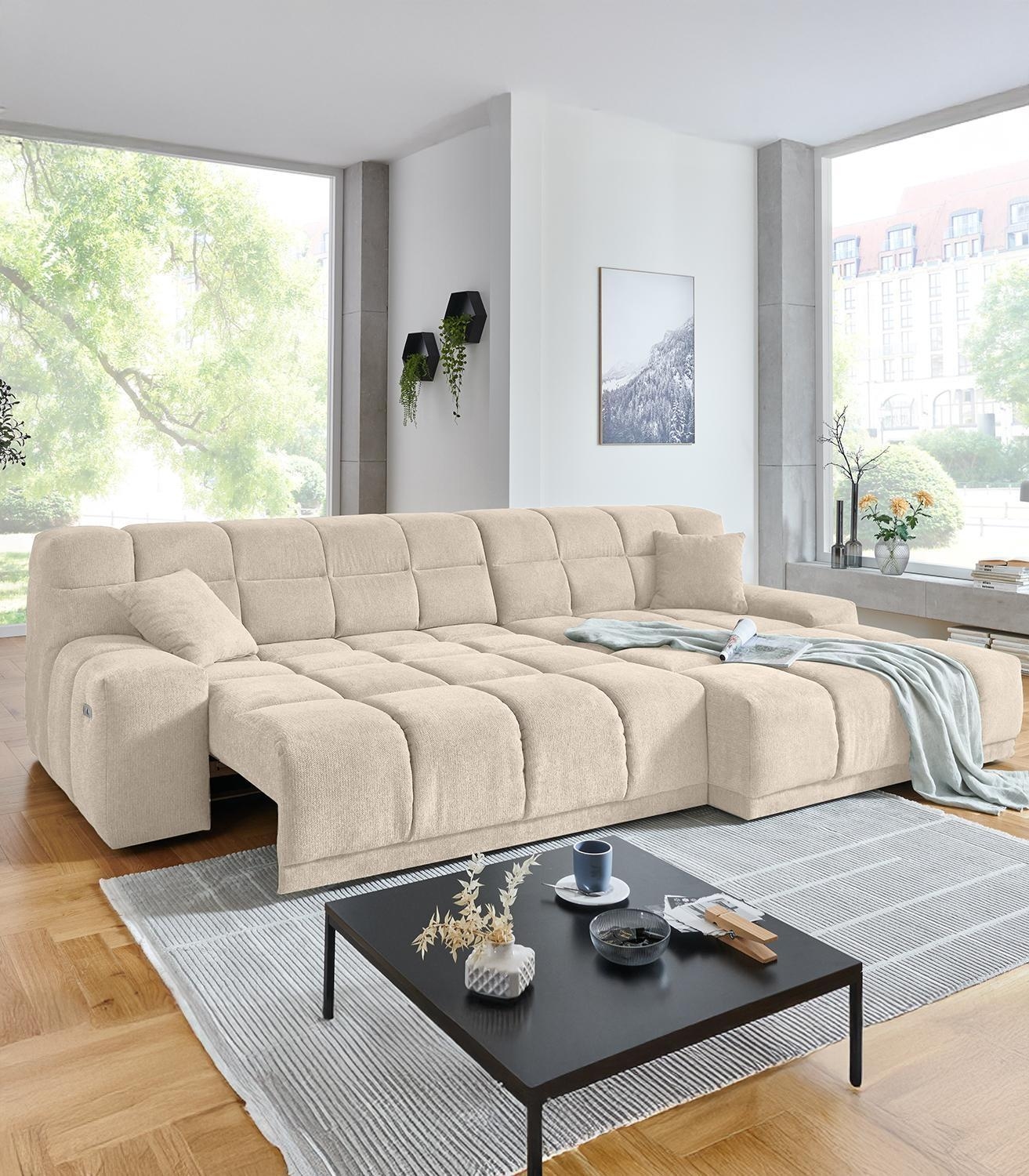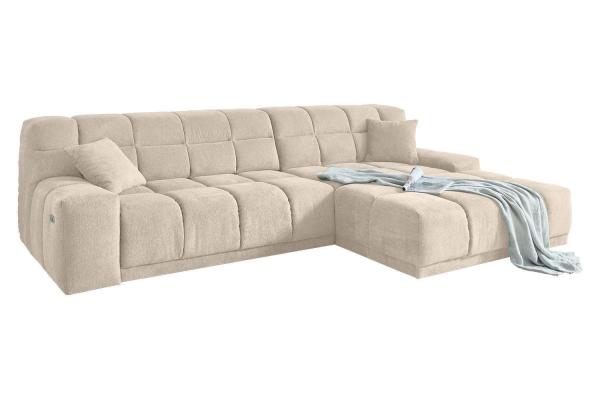 | Lieferumfang: | 1 Ecksofa mit linksseitig montierbarer Ottomane, elektrischer Sitztiefenverstellung und 2 Zierkissen |